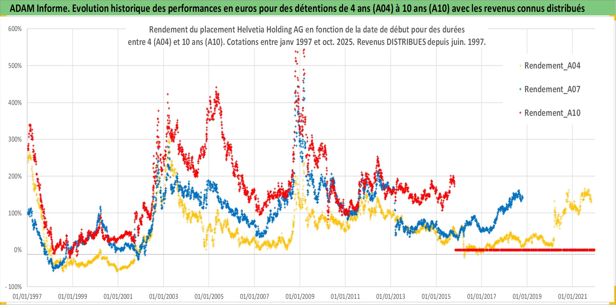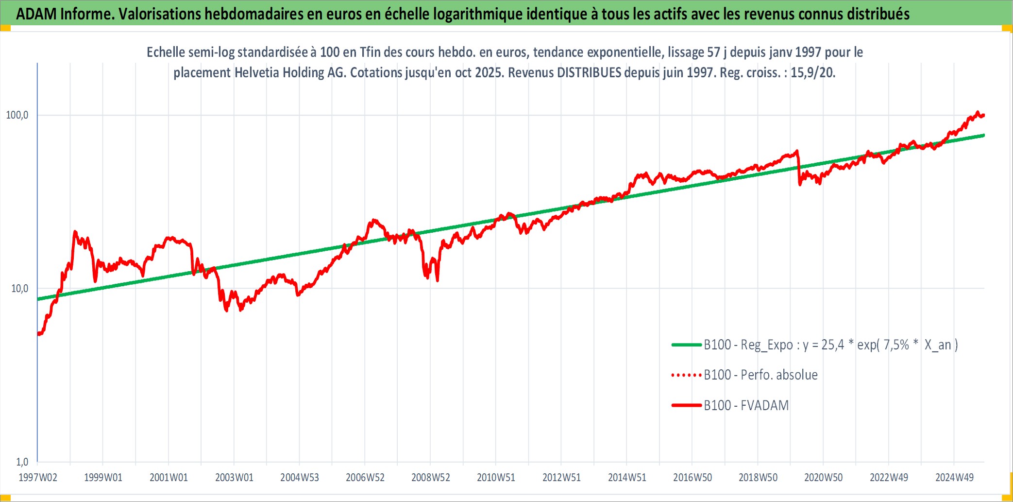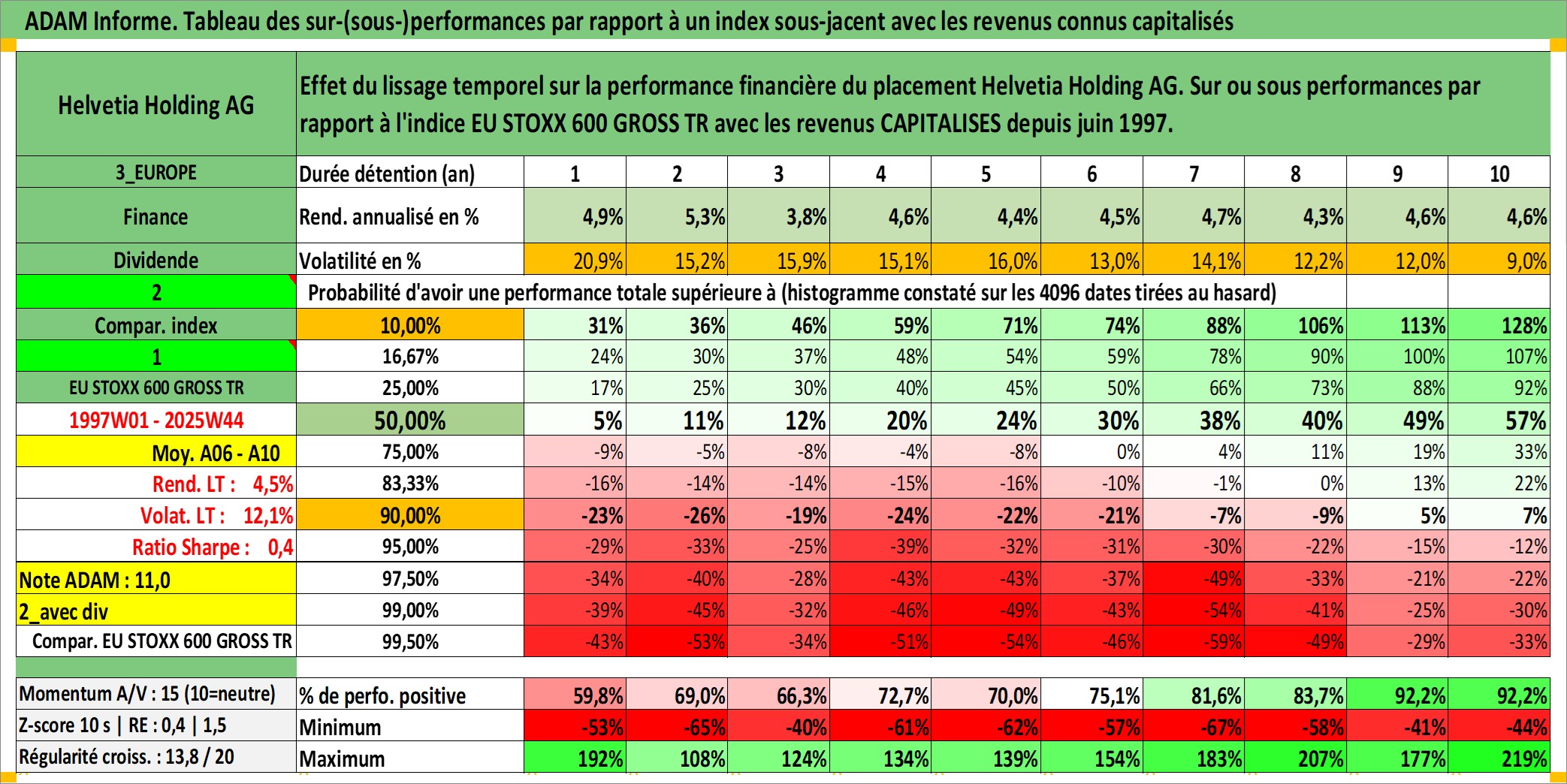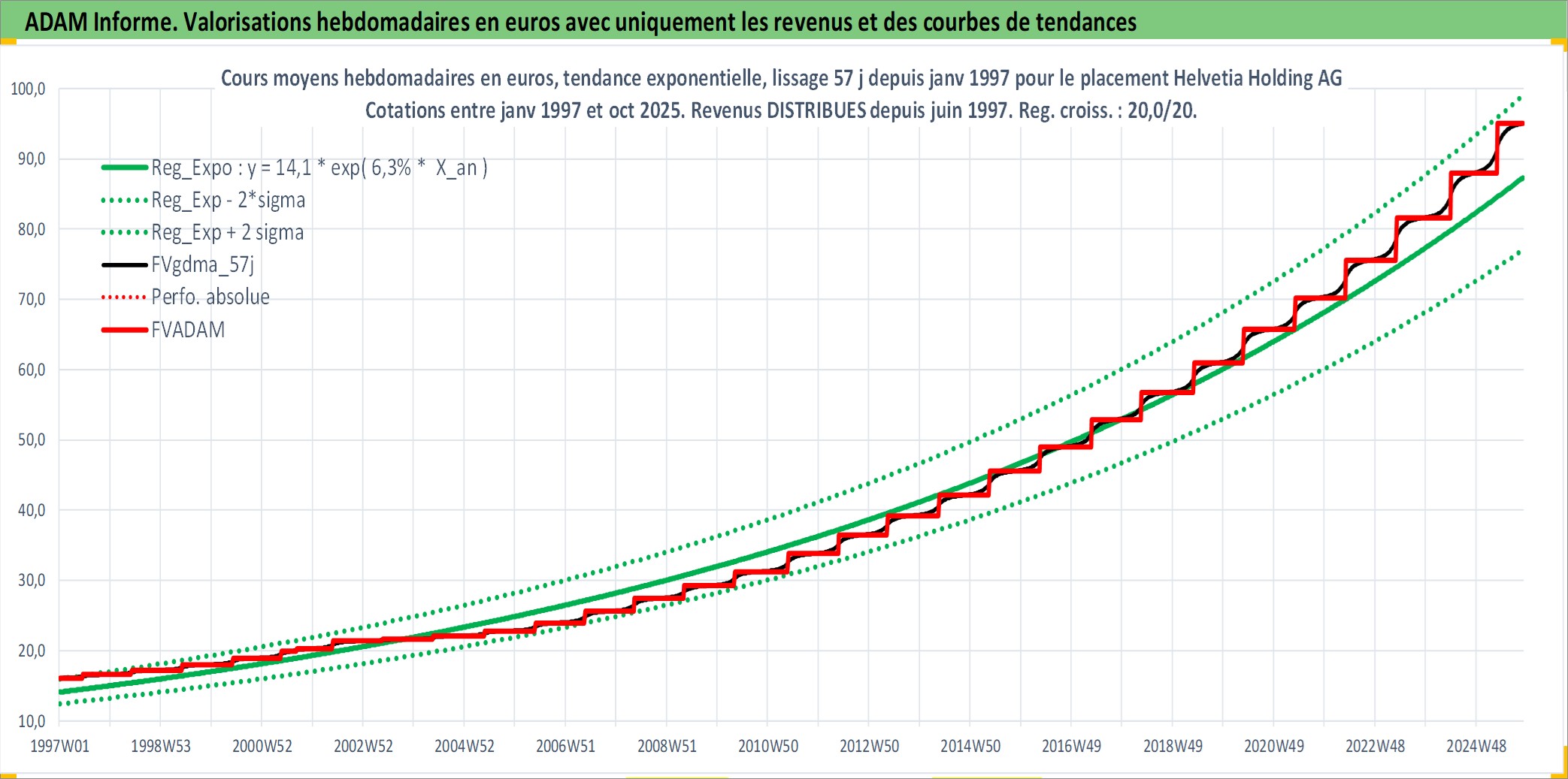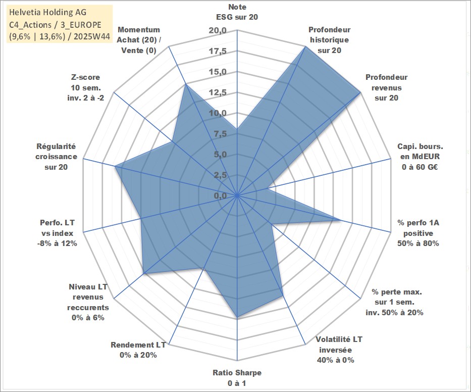 Site dédié aux investisseursPage dédiée sur site financeAnalyse des valorisations hebdomadaires de l'action Helvetia Holding AG. Cet actif est cote en CHF. Les valorisations sont en contrevaleur EURO et couvrent les semaines 1997W01 a 2025W44. Les revenus de cet actif financier sont pris en compte depuis la semaine 1997W25. La note globale ESG de cet actif est estimee a 8.0 (apres rebasage entre 0 et 20).