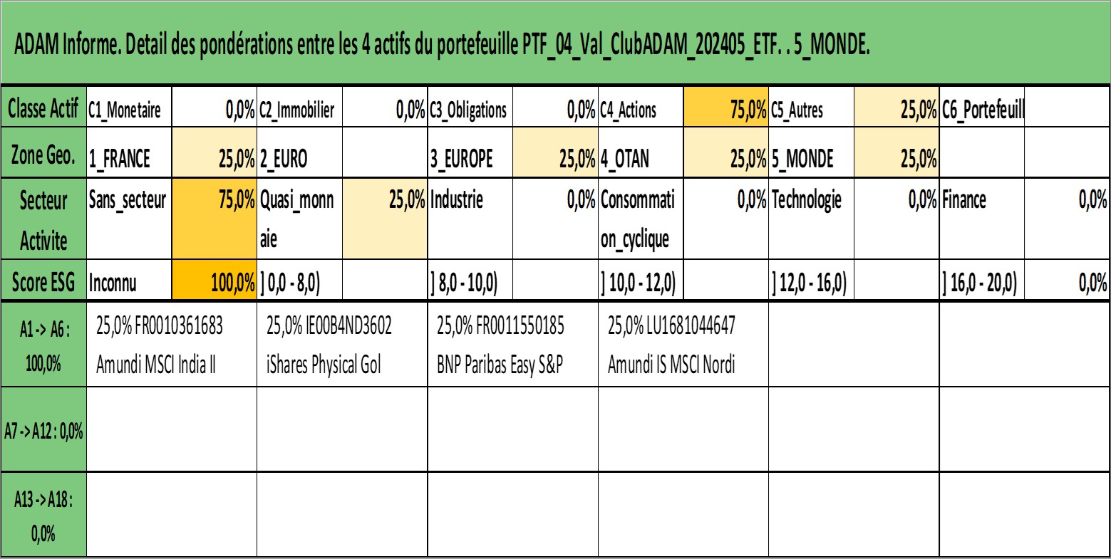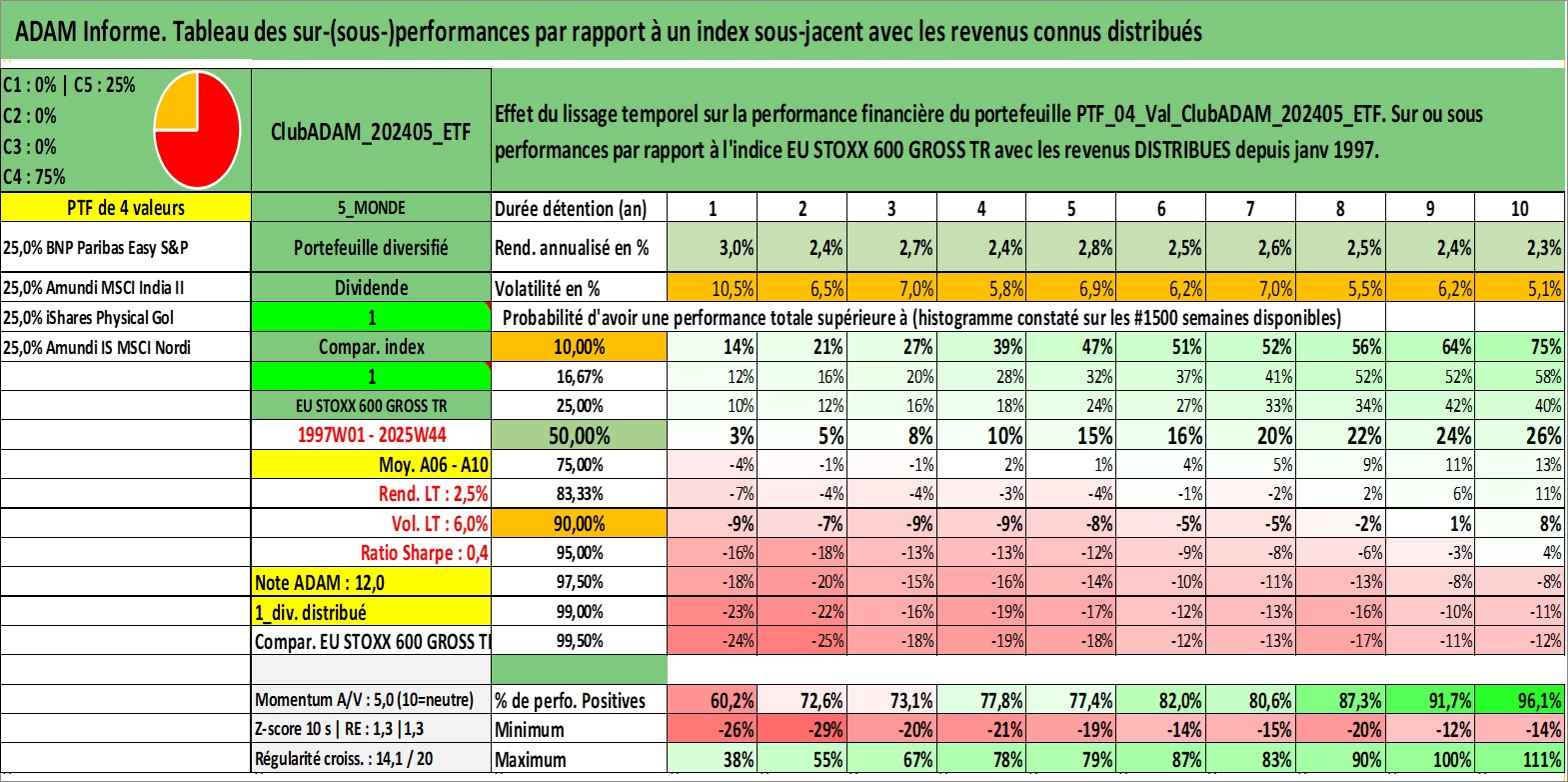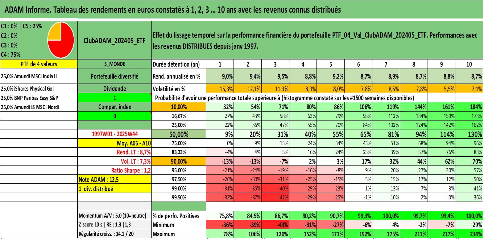 Site dédié aux investisseursPage dédiée sur site financeAnalyse des valorisations hebdomadaires du portefeuille ClubADAM_202405_ETF_4actifs avec un profil P6_PurActions. Ce portefeuille est cote en EUR. Les valorisations couvrent les semaines 1997W01 a 2025W44. Les revenus de cet actif financier sont pris en compte depuis la semaine 1997W01. La note ESG de cet actif n'est pas connue.