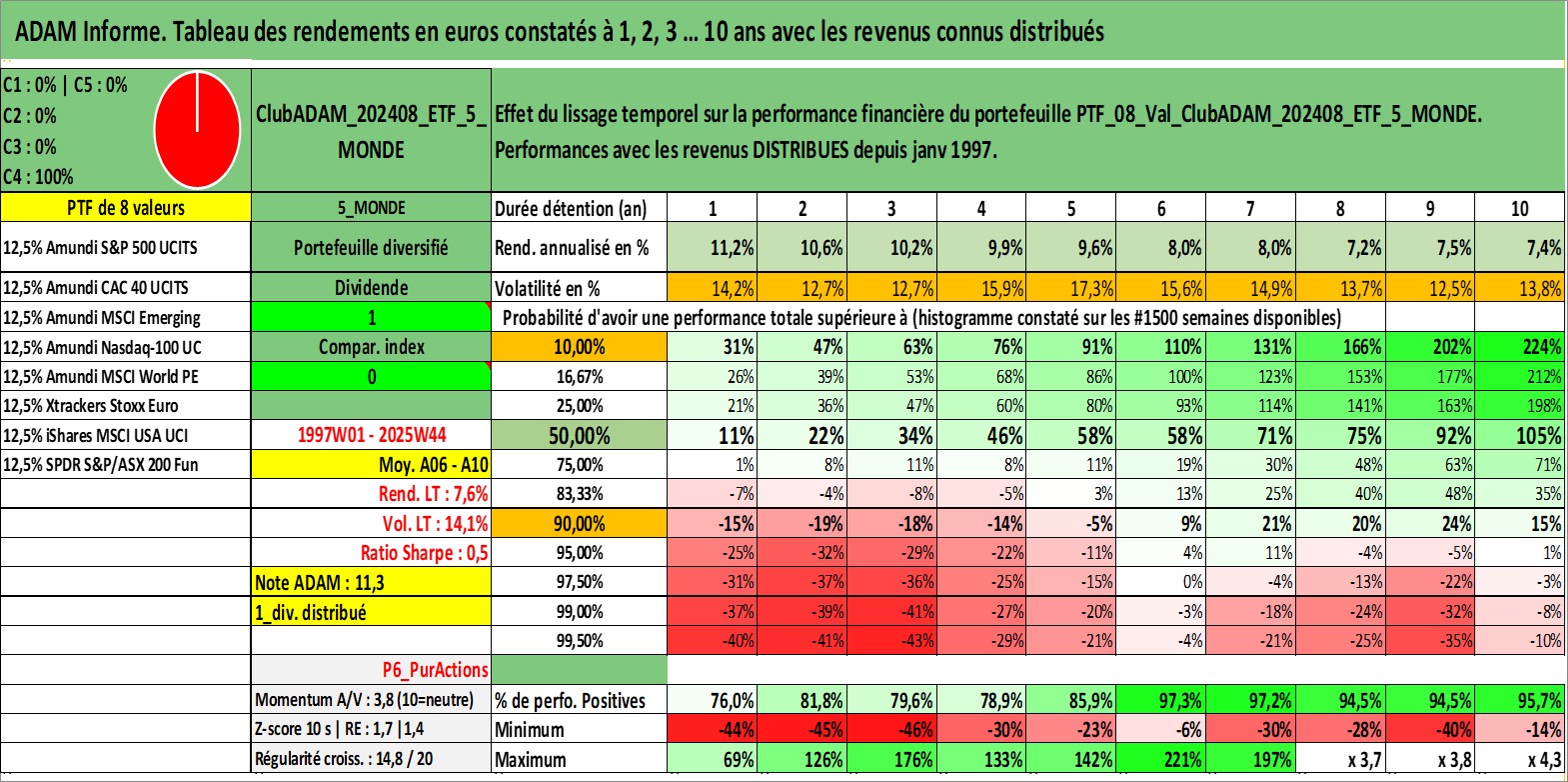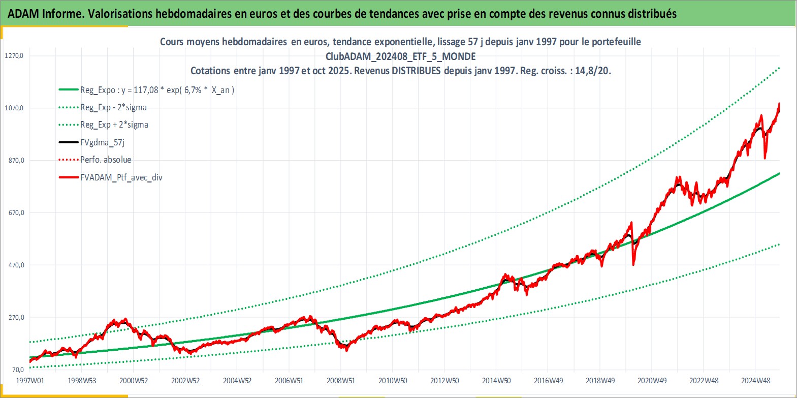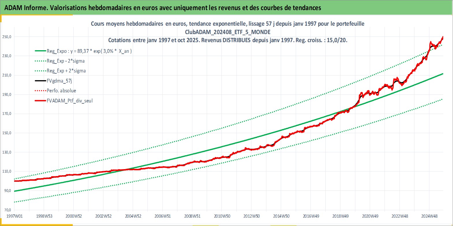 Site dédié aux investisseursPage dédiée sur site financeAnalyse des valorisations hebdomadaires du portefeuille ClubADAM_202408_ETF_5_MONDE_8actifs avec un profil P6_PurActions. Ce portefeuille est cote en EUR. Les valorisations couvrent les semaines 1997W01 a 2025W44. Les revenus de cet actif financier sont pris en compte depuis la semaine 1997W01. La note ESG de cet actif n'est pas connue.