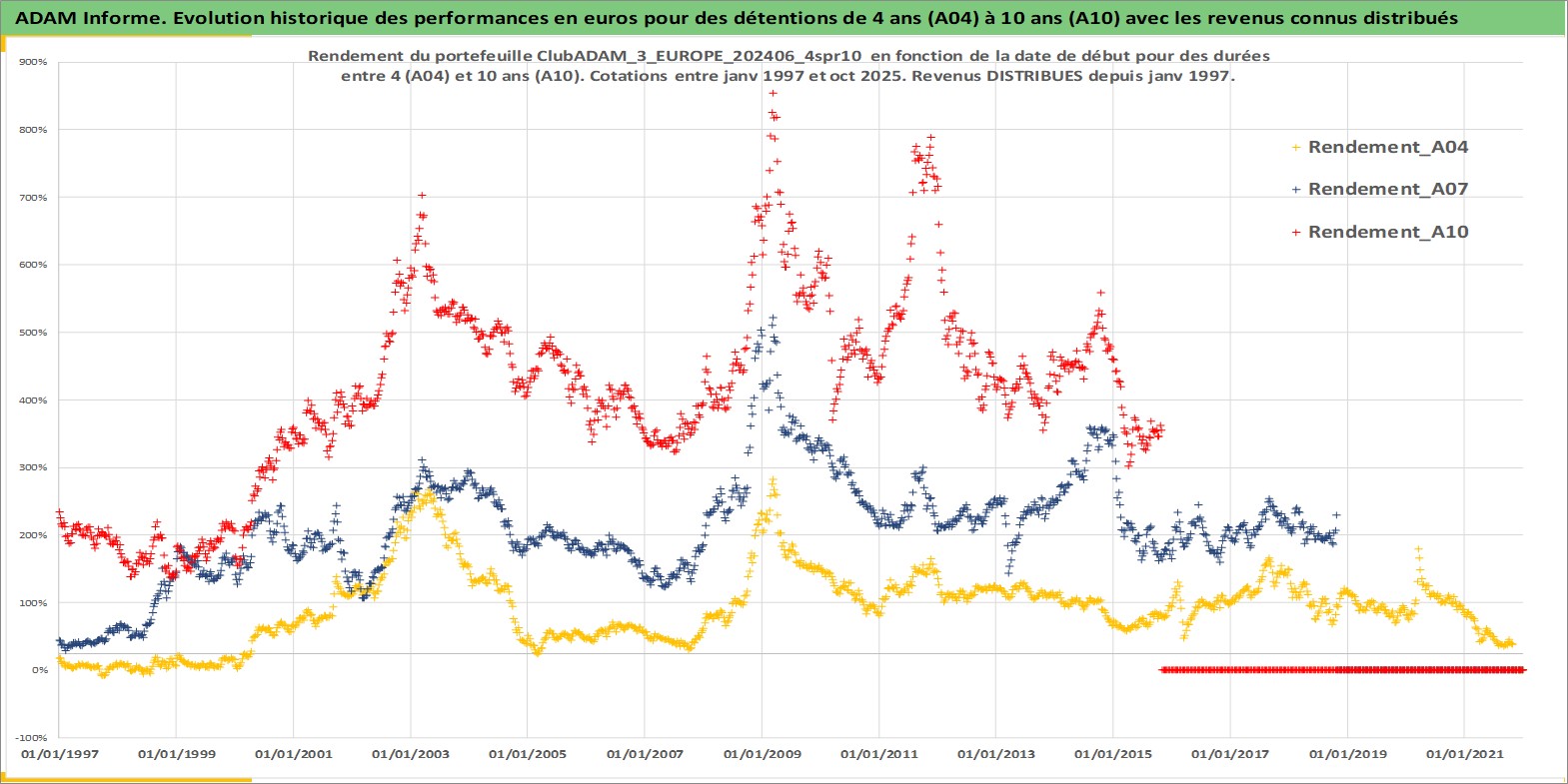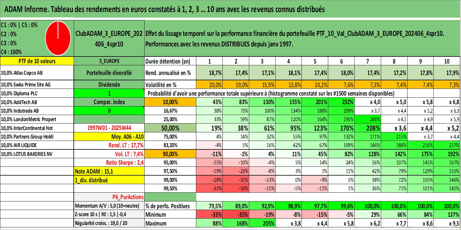 Site dédié aux investisseursPage dédiée sur site financeAnalyse des valorisations hebdomadaires du portefeuille ClubADAM_3_EUROPE_202406_4spr10_10actifs avec un profil P6_PurActions. Ce portefeuille est cote en EUR. Les valorisations couvrent les semaines 1997W01 a 2025W44. Les revenus de cet actif financier sont pris en compte depuis la semaine 1997W01. La note globale ESG de cet actif est estimee a 12.4 (apres rebasage entre 0 et 20).