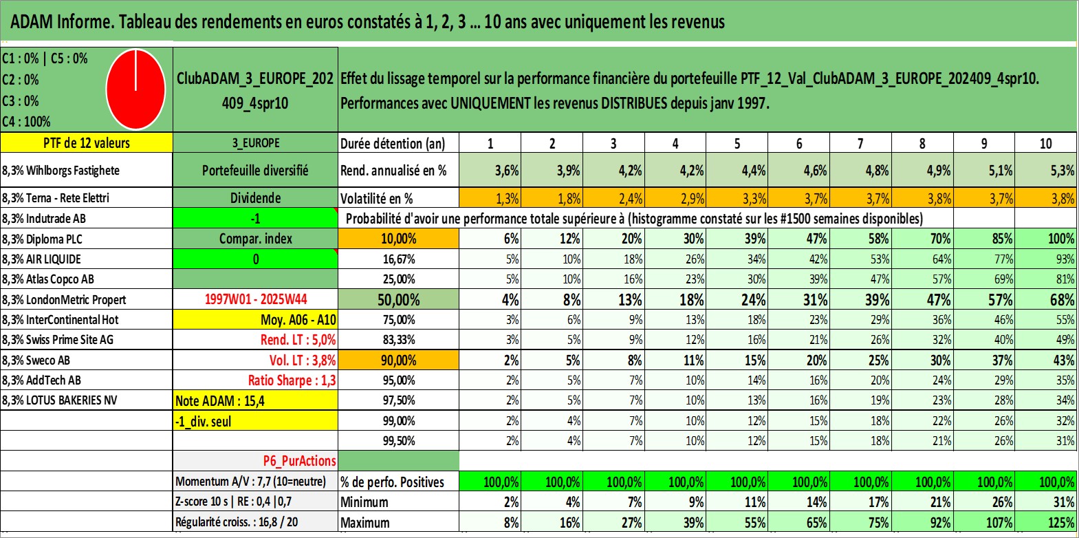 Site dédié aux investisseursPage dédiée sur site financeAnalyse des valorisations hebdomadaires du portefeuille ClubADAM_3_EUROPE_202409_4spr10_12actifs avec un profil P6_PurActions. Ce portefeuille est cote en EUR. Les valorisations couvrent les semaines 1997W01 a 2025W44. Les revenus de cet actif financier sont pris en compte depuis la semaine 1997W01. La note globale ESG de cet actif est estimee a 13.8 (apres rebasage entre 0 et 20).