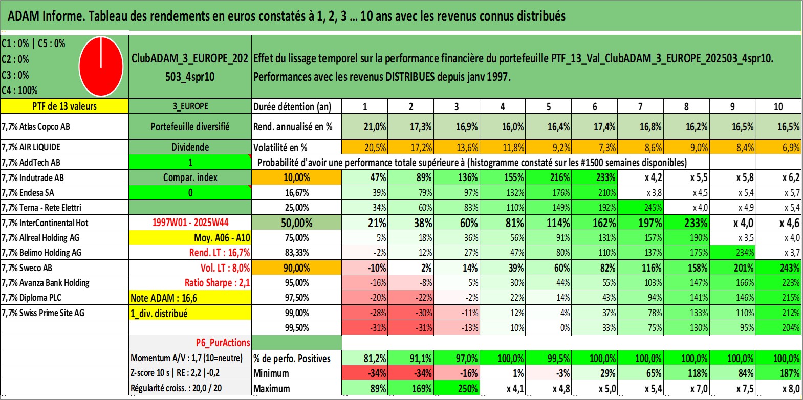 Site dédié aux investisseursPage dédiée sur site financeAnalyse des valorisations hebdomadaires du portefeuille ClubADAM_3_EUROPE_202503_4spr10_13actifs avec un profil P6_PurActions. Ce portefeuille est cote en EUR. Les valorisations couvrent les semaines 1997W01 a 2025W44. Les revenus de cet actif financier sont pris en compte depuis la semaine 1997W01. La note globale ESG de cet actif est estimee a 13.5 (apres rebasage entre 0 et 20).