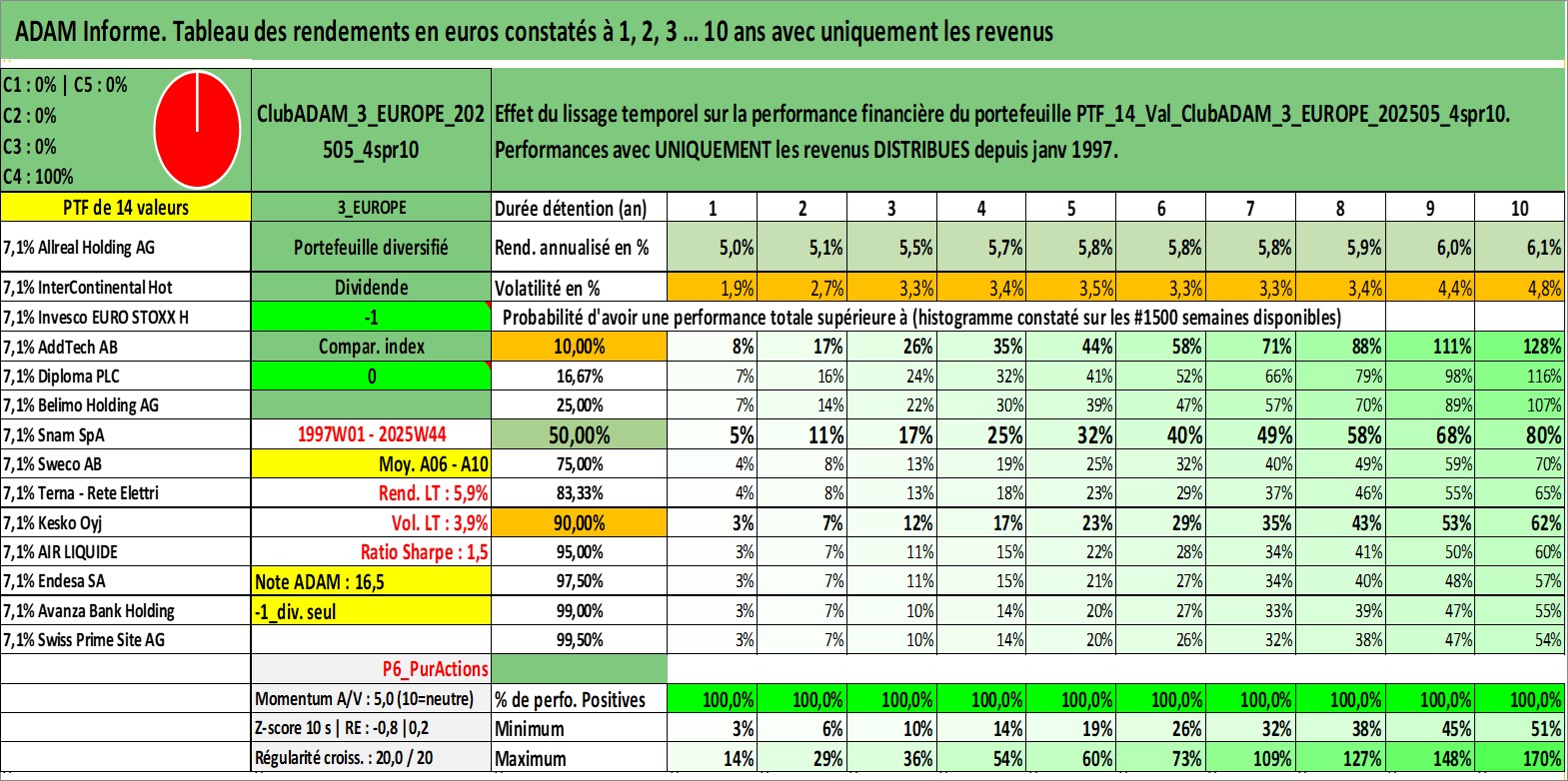 Site dédié aux investisseursPage dédiée sur site financeAnalyse des valorisations hebdomadaires du portefeuille ClubADAM_3_EUROPE_202505_4spr10_14actifs avec un profil P6_PurActions. Ce portefeuille est cote en EUR. Les valorisations couvrent les semaines 1997W01 a 2025W44. Les revenus de cet actif financier sont pris en compte depuis la semaine 1997W01. La note globale ESG de cet actif est estimee a 13.8 (apres rebasage entre 0 et 20).