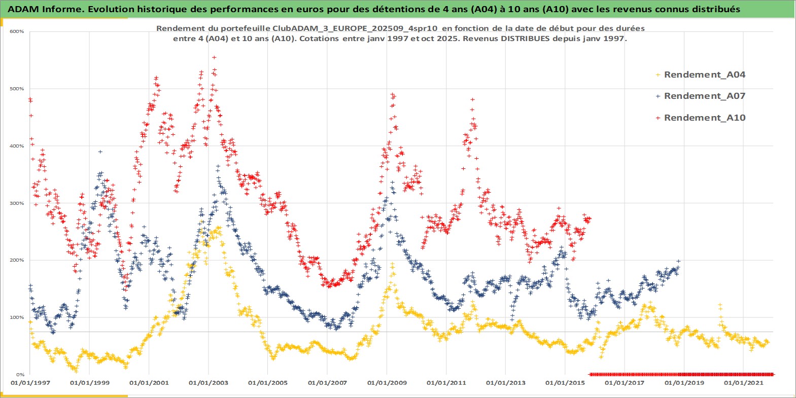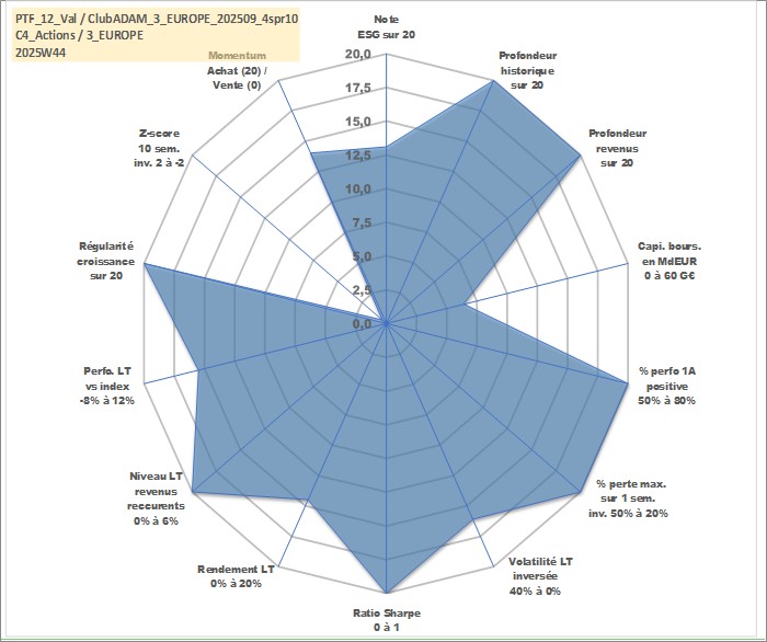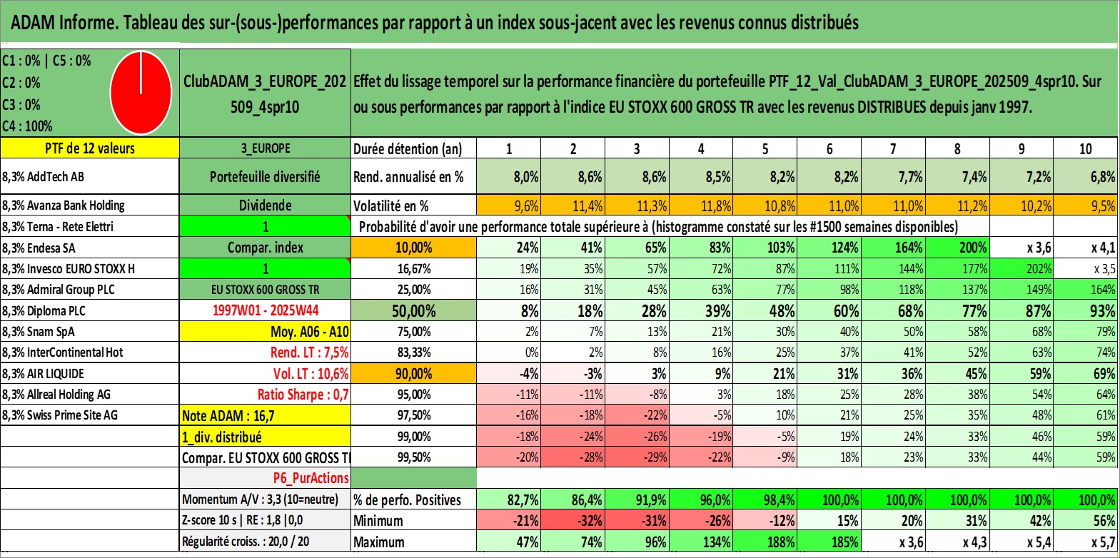 Site dédié aux investisseursPage dédiée sur site financeAnalyse des valorisations hebdomadaires du portefeuille ClubADAM_3_EUROPE_202509_4spr10_12actifs avec un profil P6_PurActions. Ce portefeuille est cote en EUR. Les valorisations couvrent les semaines 1997W01 a 2025W44. Les revenus de cet actif financier sont pris en compte depuis la semaine 1997W01. La note globale ESG de cet actif est estimee a 13.1 (apres rebasage entre 0 et 20).