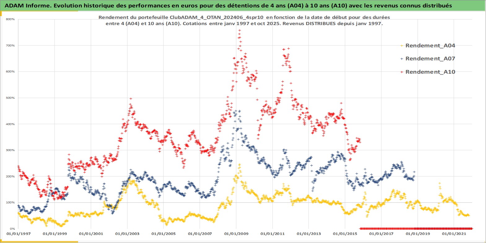 Site dédié aux investisseursPage dédiée sur site financeAnalyse des valorisations hebdomadaires du portefeuille ClubADAM_4_OTAN_202406_4spr10_24actifs avec un profil P6_PurActions. Ce portefeuille est cote en EUR. Les valorisations couvrent les semaines 1997W01 a 2025W44. Les revenus de cet actif financier sont pris en compte depuis la semaine 1997W01. La note globale ESG de cet actif est estimee a 11.1 (apres rebasage entre 0 et 20).