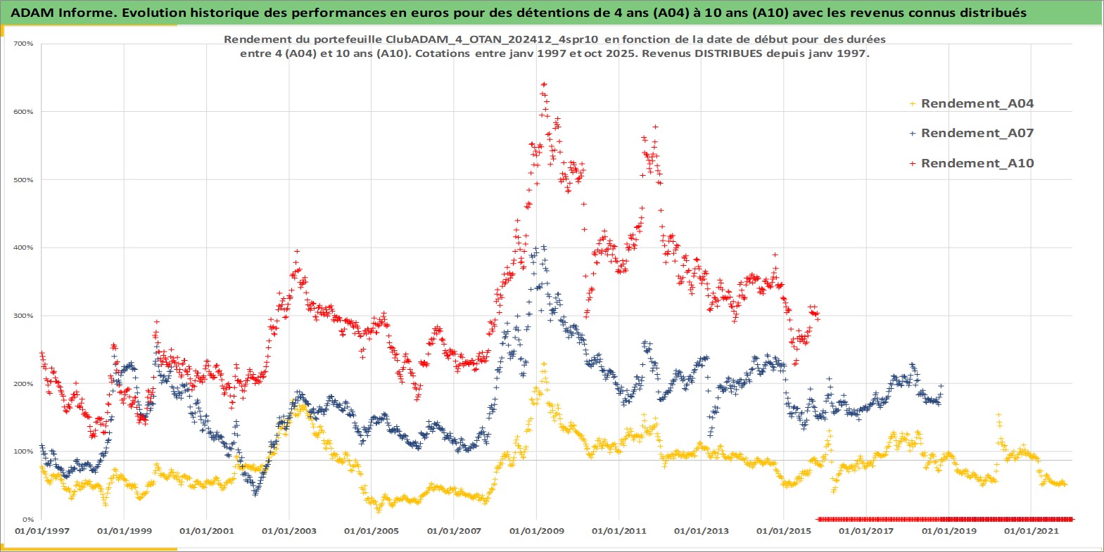 Site dédié aux investisseursPage dédiée sur site financeAnalyse des valorisations hebdomadaires du portefeuille ClubADAM_4_OTAN_202412_4spr10_29actifs avec un profil P6_PurActions. Ce portefeuille est cote en EUR. Les valorisations couvrent les semaines 1997W01 a 2025W44. Les revenus de cet actif financier sont pris en compte depuis la semaine 1997W01. La note globale ESG de cet actif est estimee a 11.5 (apres rebasage entre 0 et 20).