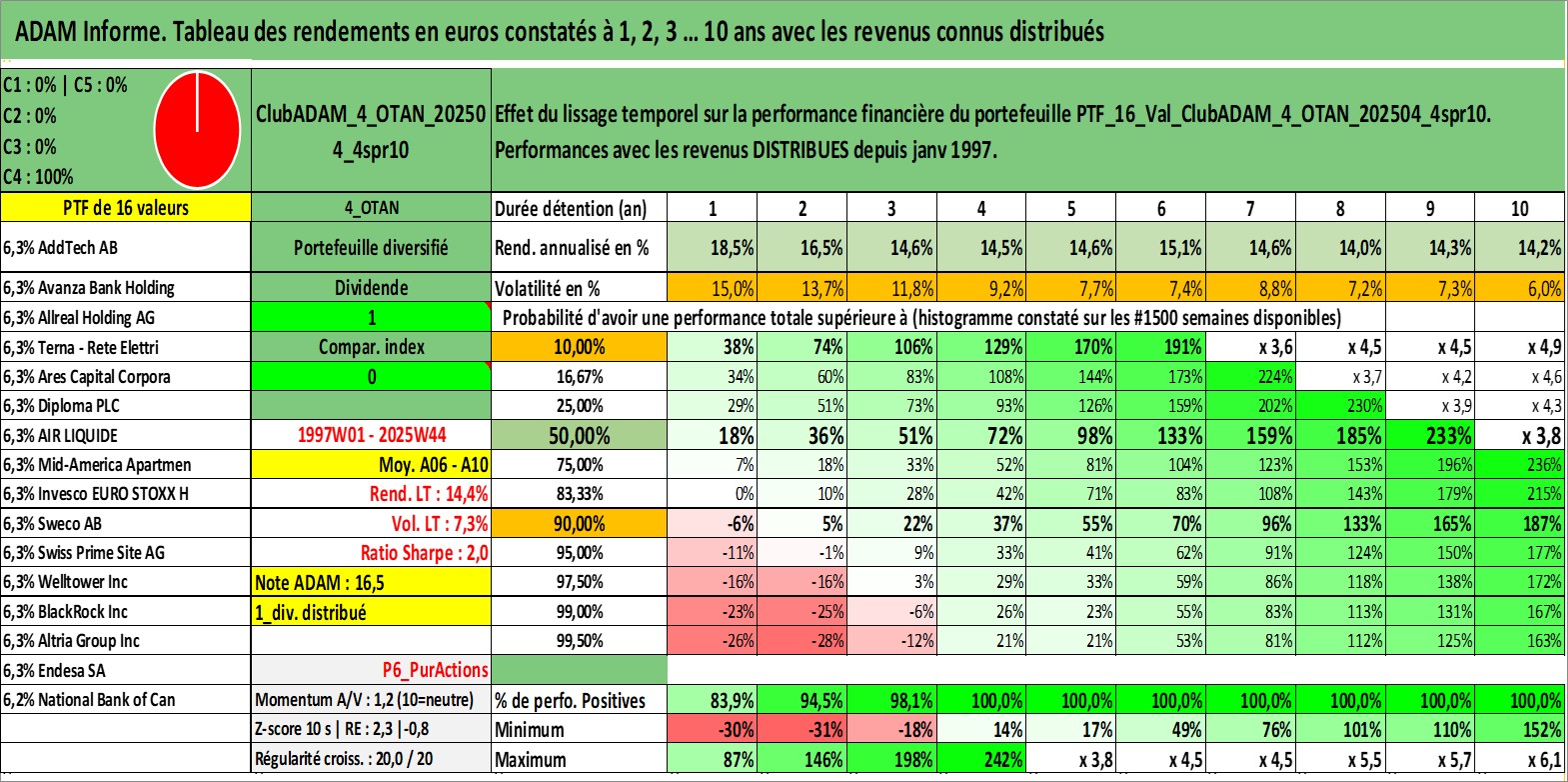 Site dédié aux investisseursPage dédiée sur site financeAnalyse des valorisations hebdomadaires du portefeuille ClubADAM_4_OTAN_202504_4spr10_16actifs avec un profil P6_PurActions. Ce portefeuille est cote en EUR. Les valorisations couvrent les semaines 1997W01 a 2025W44. Les revenus de cet actif financier sont pris en compte depuis la semaine 1997W01. La note globale ESG de cet actif est estimee a 13.1 (apres rebasage entre 0 et 20).