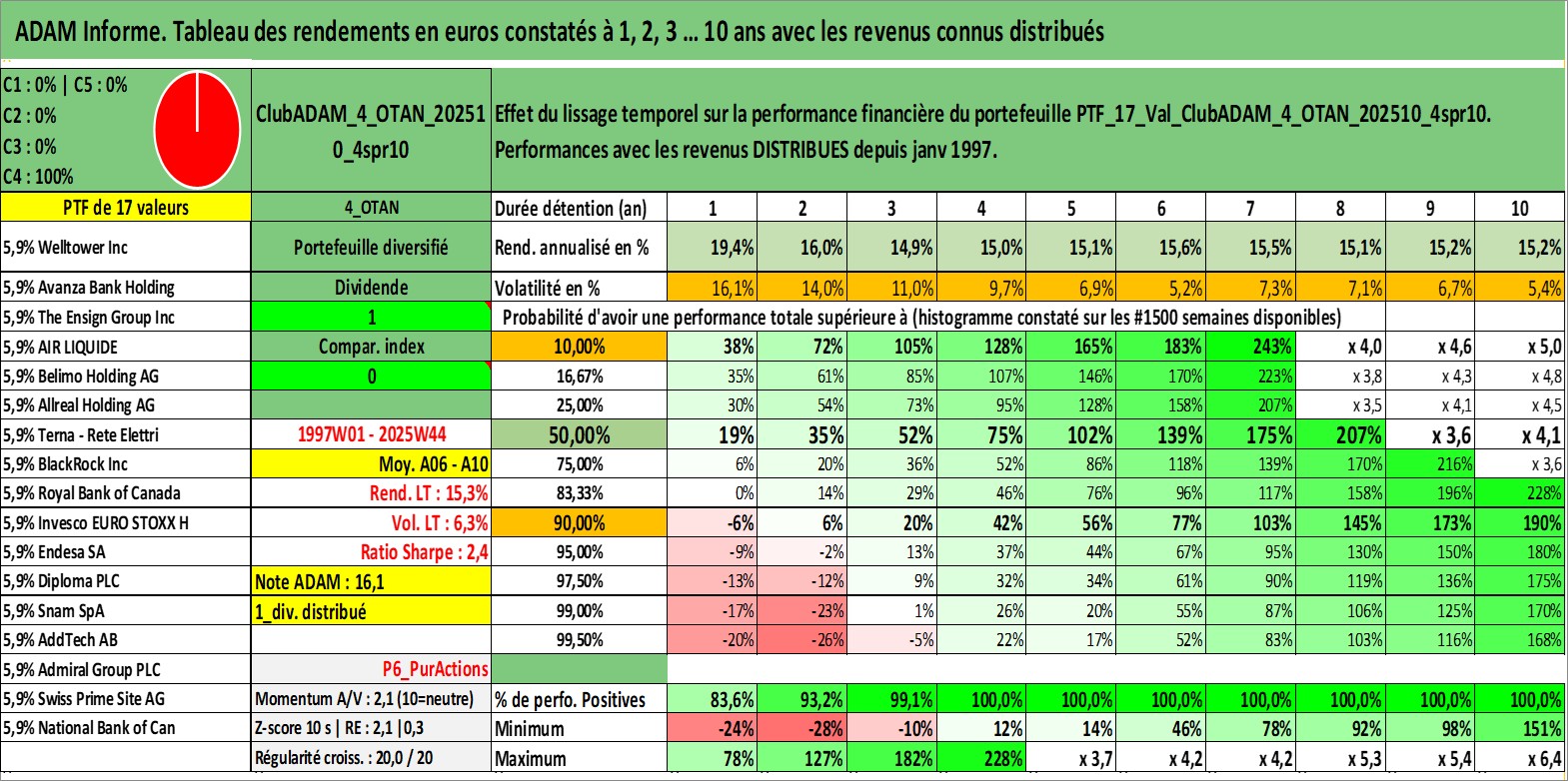 Site dédié aux investisseursPage dédiée sur site financeAnalyse des valorisations hebdomadaires du portefeuille ClubADAM_4_OTAN_202510_4spr10_17actifs avec un profil P6_PurActions. Ce portefeuille est cote en EUR. Les valorisations couvrent les semaines 1997W01 a 2025W44. Les revenus de cet actif financier sont pris en compte depuis la semaine 1997W01. La note globale ESG de cet actif est estimee a 13.0 (apres rebasage entre 0 et 20).
