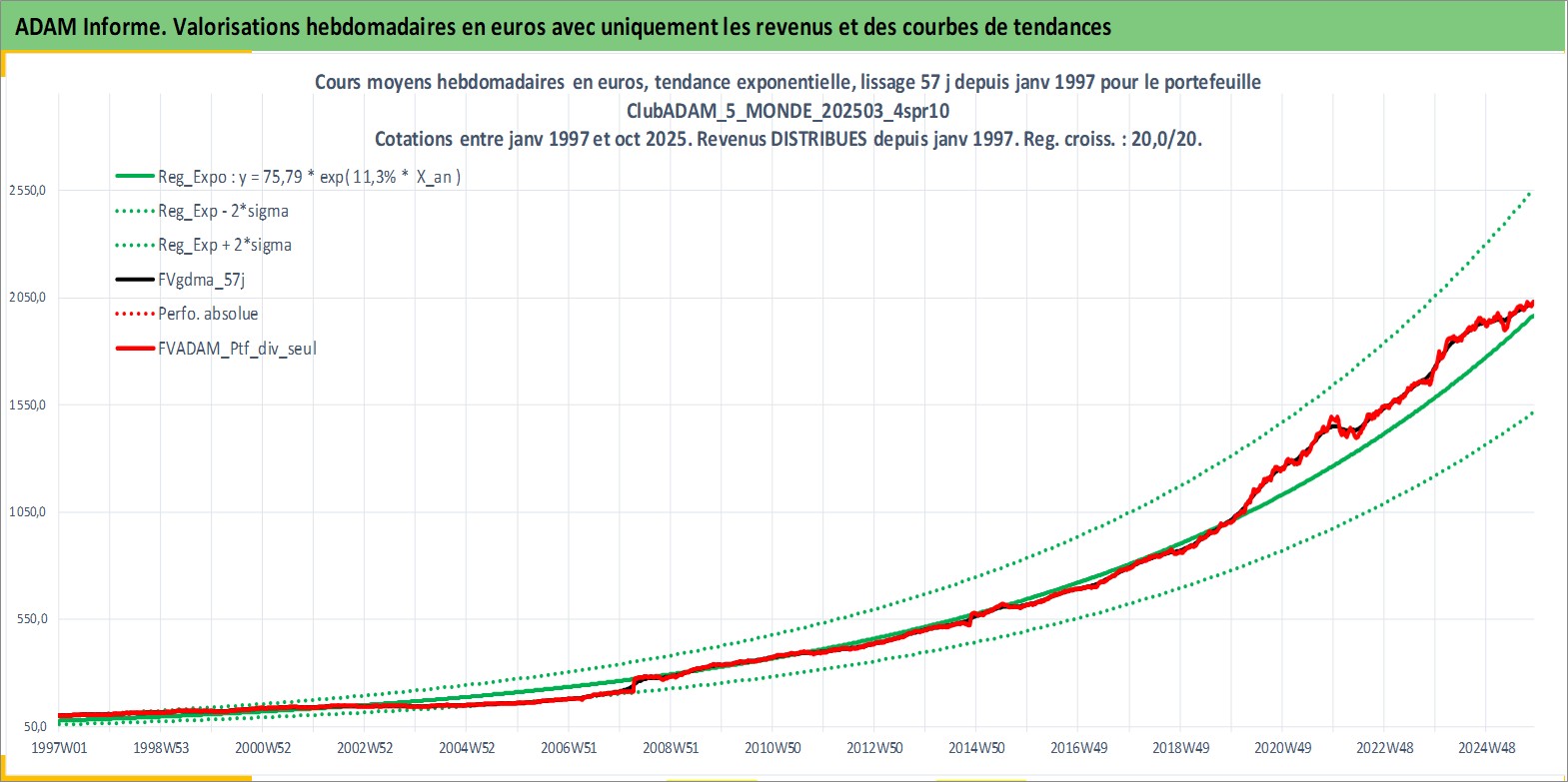 Site dédié aux investisseursPage dédiée sur site financeAnalyse des valorisations hebdomadaires du portefeuille ClubADAM_5_MONDE_202503_4spr10_30actifs avec un profil P6_PurActions. Ce portefeuille est cote en EUR. Les valorisations couvrent les semaines 1997W01 a 2025W44. Les revenus de cet actif financier sont pris en compte depuis la semaine 1997W01. La note globale ESG de cet actif est estimee a 11.4 (apres rebasage entre 0 et 20).