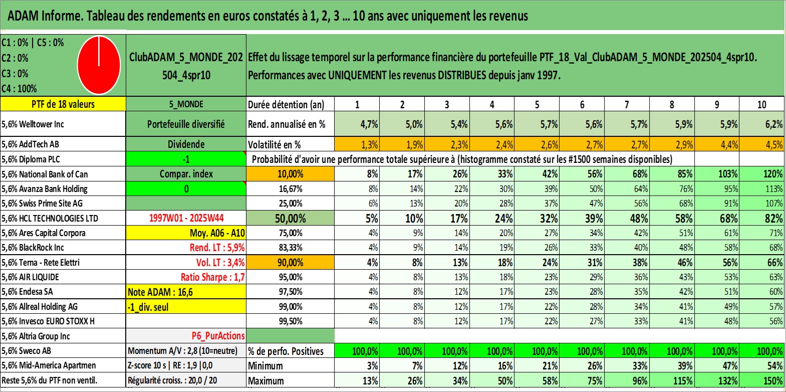 Site dédié aux investisseursPage dédiée sur site financeAnalyse des valorisations hebdomadaires du portefeuille ClubADAM_5_MONDE_202504_4spr10_18actifs avec un profil P6_PurActions. Ce portefeuille est cote en EUR. Les valorisations couvrent les semaines 1997W01 a 2025W44. Les revenus de cet actif financier sont pris en compte depuis la semaine 1997W01. La note globale ESG de cet actif est estimee a 13.3 (apres rebasage entre 0 et 20).