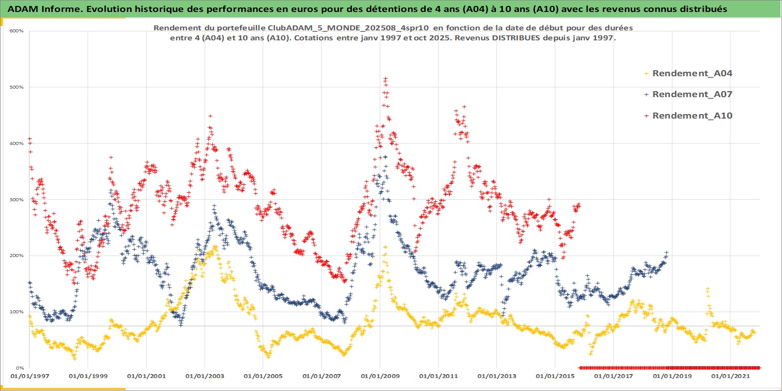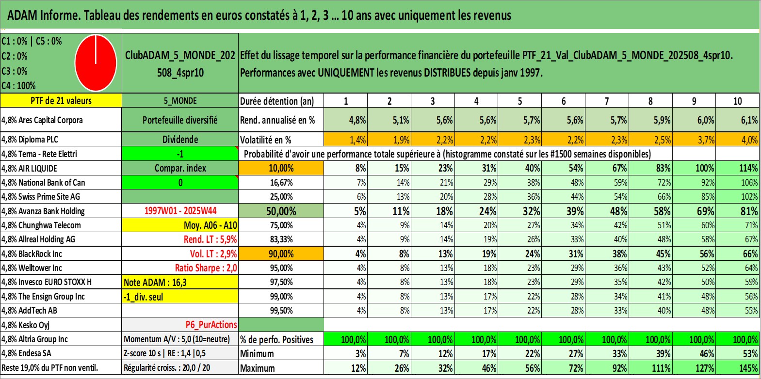 Site dédié aux investisseursPage dédiée sur site financeAnalyse des valorisations hebdomadaires du portefeuille ClubADAM_5_MONDE_202508_4spr10_21actifs avec un profil P6_PurActions. Ce portefeuille est cote en EUR. Les valorisations couvrent les semaines 1997W01 a 2025W44. Les revenus de cet actif financier sont pris en compte depuis la semaine 1997W01. La note globale ESG de cet actif est estimee a 12.8 (apres rebasage entre 0 et 20).