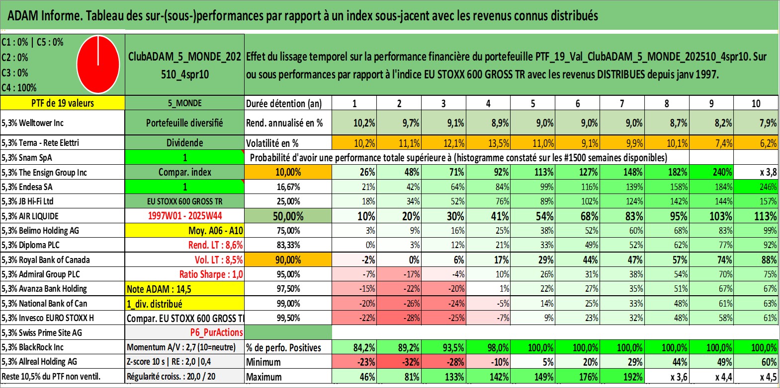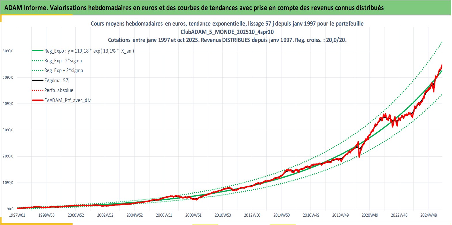 Site dédié aux investisseursPage dédiée sur site financeAnalyse des valorisations hebdomadaires du portefeuille ClubADAM_5_MONDE_202510_4spr10_19actifs avec un profil P6_PurActions. Ce portefeuille est cote en EUR. Les valorisations couvrent les semaines 1997W01 a 2025W44. Les revenus de cet actif financier sont pris en compte depuis la semaine 1997W01. La note globale ESG de cet actif est estimee a 13.0 (apres rebasage entre 0 et 20).