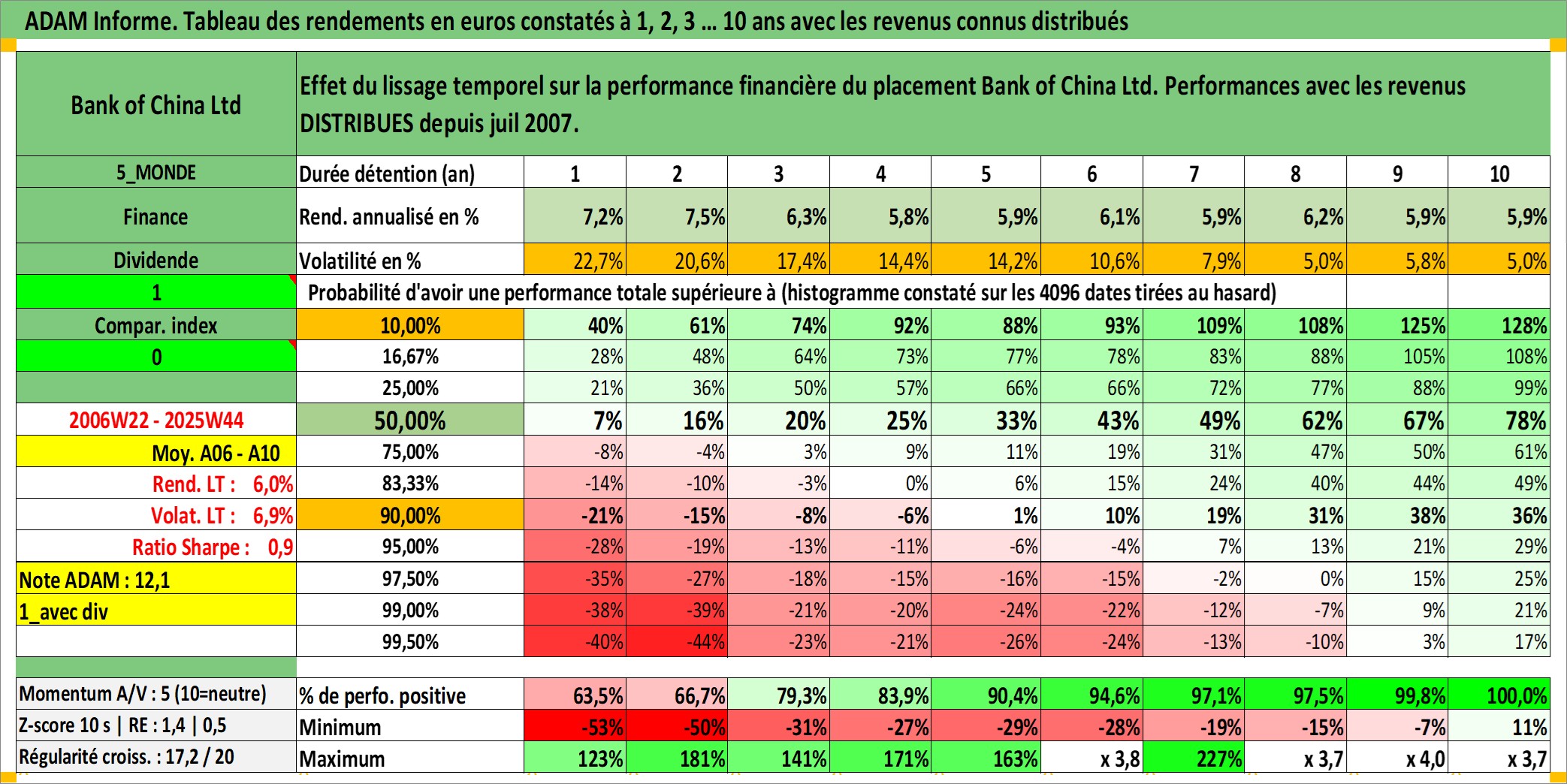 Site dédié aux investisseursPage dédiée sur site financeAnalyse des valorisations hebdomadaires de l'action Bank of China Ltd. Cet actif est cote en HKD. Les valorisations sont en contrevaleur EURO et couvrent les semaines 2006W22 a 2025W44. Les revenus de cet actif financier sont pris en compte depuis la semaine 2007W27. La note globale ESG de cet actif est estimee a 3.0 (apres rebasage entre 0 et 20).