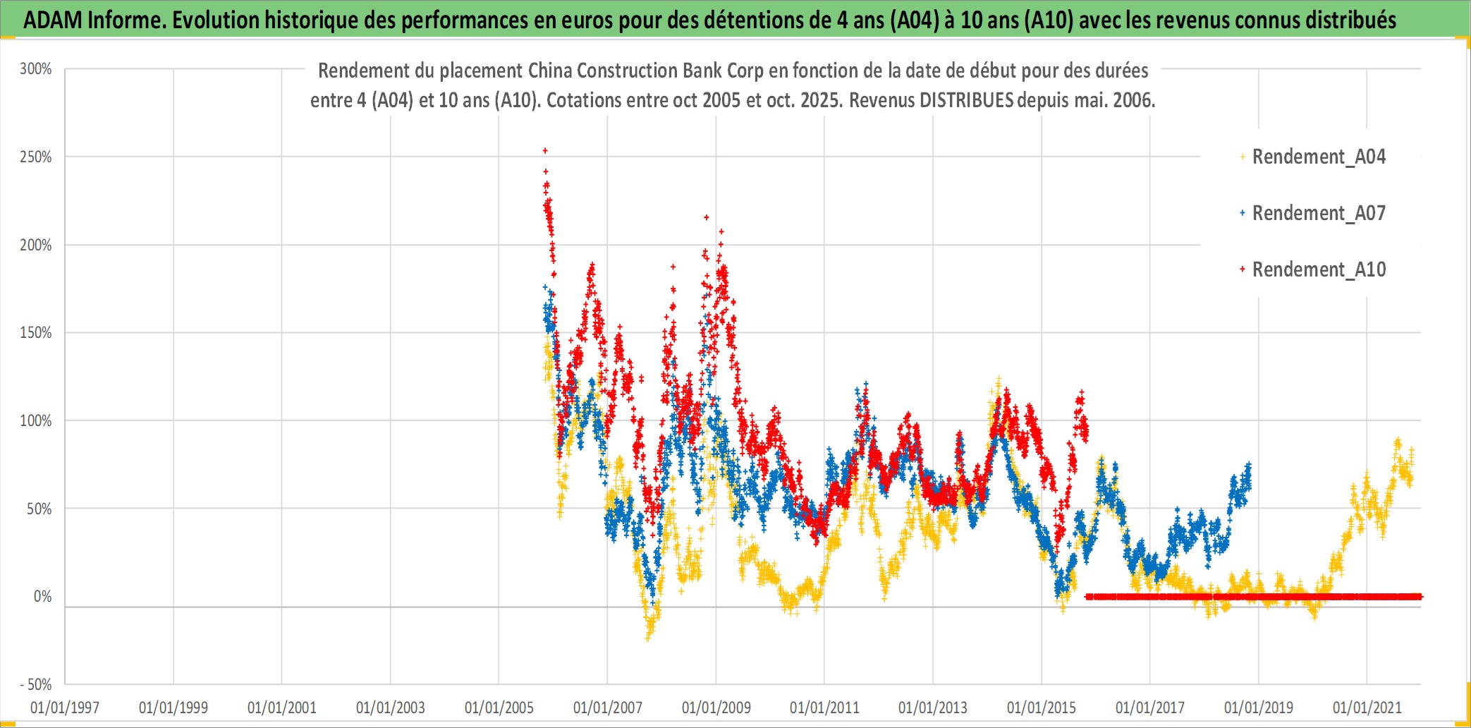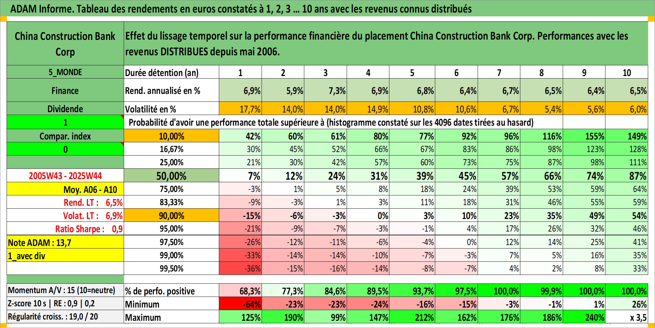 Site dédié aux investisseursPage dédiée sur site financeAnalyse des valorisations hebdomadaires de l'action China Construction Bank Corp. Cet actif est cote en HKD. Les valorisations sont en contrevaleur EURO et couvrent les semaines 2005W43 a 2025W44. Les revenus de cet actif financier sont pris en compte depuis la semaine 2006W19. La note globale ESG de cet actif est estimee a 5.0 (apres rebasage entre 0 et 20).