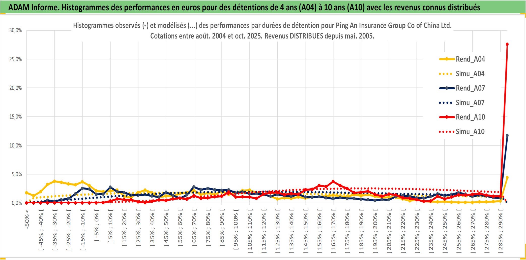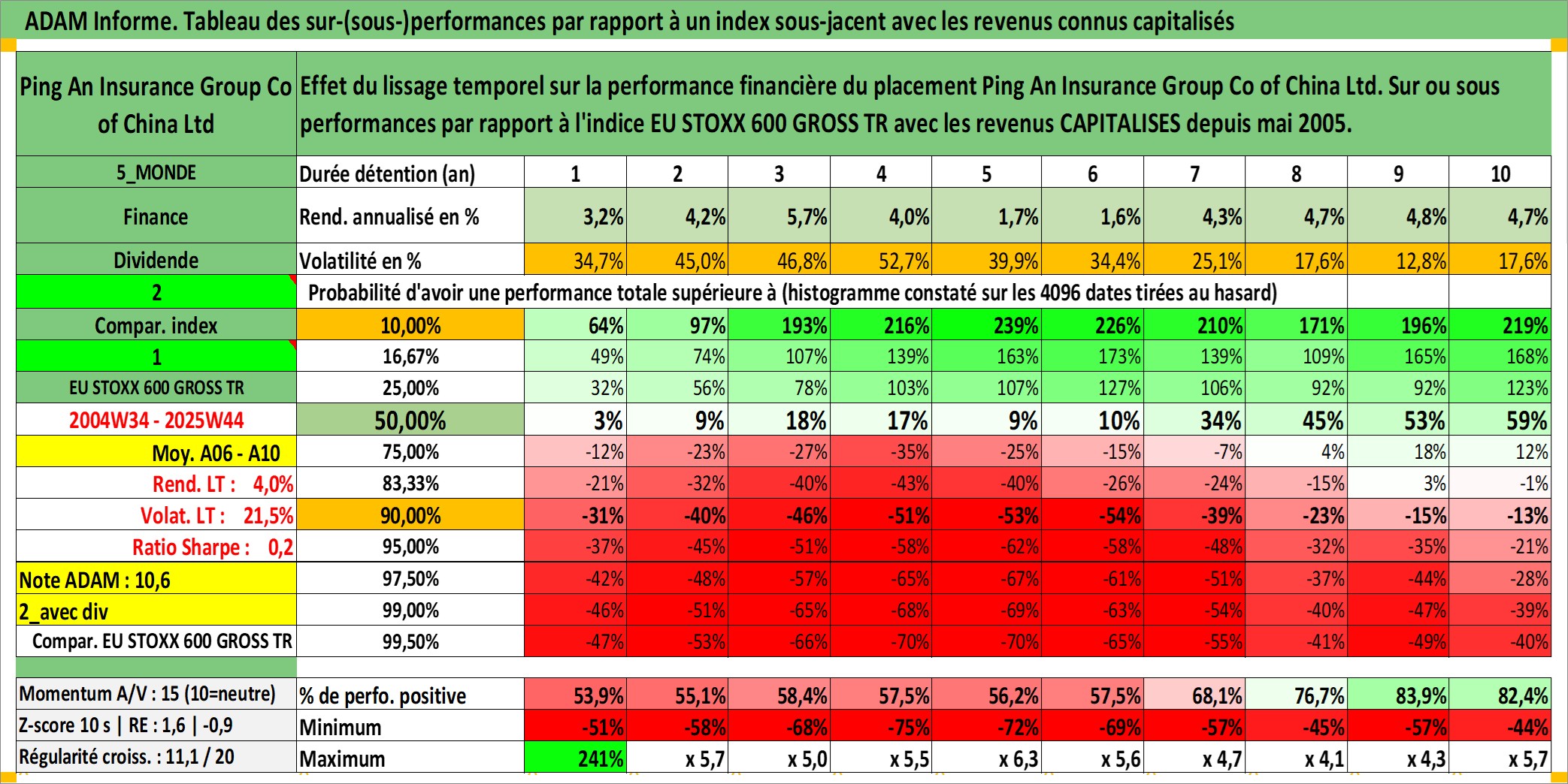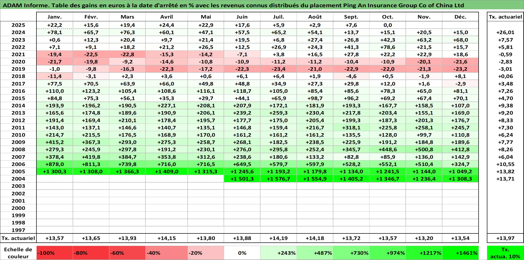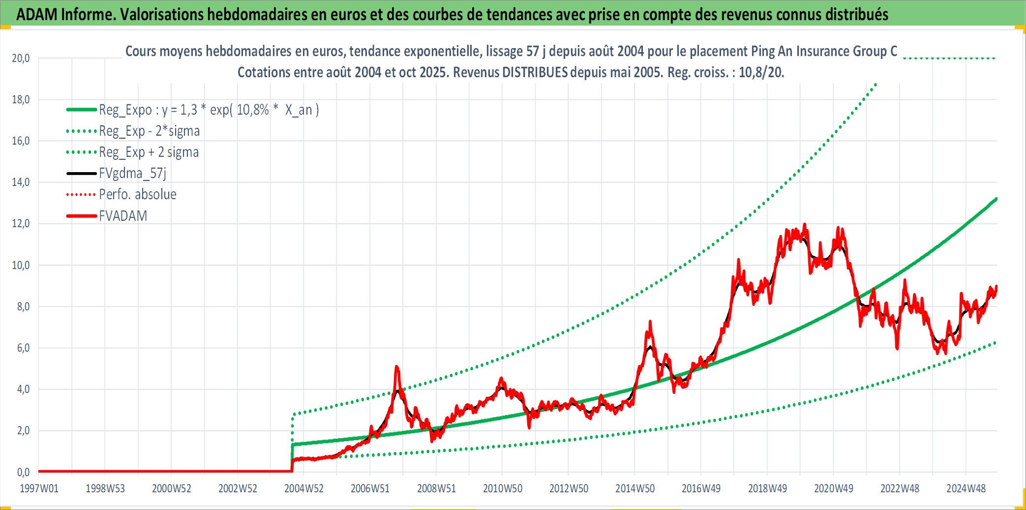 Site dédié aux investisseursPage dédiée sur site financeAnalyse des valorisations hebdomadaires de l'action Ping An Insurance Group Co of China Ltd. Cet actif est cote en HKD. Les valorisations sont en contrevaleur EURO et couvrent les semaines 2004W34 a 2025W44. Les revenus de cet actif financier sont pris en compte depuis la semaine 2005W20. La note globale ESG de cet actif est estimee a 11.0 (apres rebasage entre 0 et 20).