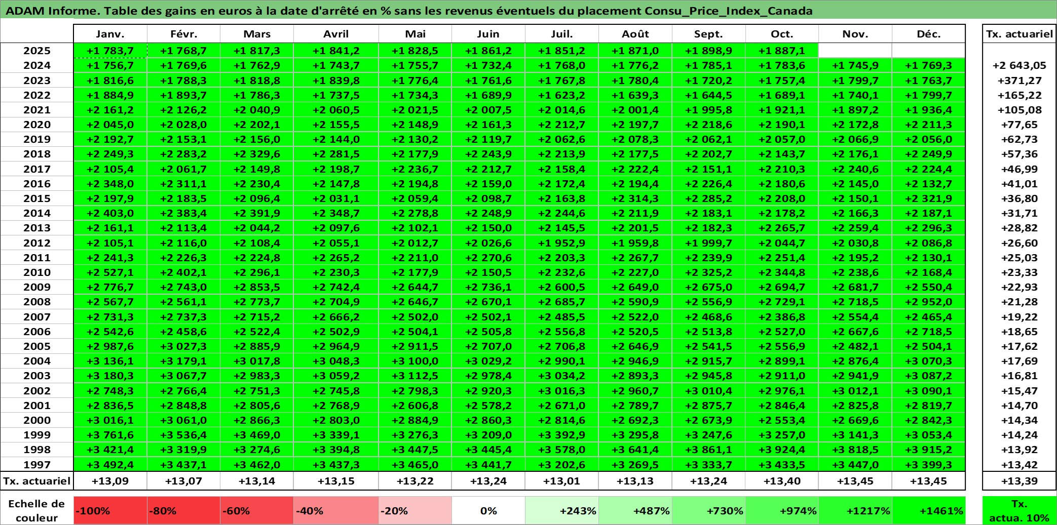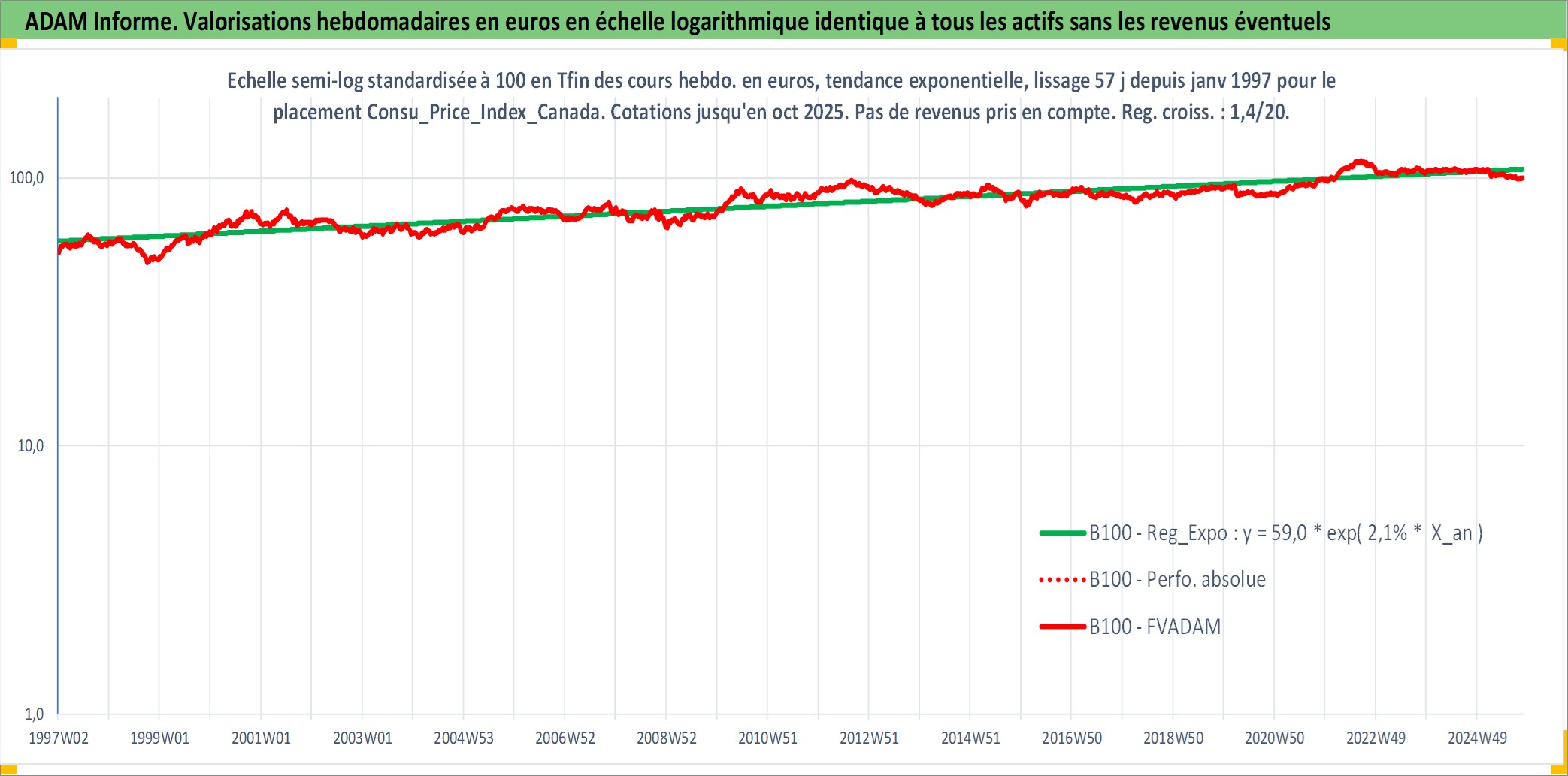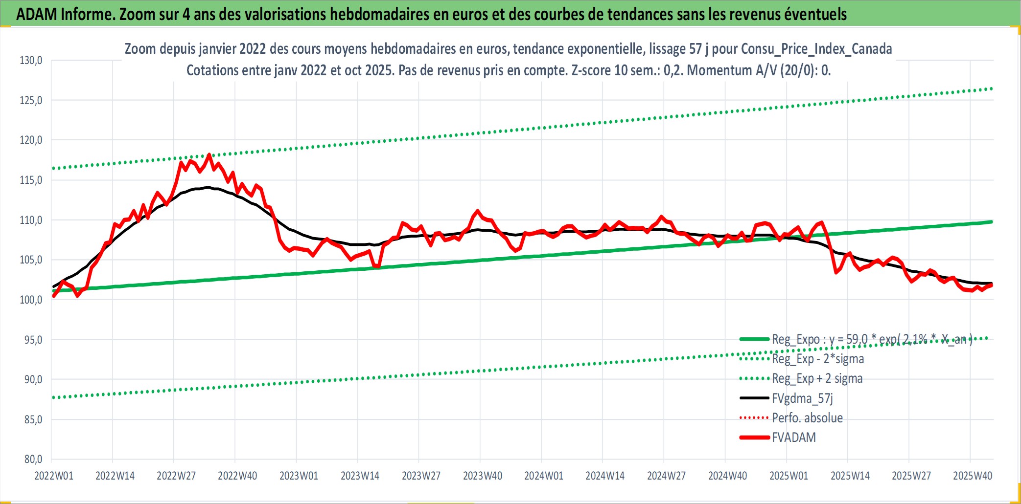 Site dédié aux investisseursPage dédiée sur site financeAnalyse des valorisations hebdomadaires de l'action Consu_Price_Index_Canada. Cet actif est cote en CAD. Les valorisations sont en contrevaleur EURO et couvrent les semaines 1997W01 a 2025W44. Les revenus de cet actif financier ne sont pas connus car non existants ou non disponibles sur le site Yahoo Finance. La note ESG de cet actif n'est pas connue.