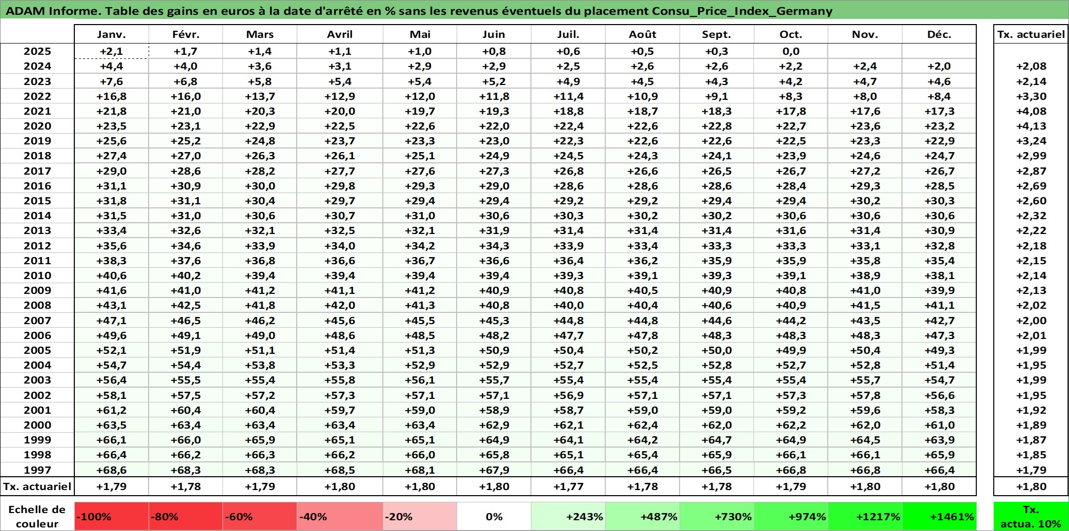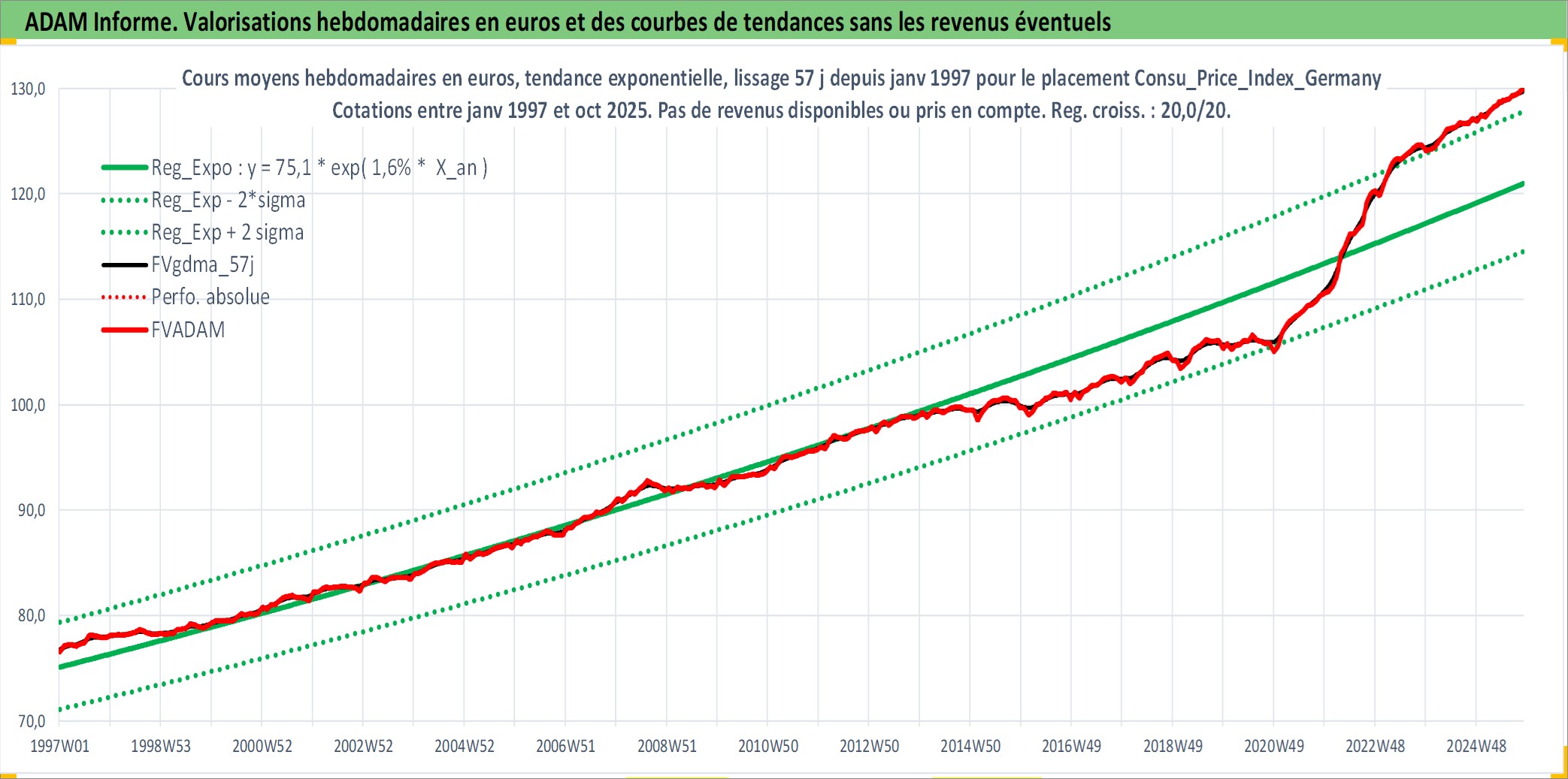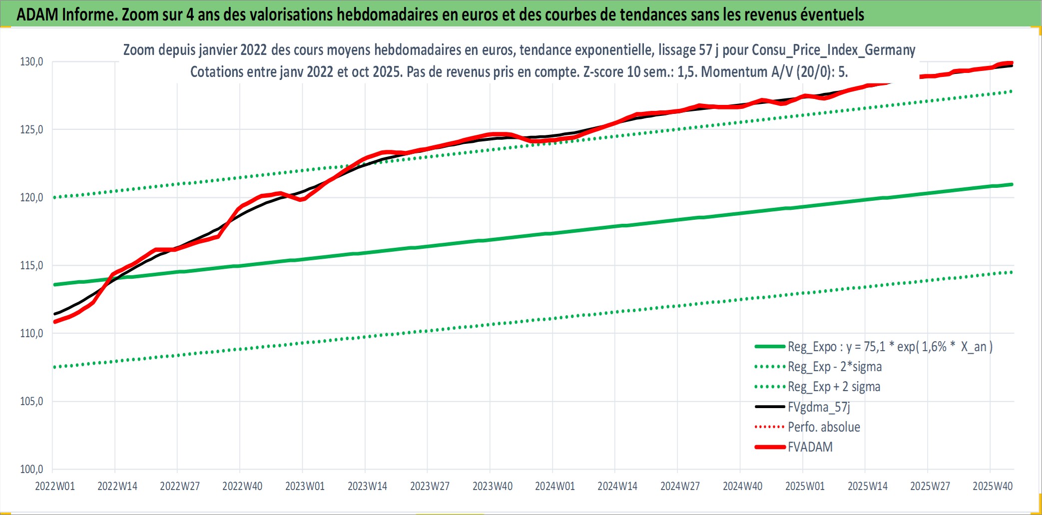 Site dédié aux investisseursPage dédiée sur site financeAnalyse des valorisations hebdomadaires de l'action Consu_Price_Index_Germany. Cet actif est cote en EUR. Les valorisations couvrent les semaines 1997W01 a 2025W44. Les revenus de cet actif financier ne sont pas connus car non existants ou non disponibles sur le site Yahoo Finance. La note ESG de cet actif n'est pas connue.
