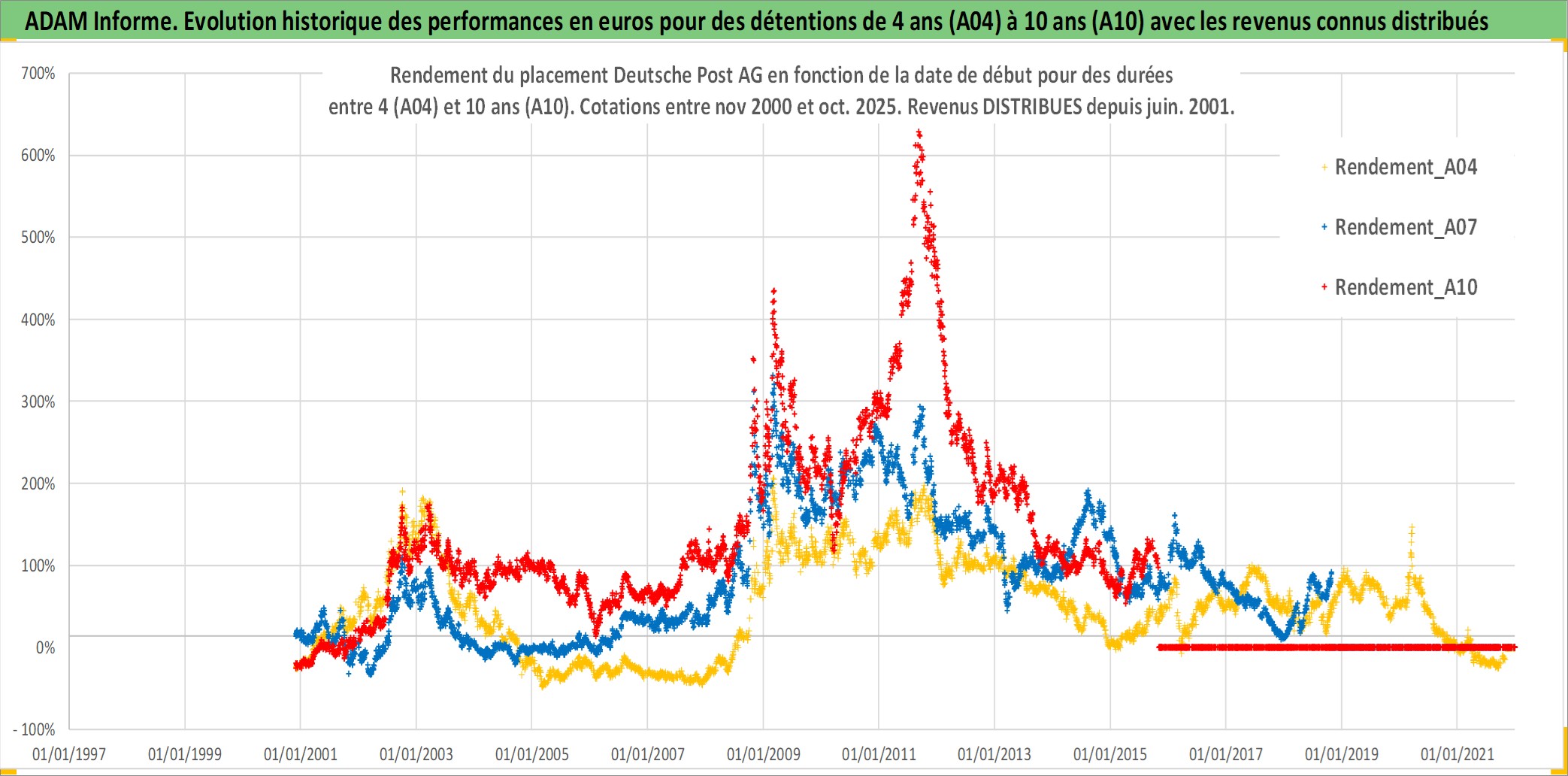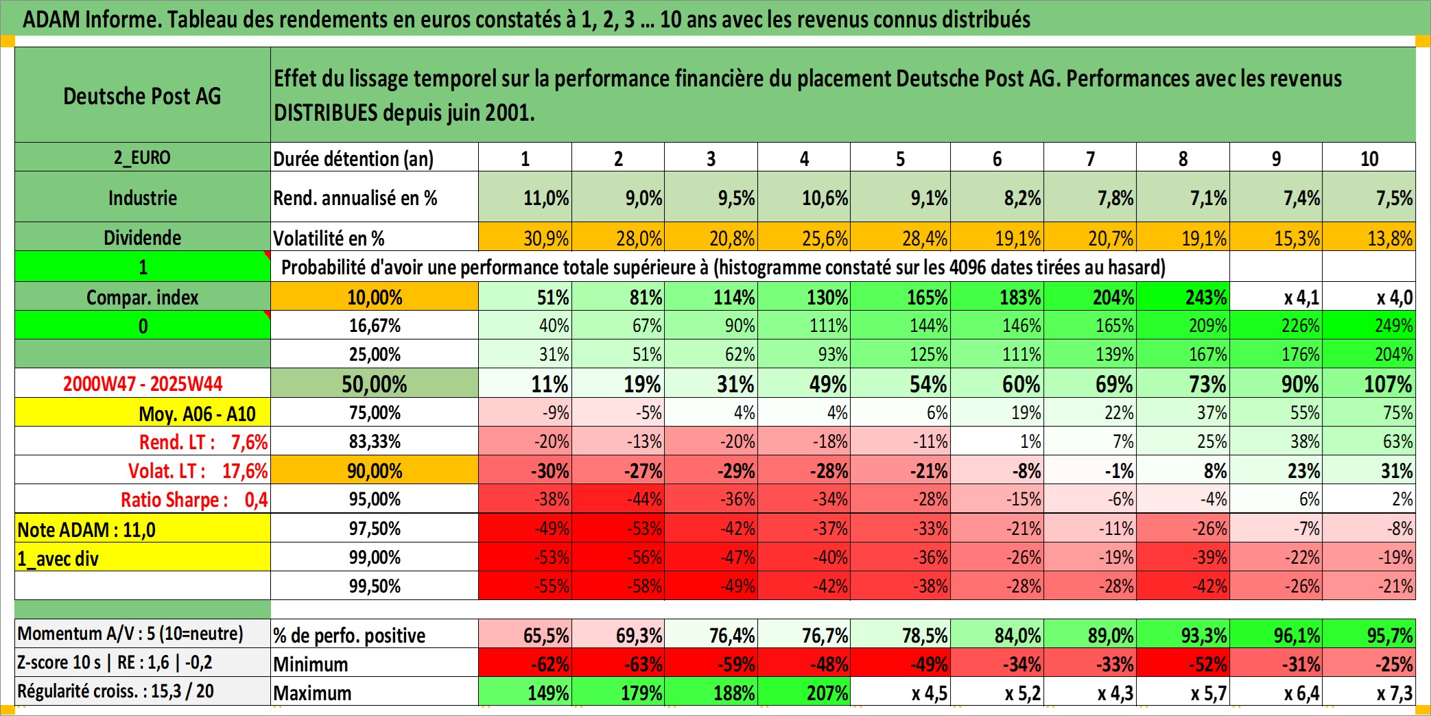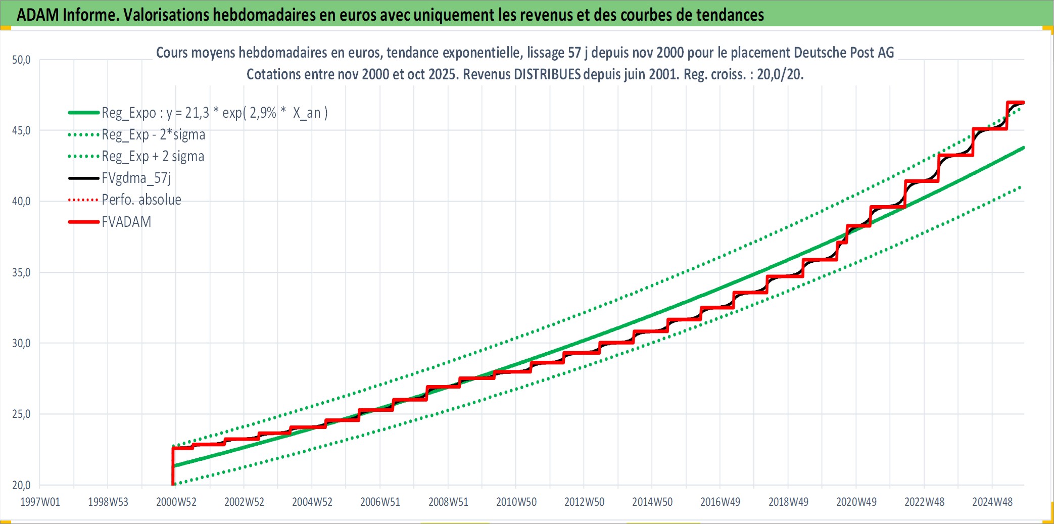 Site dédié aux investisseursPage dédiée sur site financeAnalyse des valorisations hebdomadaires de l'action Deutsche Post AG. Cet actif est cote en EUR. Les valorisations couvrent les semaines 2000W47 a 2025W44. Les revenus de cet actif financier sont pris en compte depuis la semaine 2001W26. La note ESG de cet actif n'est pas connue.