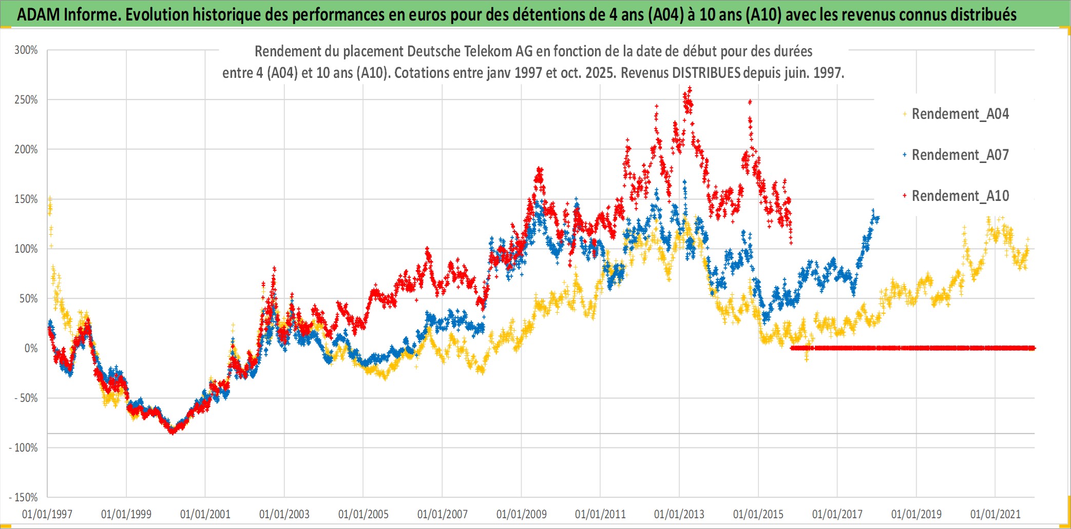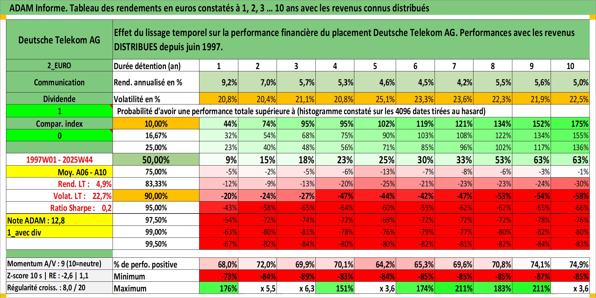 Site dédié aux investisseursPage dédiée sur site financeAnalyse des valorisations hebdomadaires de l'action Deutsche Telekom AG. Cet actif est cote en EUR. Les valorisations couvrent les semaines 1997W01 a 2025W44. Les revenus de cet actif financier sont pris en compte depuis la semaine 1997W26. La note globale ESG de cet actif est estimee a 13.0 (apres rebasage entre 0 et 20).