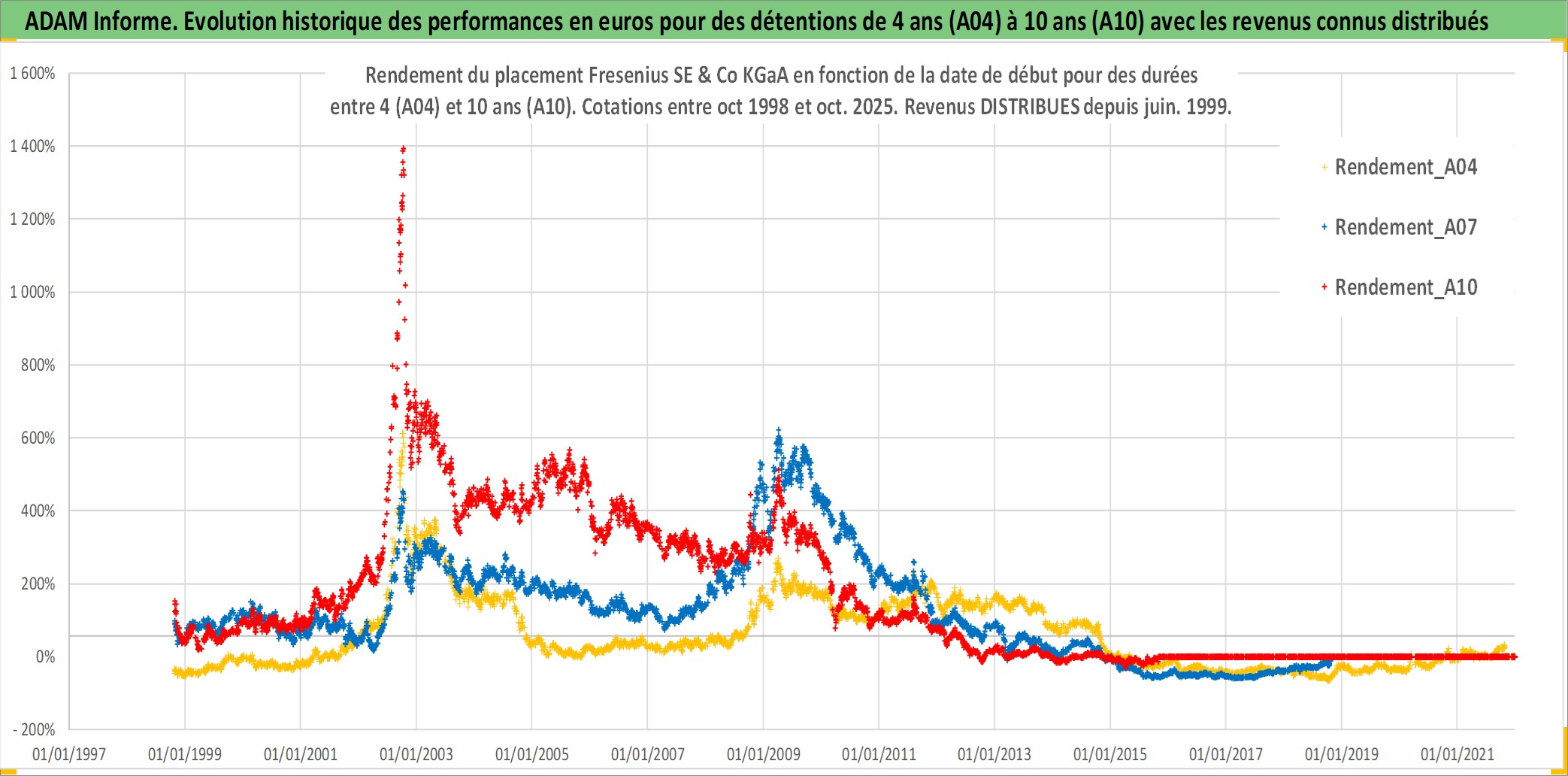 Site dédié aux investisseursPage dédiée sur site financeAnalyse des valorisations hebdomadaires de l'action Fresenius SE & Co KGaA. Cet actif est cote en EUR. Les valorisations couvrent les semaines 1998W42 a 2025W44. Les revenus de cet actif financier sont pris en compte depuis la semaine 1999W23. La note globale ESG de cet actif est estimee a 10.0 (apres rebasage entre 0 et 20).