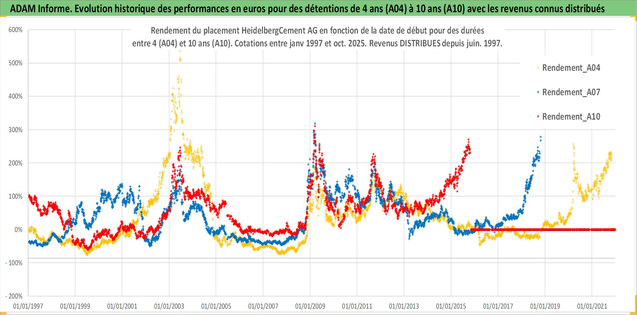 Site dédié aux investisseursPage dédiée sur site financeAnalyse des valorisations hebdomadaires de l'action HeidelbergCement AG. Cet actif est cote en EUR. Les valorisations couvrent les semaines 1997W01 a 2025W44. Les revenus de cet actif financier sont pris en compte depuis la semaine 1997W24. La note globale ESG de cet actif est estimee a 6.0 (apres rebasage entre 0 et 20).