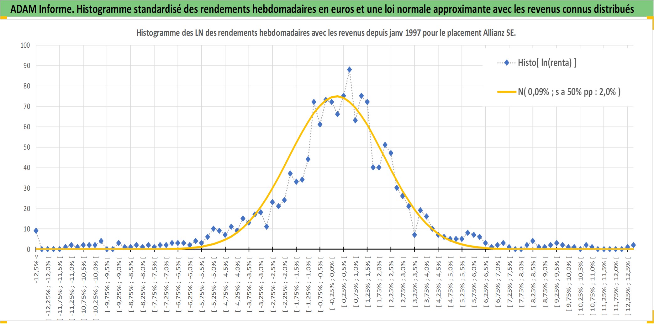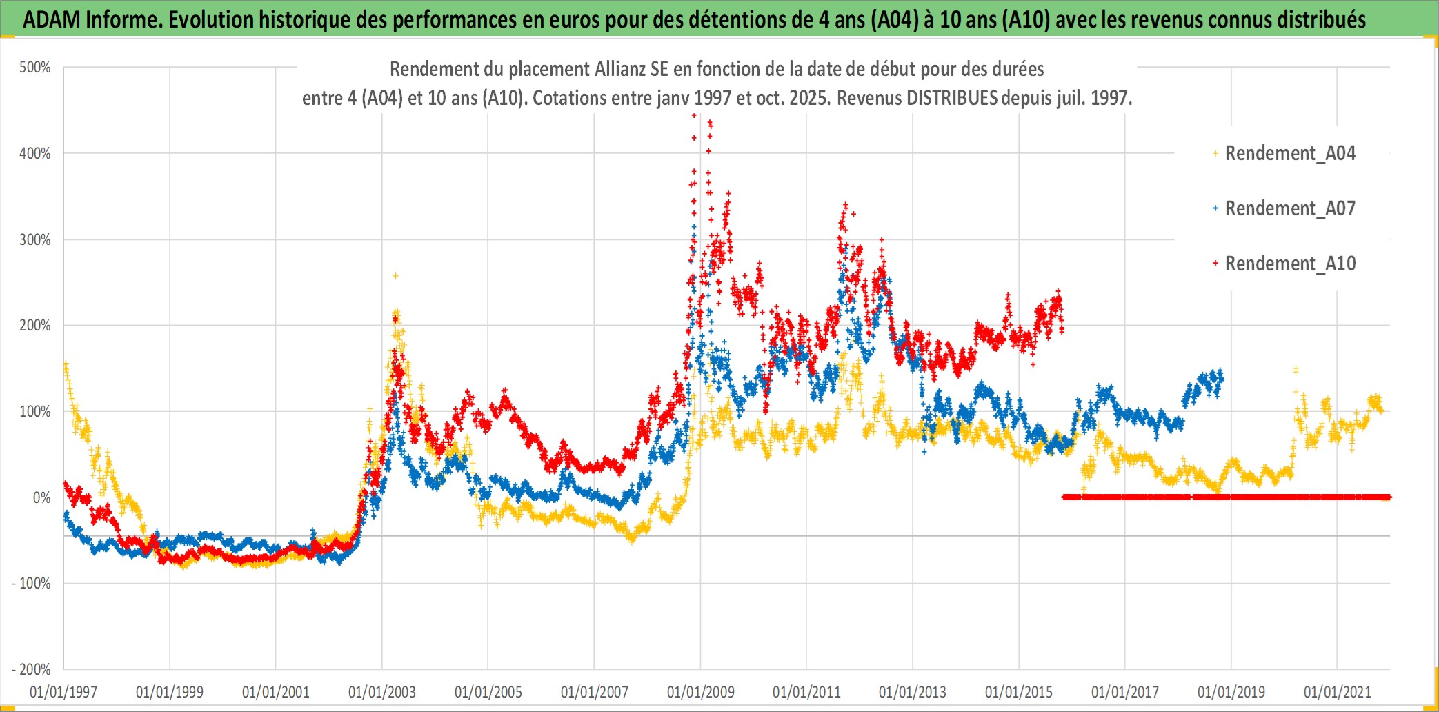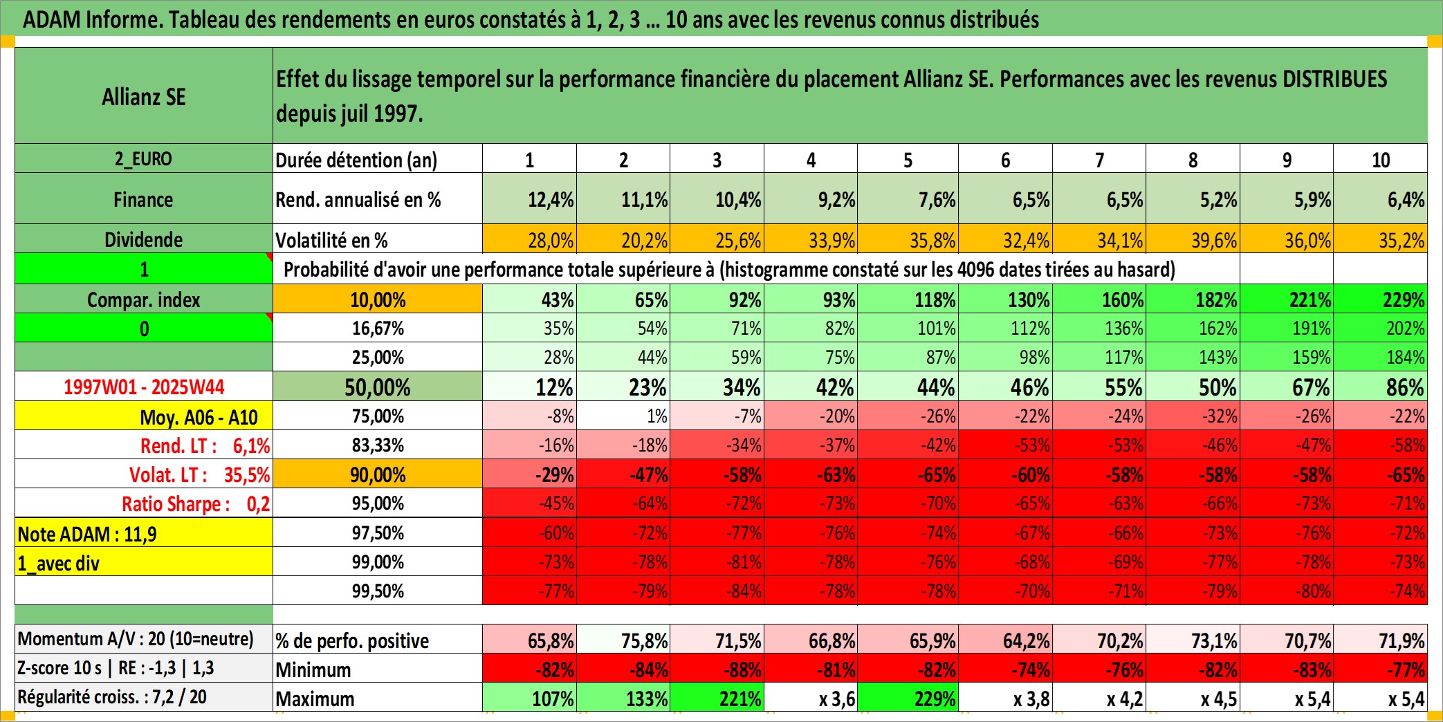 Site dédié aux investisseursPage dédiée sur site financeAnalyse des valorisations hebdomadaires de l'action Allianz SE. Cet actif est cote en EUR. Les valorisations couvrent les semaines 1997W01 a 2025W44. Les revenus de cet actif financier sont pris en compte depuis la semaine 1997W28. La note globale ESG de cet actif est estimee a 12.0 (apres rebasage entre 0 et 20).
