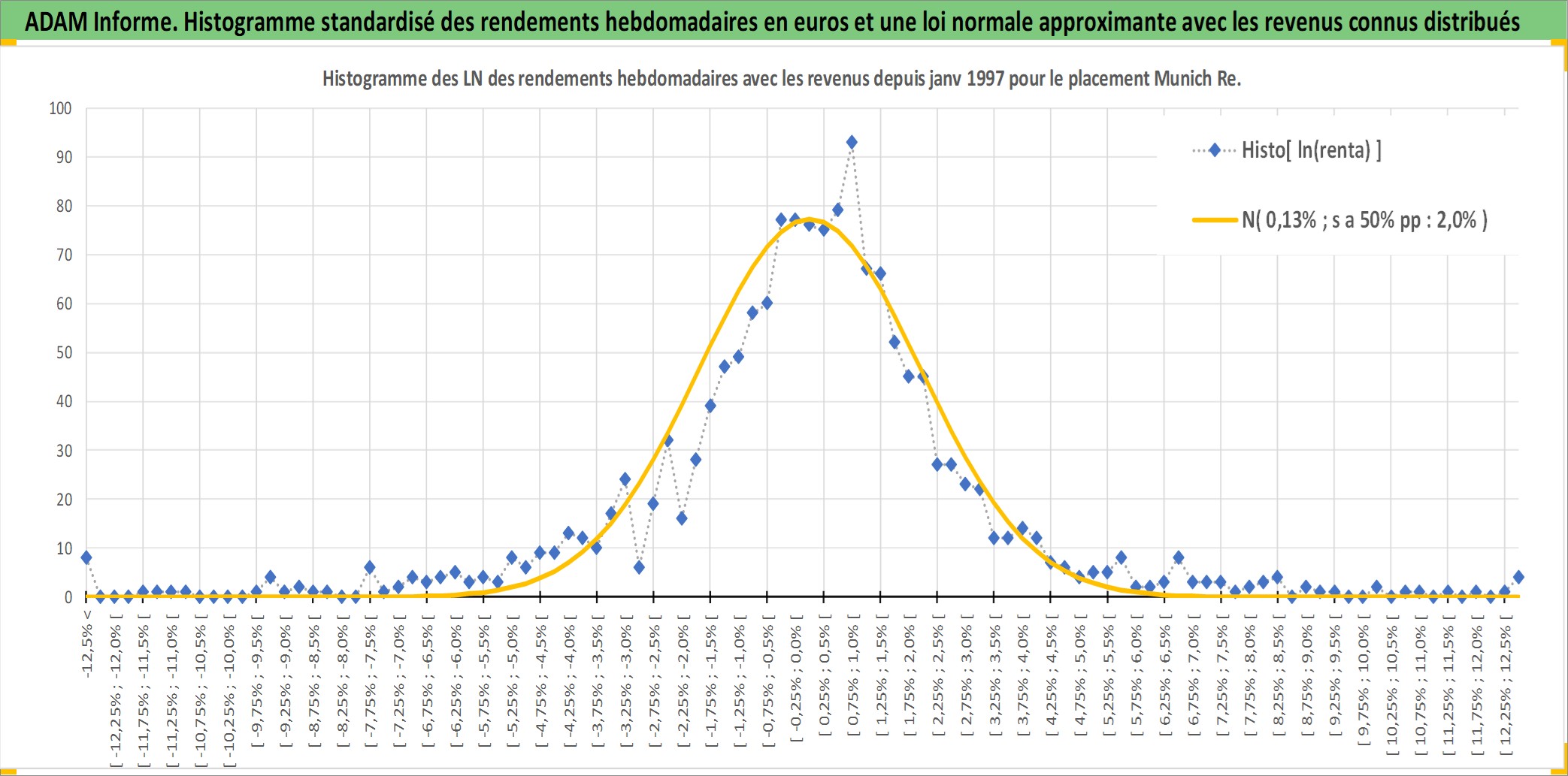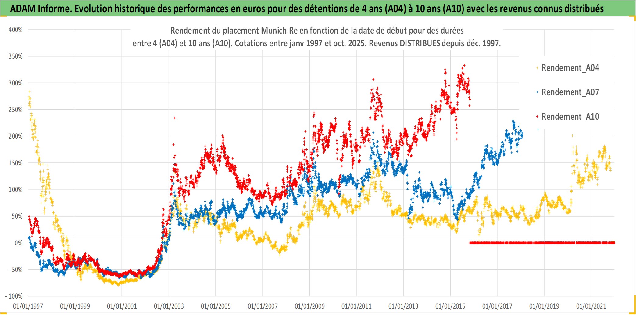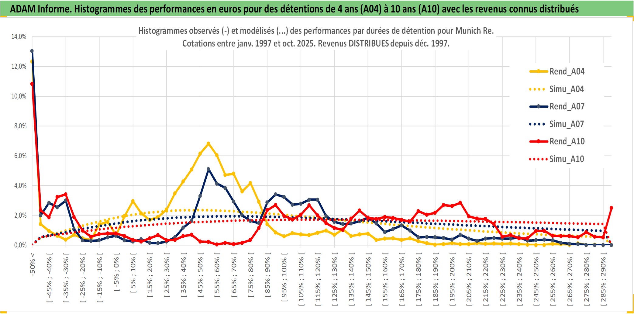 Site dédié aux investisseursPage dédiée sur site financeAnalyse des valorisations hebdomadaires de l'action Munich Re. Cet actif est cote en EUR. Les valorisations couvrent les semaines 1997W01 a 2025W44. Les revenus de cet actif financier sont pris en compte depuis la semaine 1997W50. La note globale ESG de cet actif est estimee a 11.0 (apres rebasage entre 0 et 20).