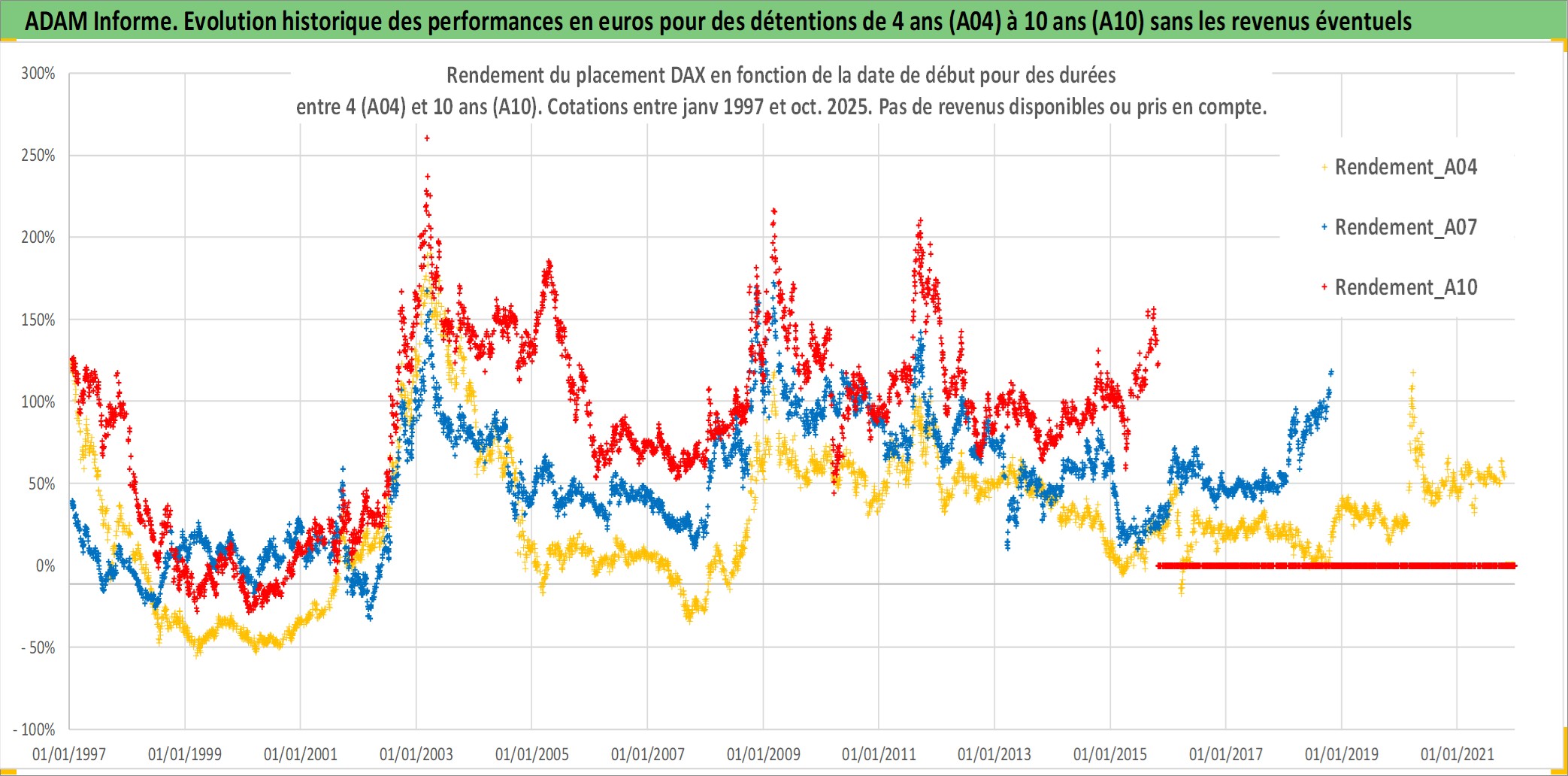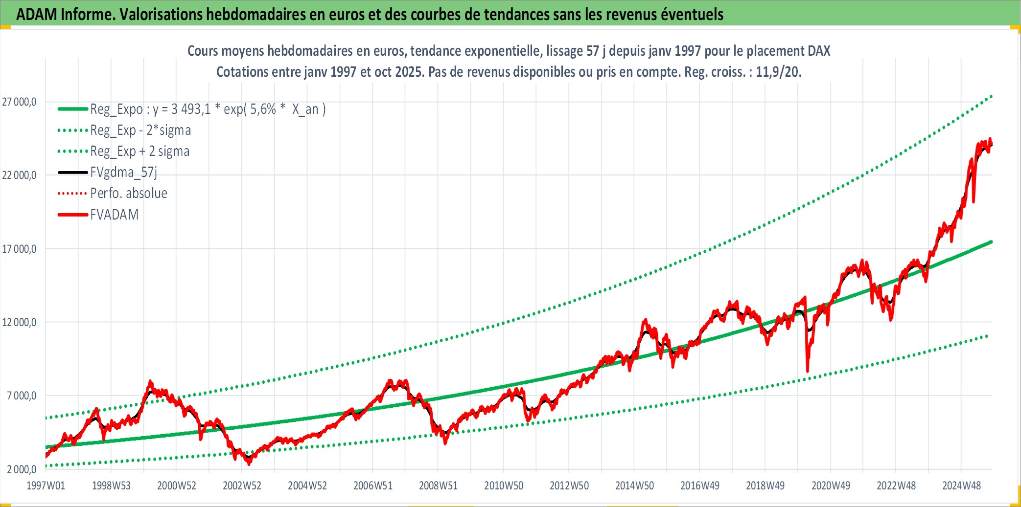 Site dédié aux investisseursPage dédiée sur site financeAnalyse des valorisations hebdomadaires de l'actif DAX. Cet actif est cote en EUR. Les valorisations couvrent les semaines 1997W01 a 2025W44. Les revenus de cet actif financier ne sont pas connus car non existants ou non disponibles sur le site Yahoo Finance. La note ESG de cet actif n'est pas connue.