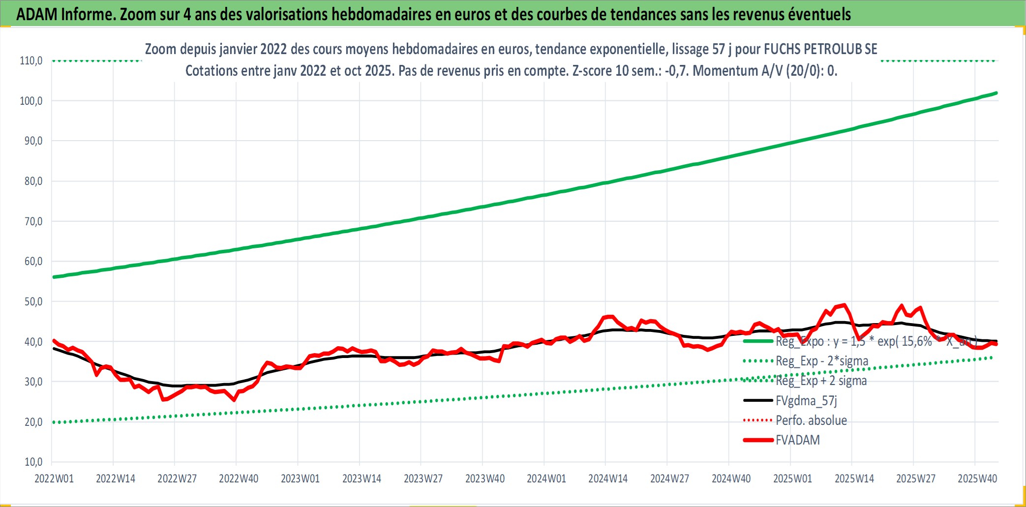 Site dédié aux investisseursPage dédiée sur site financeAnalyse des valorisations hebdomadaires de l'action FUCHS PETROLUB SE. Cet actif est cote en EUR. Les valorisations couvrent les semaines 1998W43 a 2025W44. Les revenus de cet actif financier sont pris en compte depuis la semaine 1999W26. La note globale ESG de cet actif est estimee a 8.0 (apres rebasage entre 0 et 20).