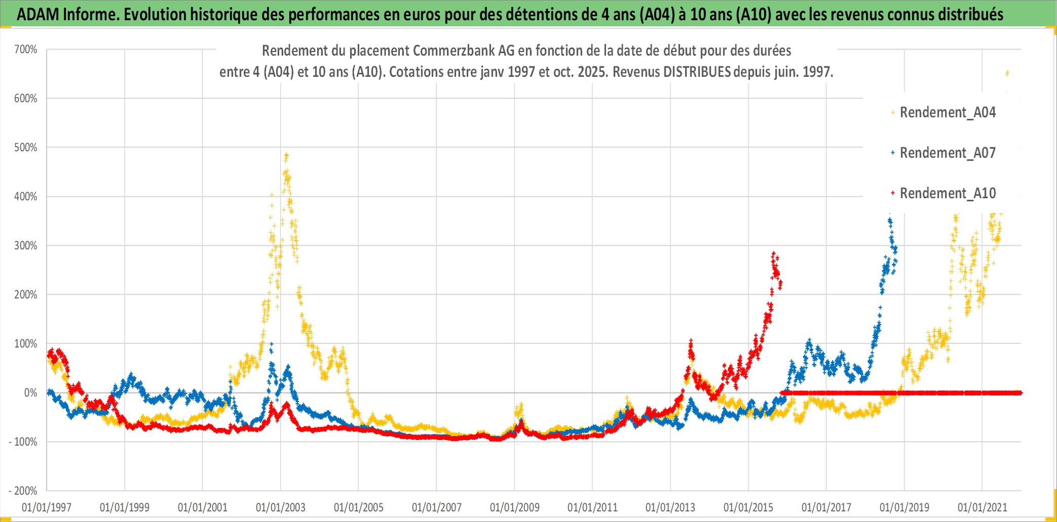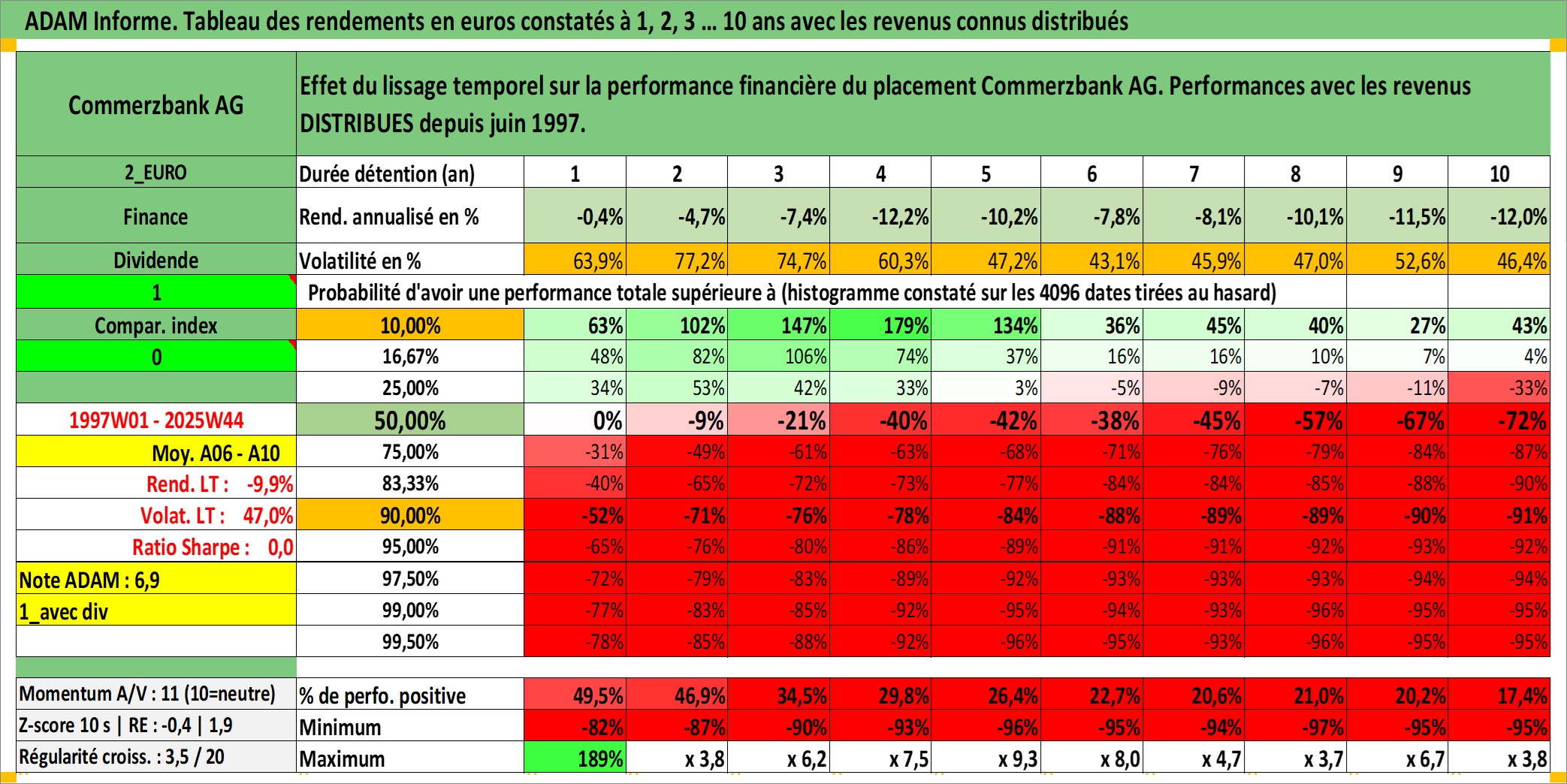 Site dédié aux investisseursPage dédiée sur site financeAnalyse des valorisations hebdomadaires de l'action Commerzbank AG. Cet actif est cote en EUR. Les valorisations couvrent les semaines 1997W01 a 2025W44. Les revenus de cet actif financier sont pris en compte depuis la semaine 1997W23. La note globale ESG de cet actif est estimee a 10.0 (apres rebasage entre 0 et 20).