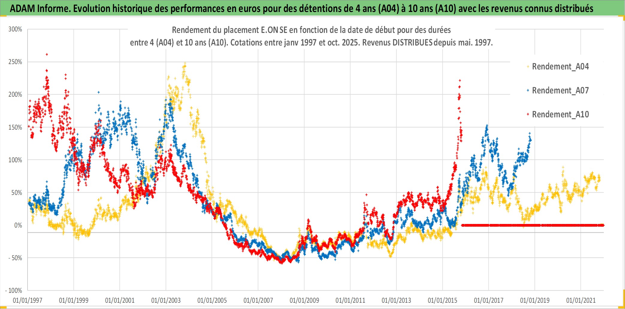 Site dédié aux investisseursPage dédiée sur site financeAnalyse des valorisations hebdomadaires de l'action E.ON SE. Cet actif est cote en EUR. Les valorisations couvrent les semaines 1997W01 a 2025W44. Les revenus de cet actif financier sont pris en compte depuis la semaine 1997W21. La note globale ESG de cet actif est estimee a 8.0 (apres rebasage entre 0 et 20).