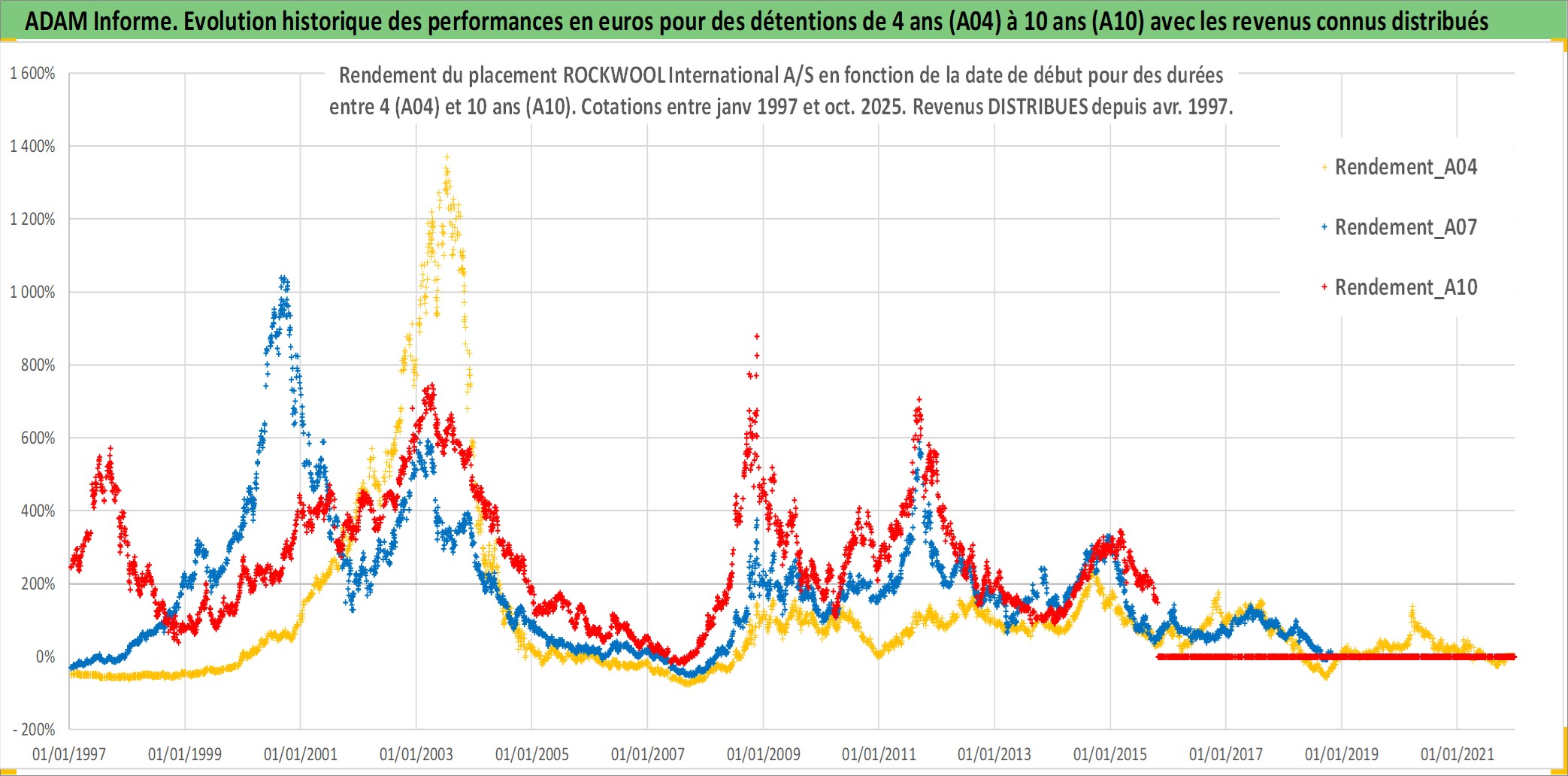 Site dédié aux investisseursPage dédiée sur site financeAnalyse des valorisations hebdomadaires de l'action ROCKWOOL International A/S. Cet actif est cote en DKK. Les valorisations sont en contrevaleur EURO et couvrent les semaines 1997W01 a 2025W44. Les revenus de cet actif financier sont pris en compte depuis la semaine 1997W18. La note ESG de cet actif n'est pas connue.