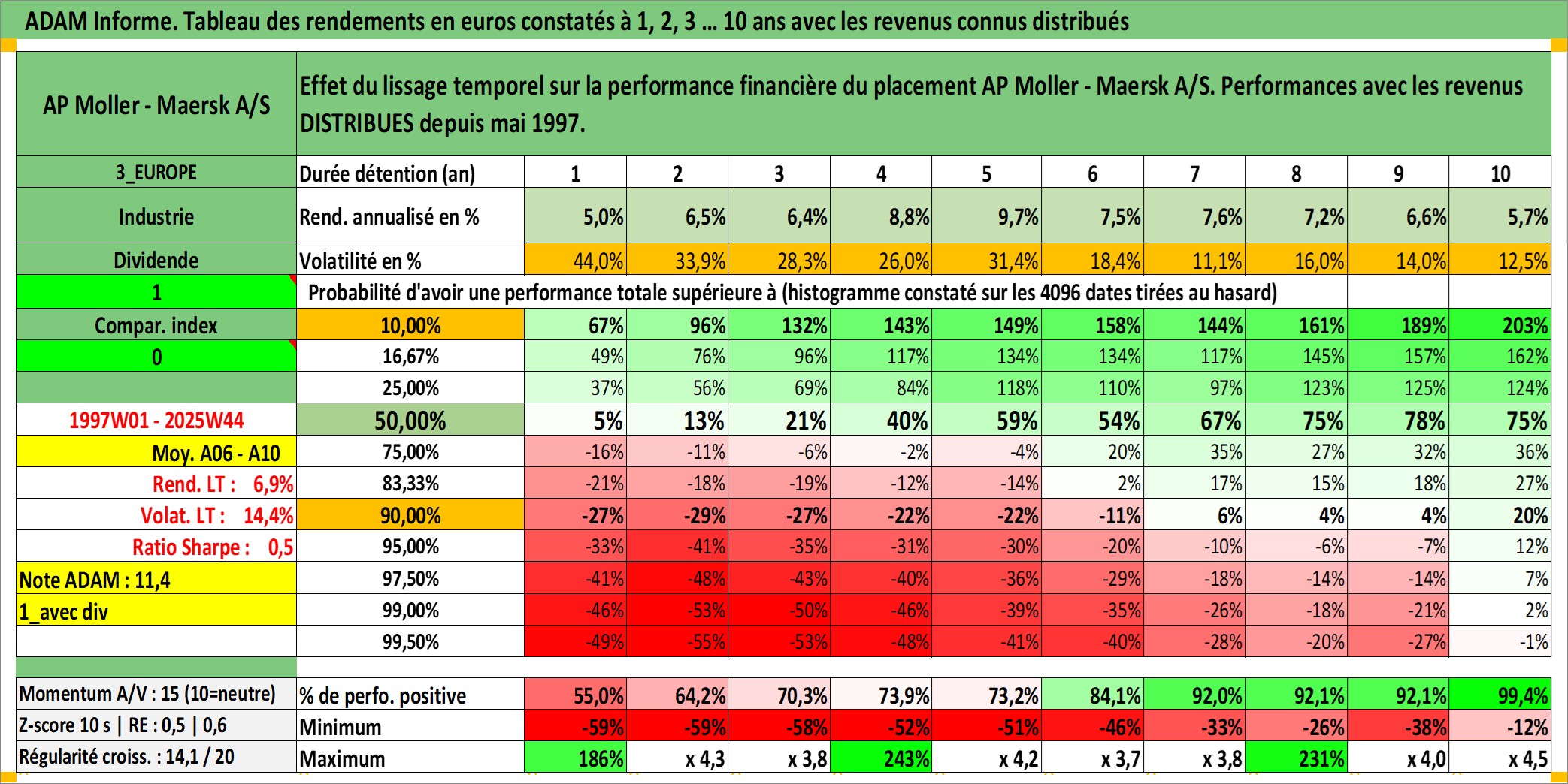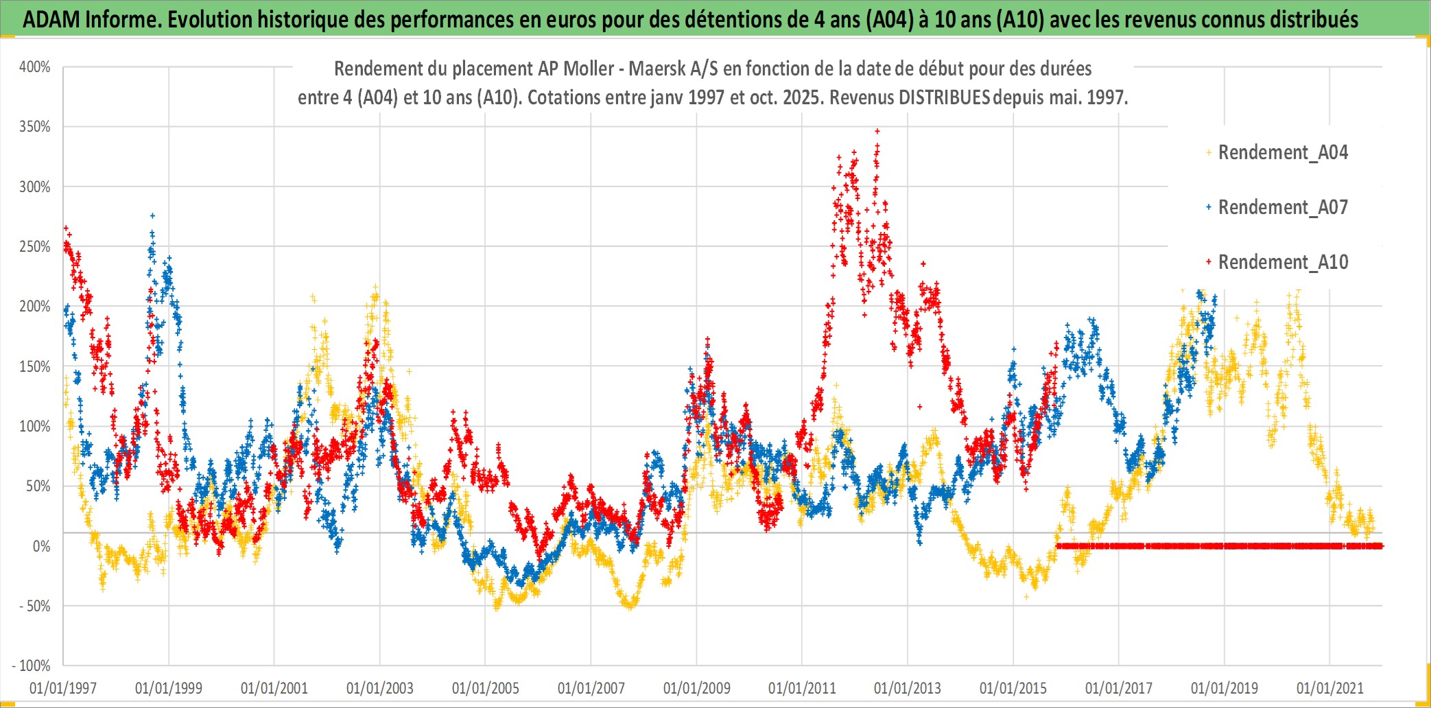 Site dédié aux investisseursPage dédiée sur site financeAnalyse des valorisations hebdomadaires de l'action AP Moller - Maersk A/S. Cet actif est cote en DKK. Les valorisations sont en contrevaleur EURO et couvrent les semaines 1997W01 a 2025W44. Les revenus de cet actif financier sont pris en compte depuis la semaine 1997W20. La note globale ESG de cet actif est estimee a 9.0 (apres rebasage entre 0 et 20).
