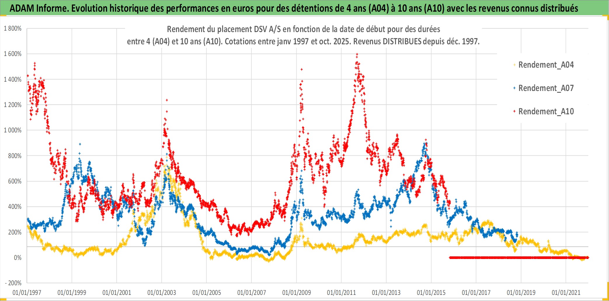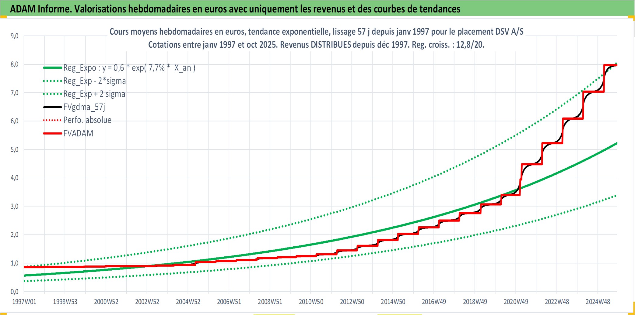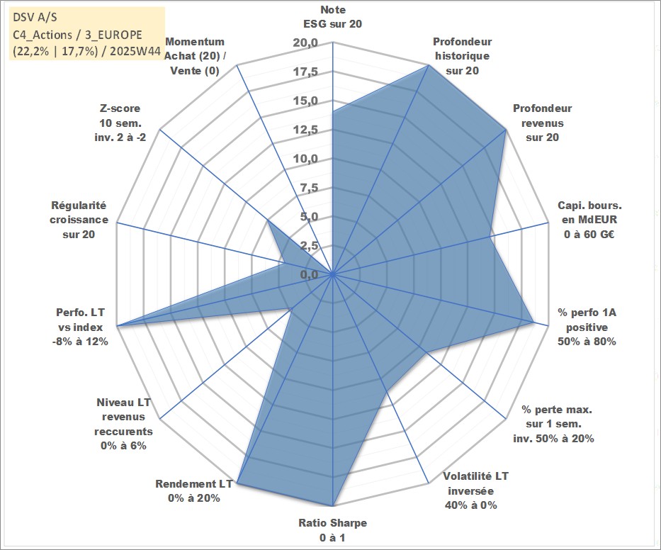 Site dédié aux investisseursPage dédiée sur site financeAnalyse des valorisations hebdomadaires de l'action DSV A/S. Cet actif est cote en DKK. Les valorisations sont en contrevaleur EURO et couvrent les semaines 1997W01 a 2025W44. Les revenus de cet actif financier sont pris en compte depuis la semaine 1997W51. La note globale ESG de cet actif est estimee a 14.0 (apres rebasage entre 0 et 20).