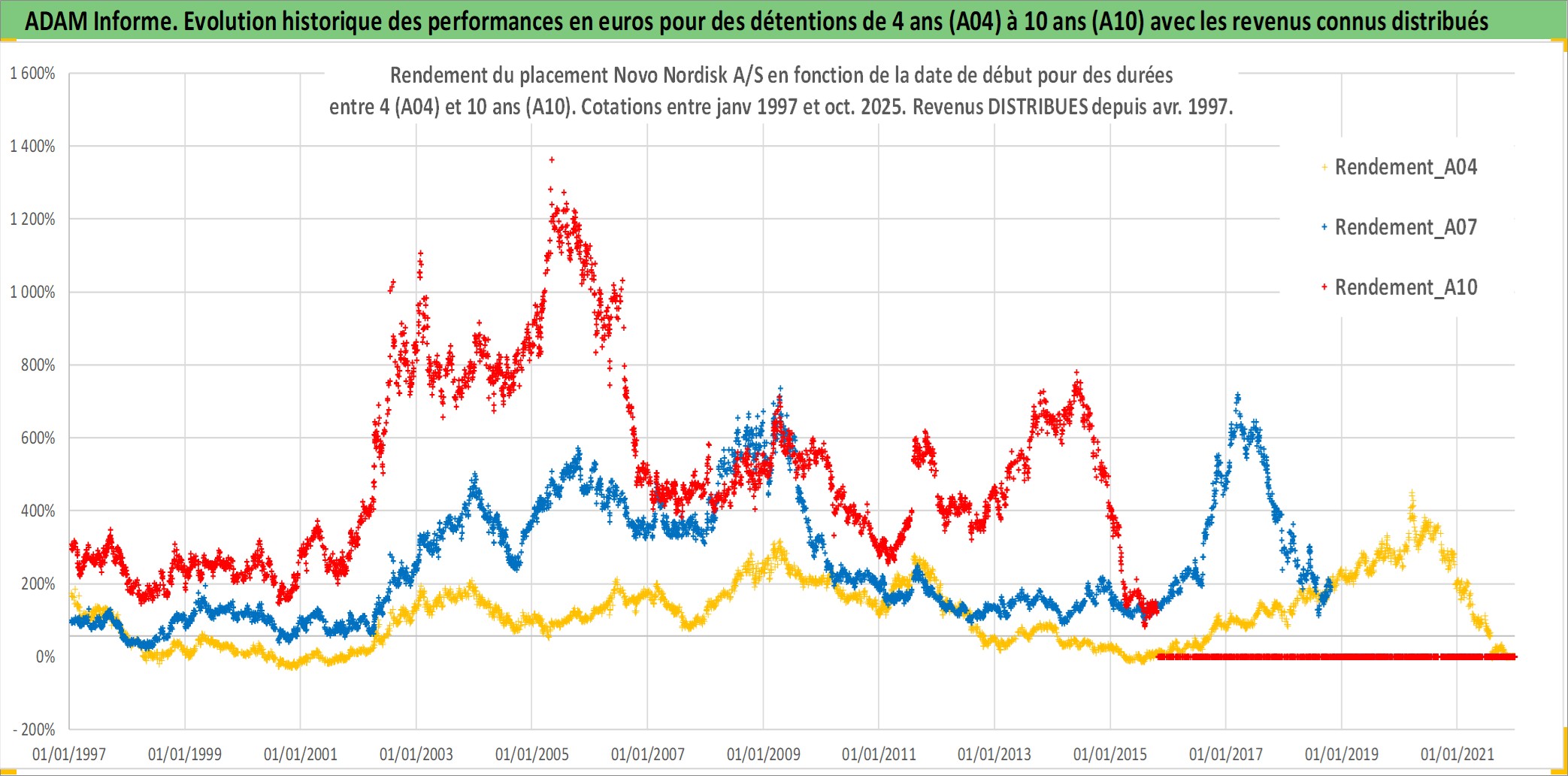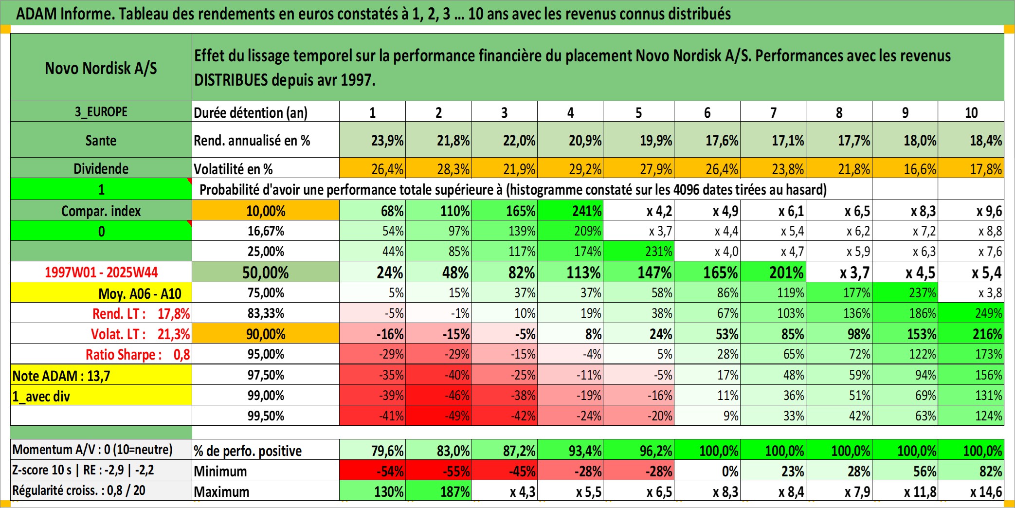 Site dédié aux investisseursPage dédiée sur site financeAnalyse des valorisations hebdomadaires de l'action Novo Nordisk A/S. Cet actif est cote en DKK. Les valorisations sont en contrevaleur EURO et couvrent les semaines 1997W01 a 2025W44. Les revenus de cet actif financier sont pris en compte depuis la semaine 1997W17. La note globale ESG de cet actif est estimee a 8.0 (apres rebasage entre 0 et 20).