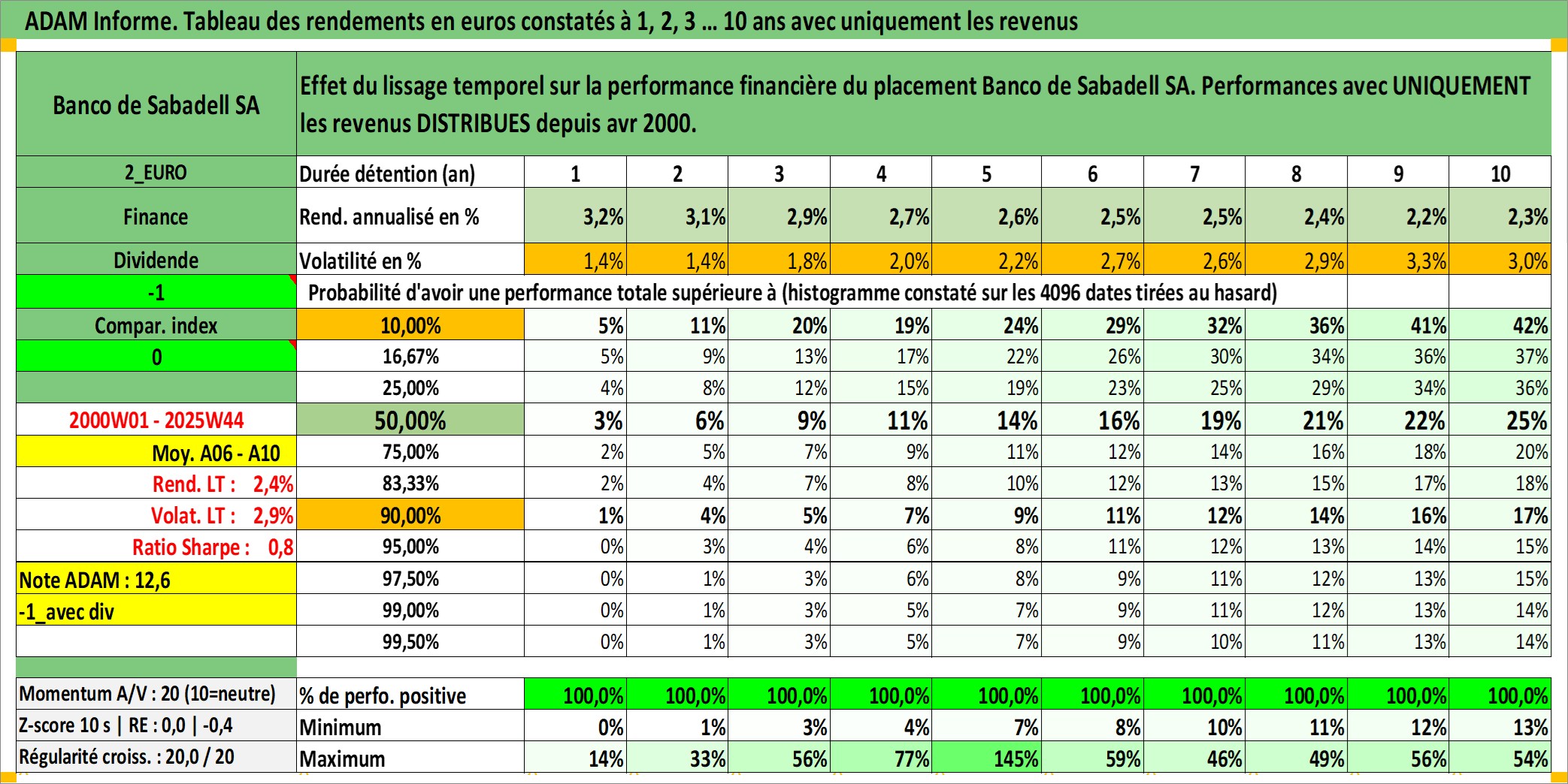 Site dédié aux investisseursPage dédiée sur site financeAnalyse des valorisations hebdomadaires de l'action Banco de Sabadell SA. Cet actif est cote en EUR. Les valorisations couvrent les semaines 2000W01 a 2025W44. Les revenus de cet actif financier sont pris en compte depuis la semaine 2000W16. La note globale ESG de cet actif est estimee a 11.0 (apres rebasage entre 0 et 20).