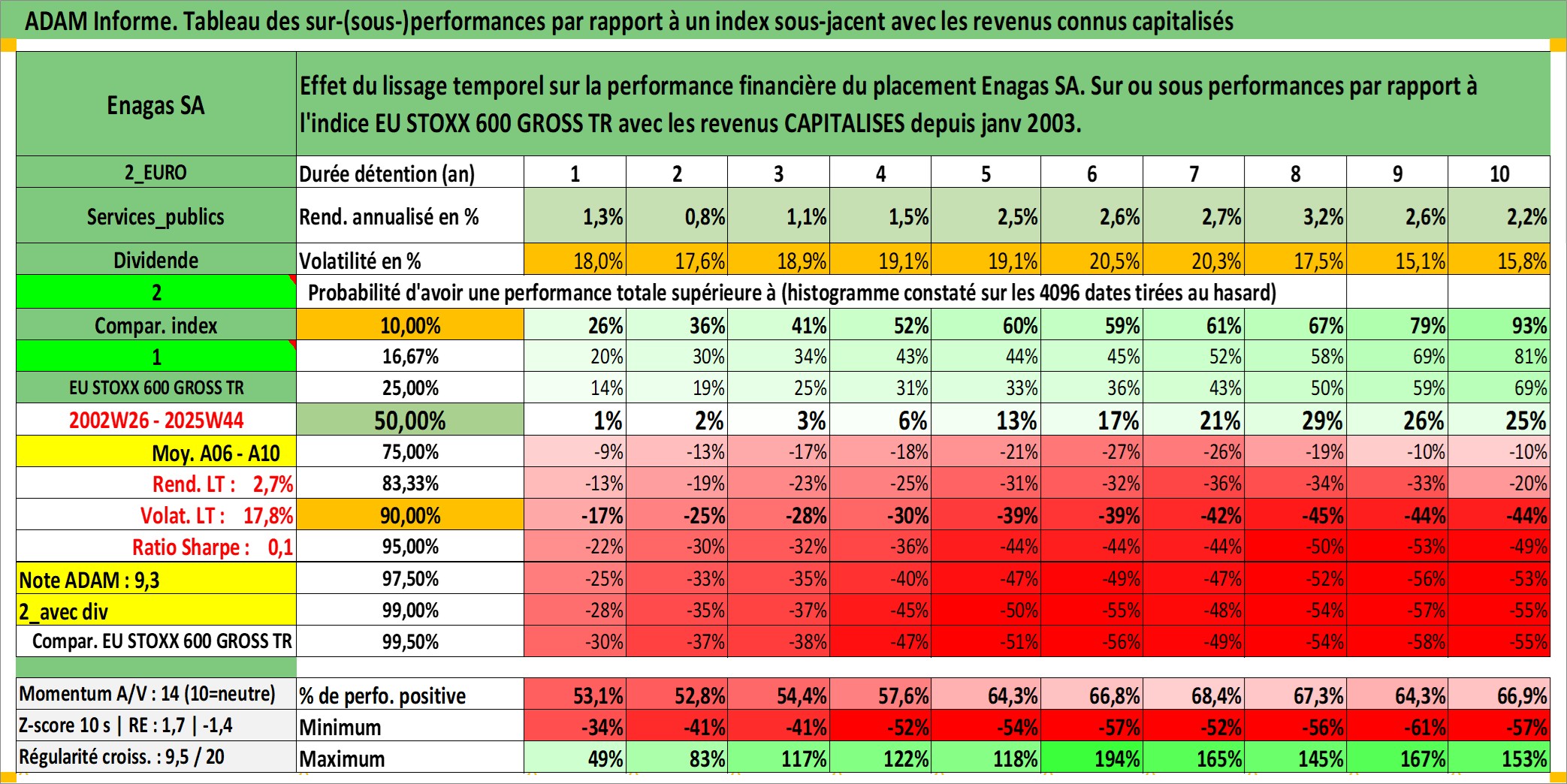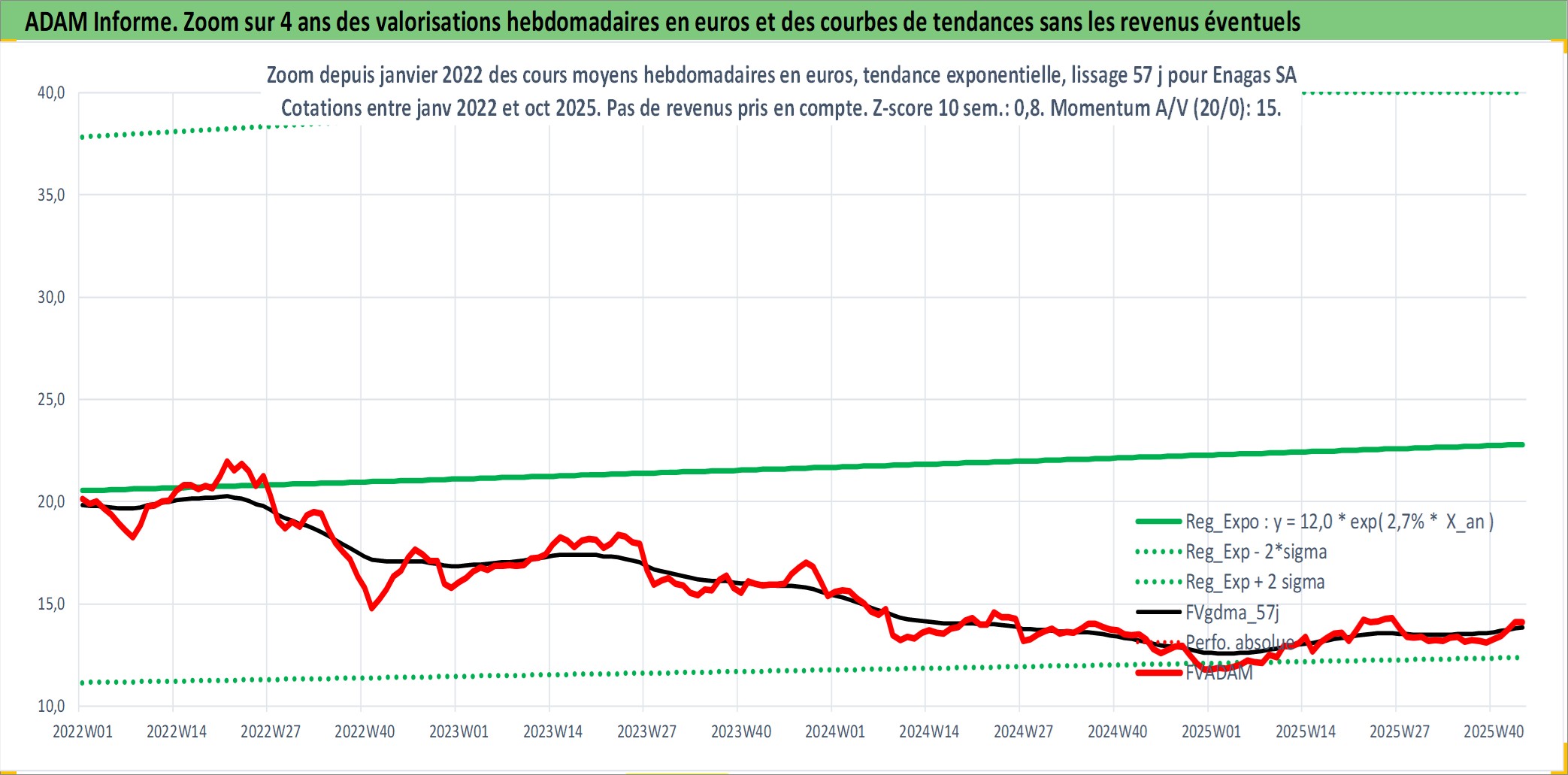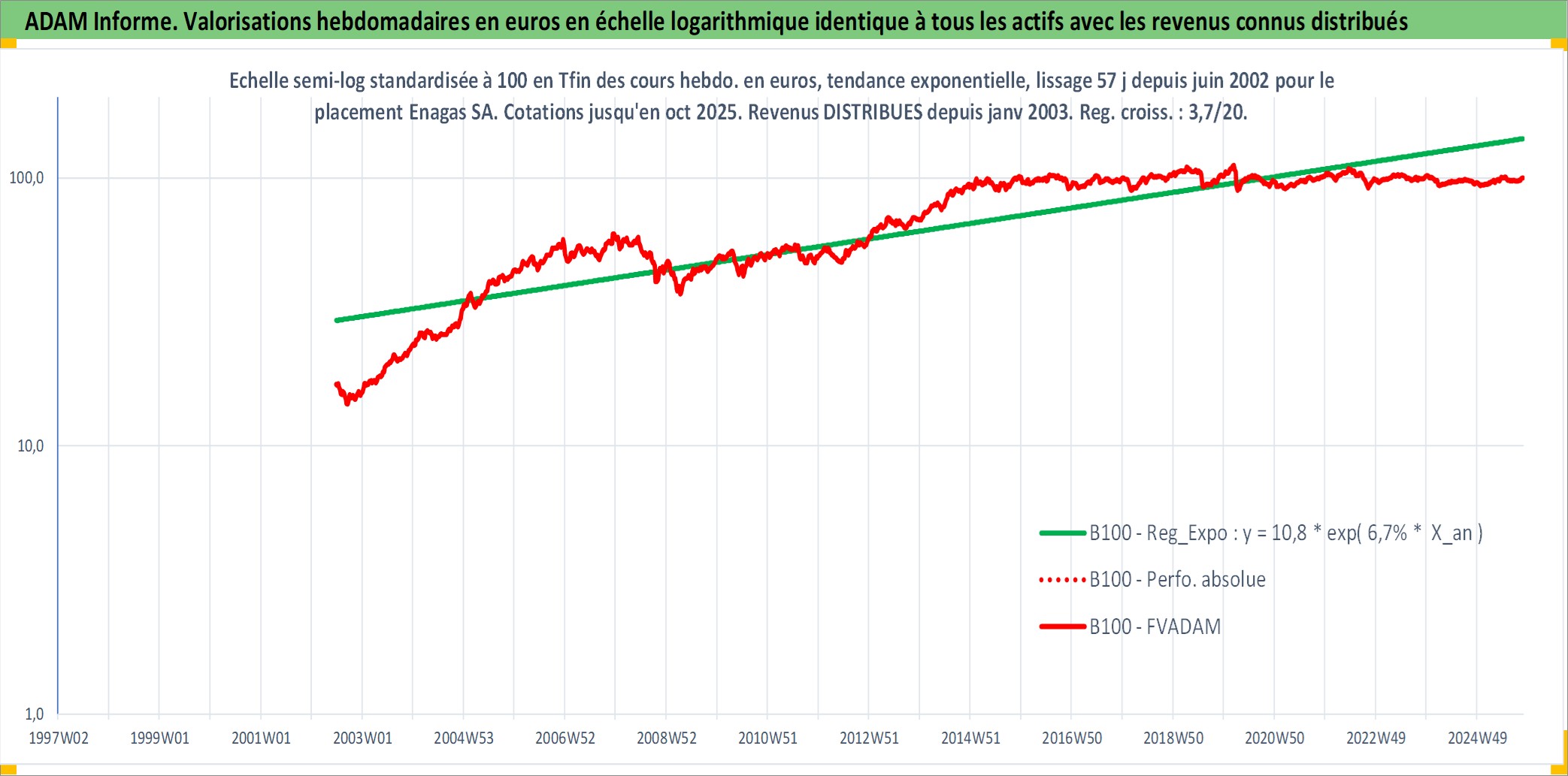 Site dédié aux investisseursPage dédiée sur site financeAnalyse des valorisations hebdomadaires de l'action Enagas SA. Cet actif est cote en EUR. Les valorisations couvrent les semaines 2002W26 a 2025W44. Les revenus de cet actif financier sont pris en compte depuis la semaine 2003W03. La note globale ESG de cet actif est estimee a 13.0 (apres rebasage entre 0 et 20).