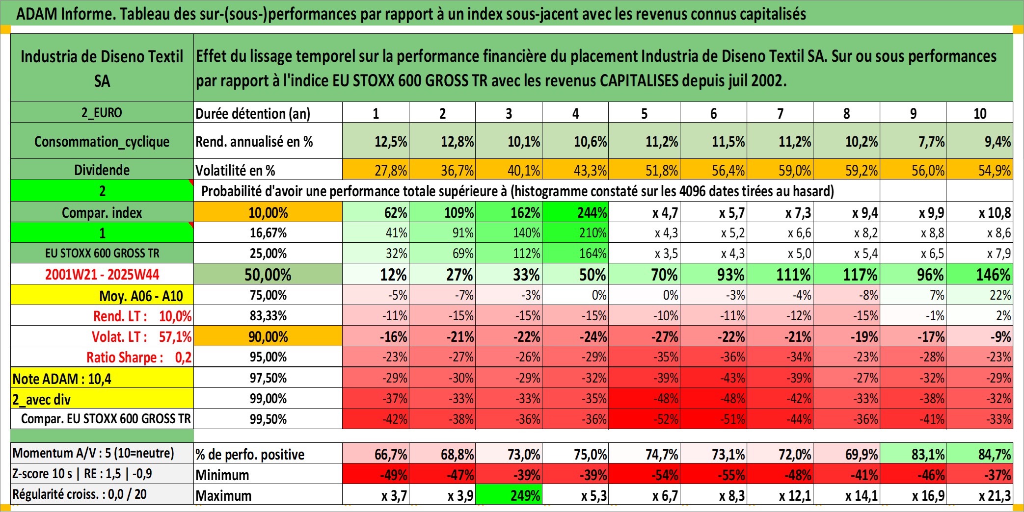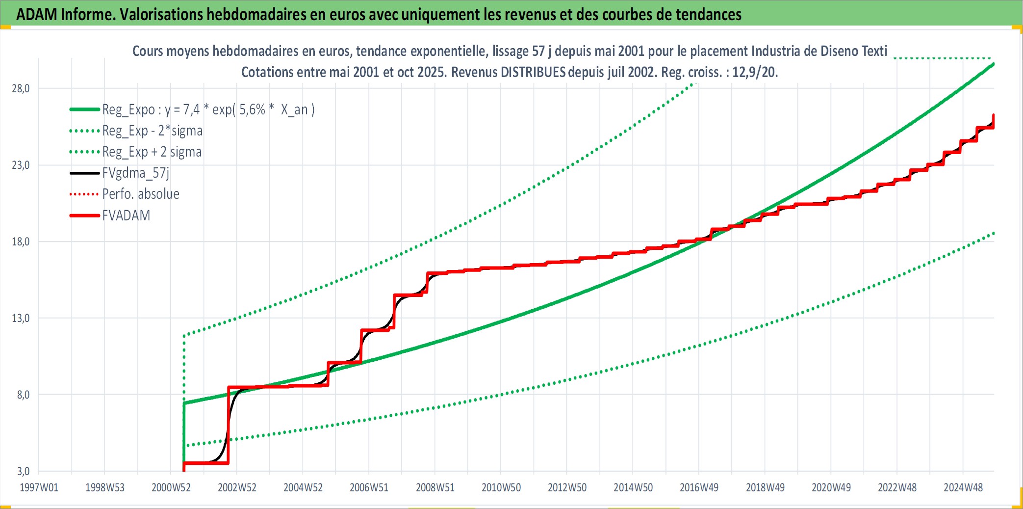 Site dédié aux investisseursPage dédiée sur site financeAnalyse des valorisations hebdomadaires de l'action Industria de Diseno Textil SA. Cet actif est cote en EUR. Les valorisations couvrent les semaines 2001W21 a 2025W44. Les revenus de cet actif financier sont pris en compte depuis la semaine 2002W30. La note globale ESG de cet actif est estimee a 15.0 (apres rebasage entre 0 et 20).