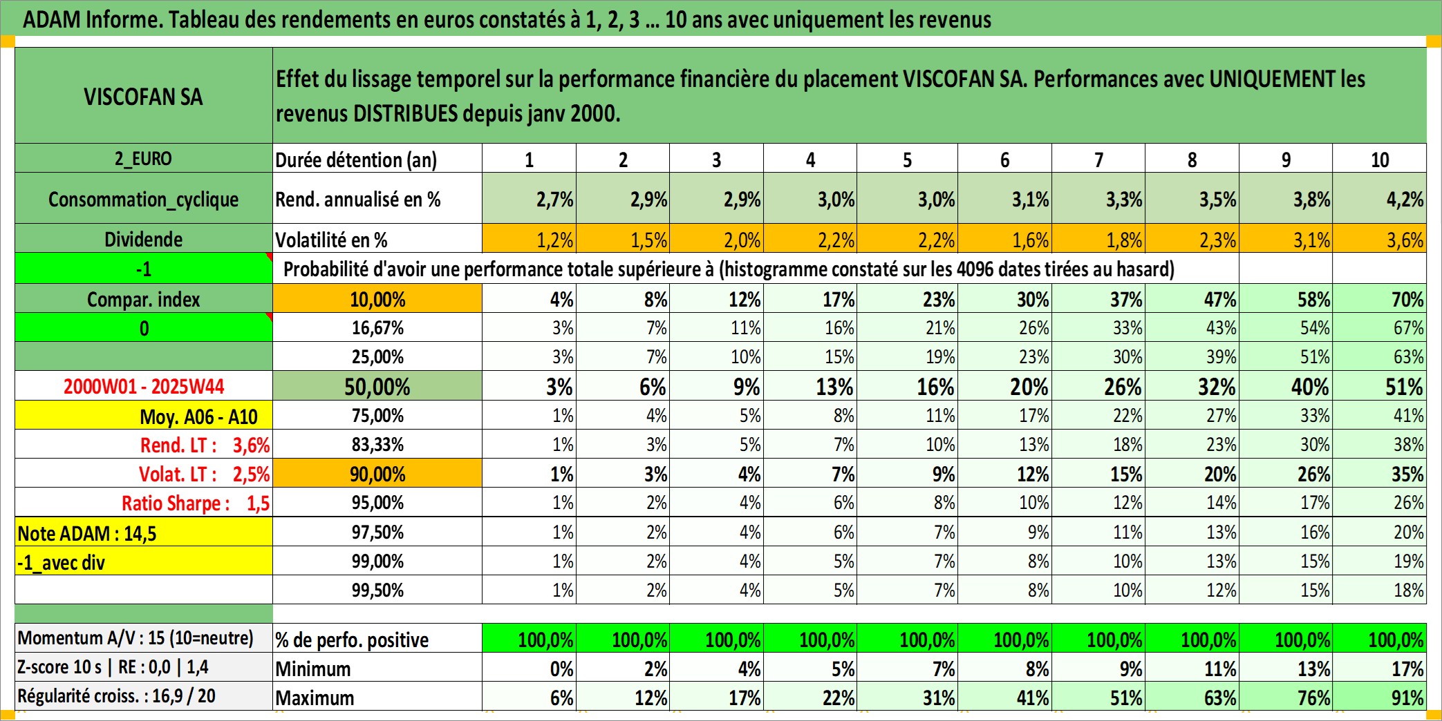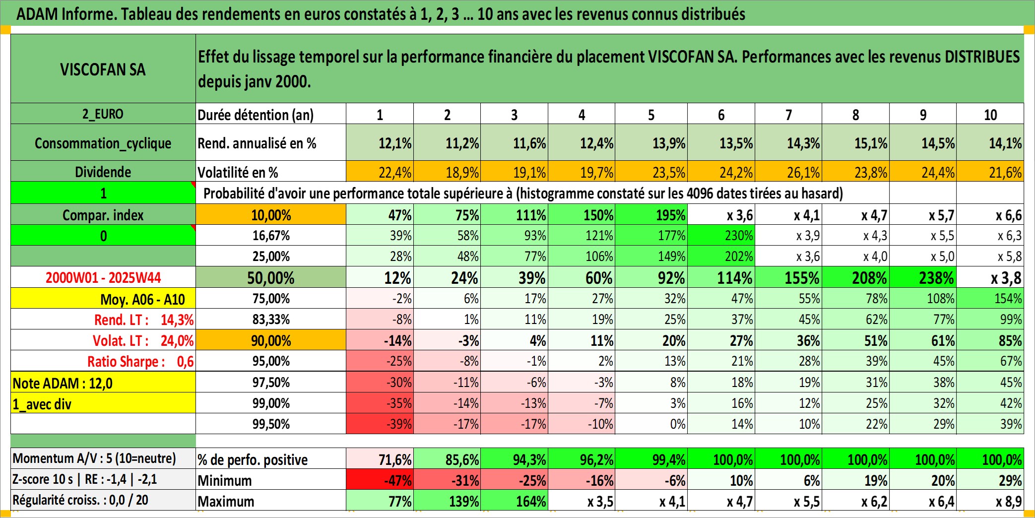 Site dédié aux investisseursPage dédiée sur site financeAnalyse des valorisations hebdomadaires de l'action VISCOFAN SA. Cet actif est cote en EUR. Les valorisations couvrent les semaines 2000W01 a 2025W44. Les revenus de cet actif financier sont pris en compte depuis la semaine 2000W05. La note ESG de cet actif n'est pas connue.
