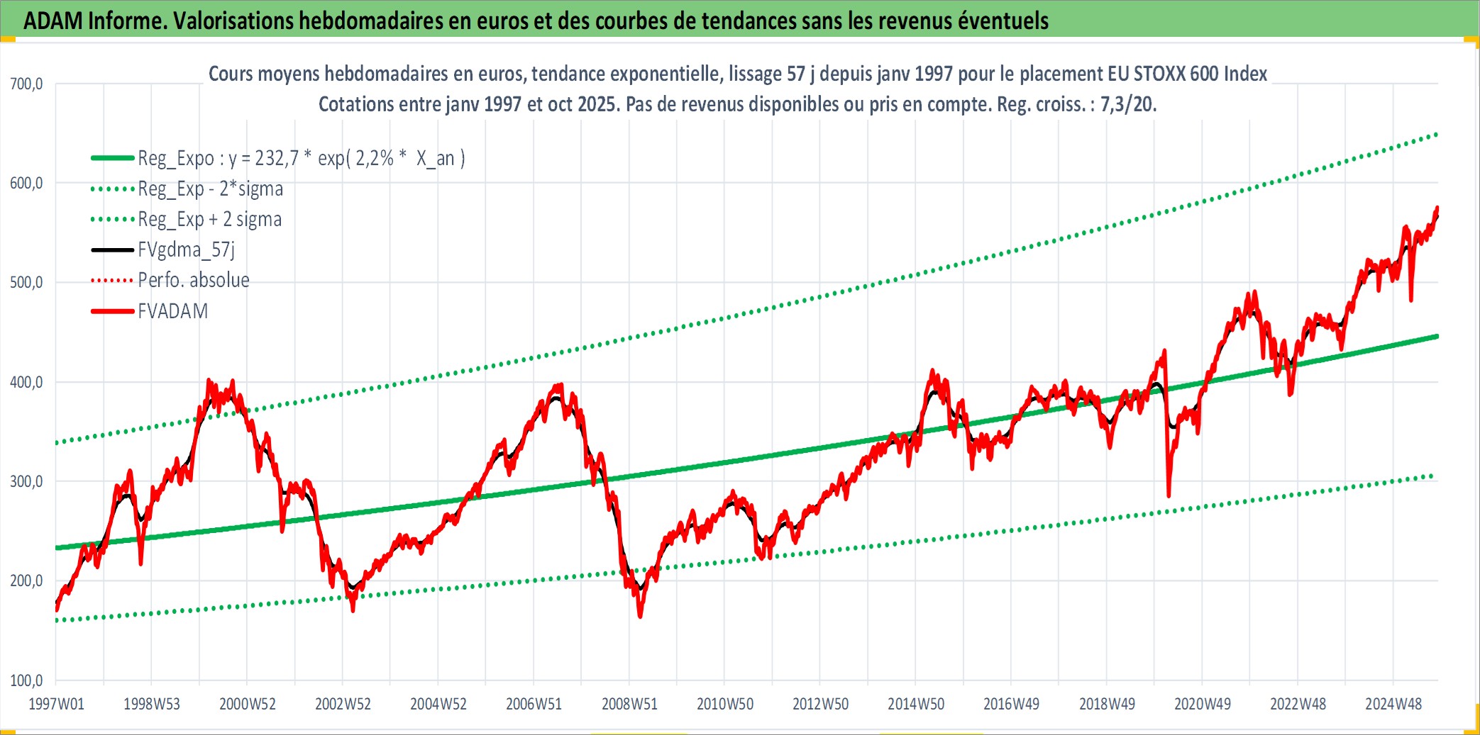 Site dédié aux investisseursPage dédiée sur site financeAnalyse des valorisations hebdomadaires de l'actif EU STOXX 600 Index. Cet actif est cote en EUR. Les valorisations couvrent les semaines 1997W01 a 2025W44. Les revenus de cet actif financier ne sont pas connus car non existants ou non disponibles sur le site Yahoo Finance. La note ESG de cet actif n'est pas connue.