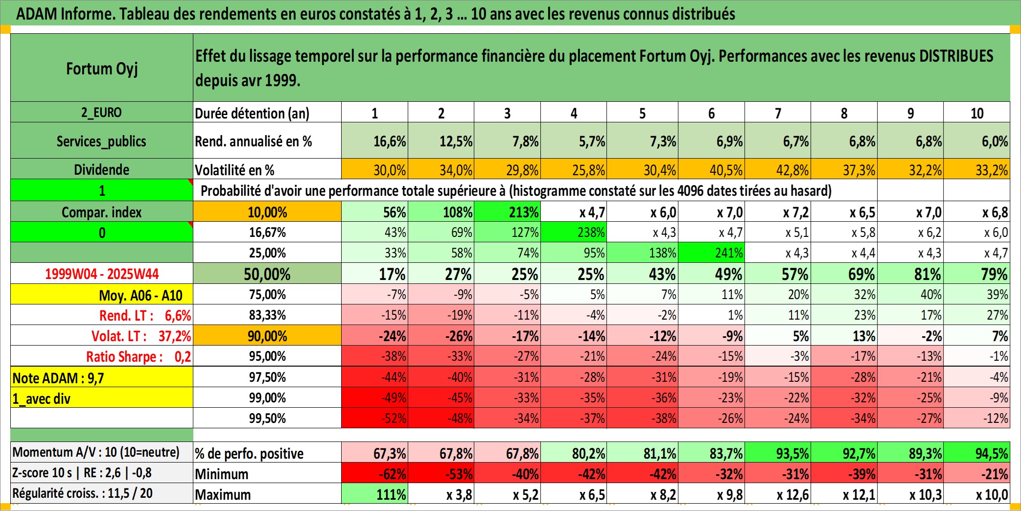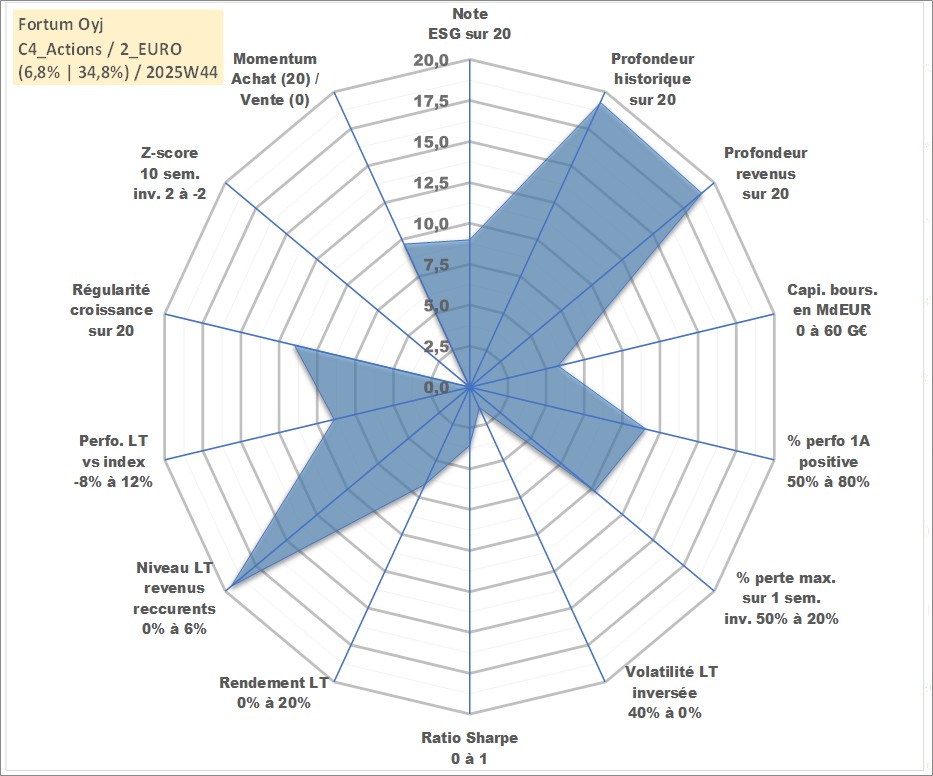 Site dédié aux investisseursPage dédiée sur site financeAnalyse des valorisations hebdomadaires de l'action Fortum Oyj. Cet actif est cote en EUR. Les valorisations couvrent les semaines 1999W04 a 2025W44. Les revenus de cet actif financier sont pris en compte depuis la semaine 1999W16. La note globale ESG de cet actif est estimee a 9.0 (apres rebasage entre 0 et 20).