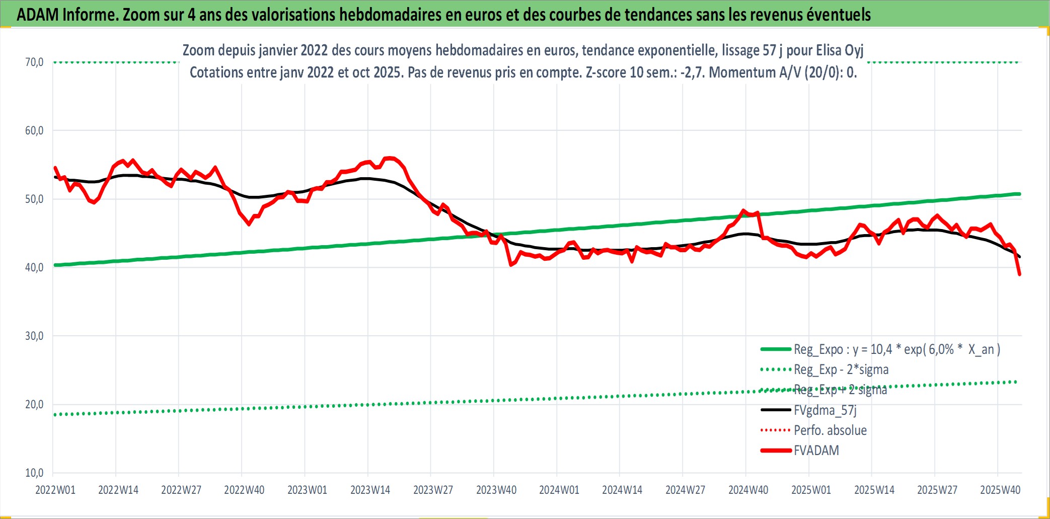 Site dédié aux investisseursPage dédiée sur site financeAnalyse des valorisations hebdomadaires de l'action Elisa Oyj. Cet actif est cote en EUR. Les valorisations couvrent les semaines 1999W32 a 2025W44. Les revenus de cet actif financier sont pris en compte depuis la semaine 2000W15. La note globale ESG de cet actif est estimee a 11.0 (apres rebasage entre 0 et 20).