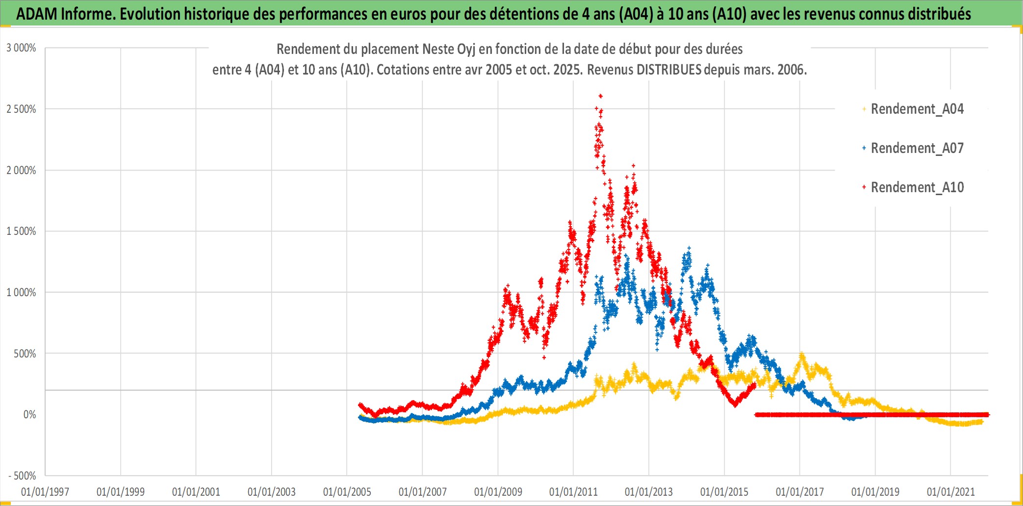 Site dédié aux investisseursPage dédiée sur site financeAnalyse des valorisations hebdomadaires de l'action Neste Oyj. Cet actif est cote en EUR. Les valorisations couvrent les semaines 2005W16 a 2025W44. Les revenus de cet actif financier sont pris en compte depuis la semaine 2006W12. La note globale ESG de cet actif est estimee a 10.0 (apres rebasage entre 0 et 20).