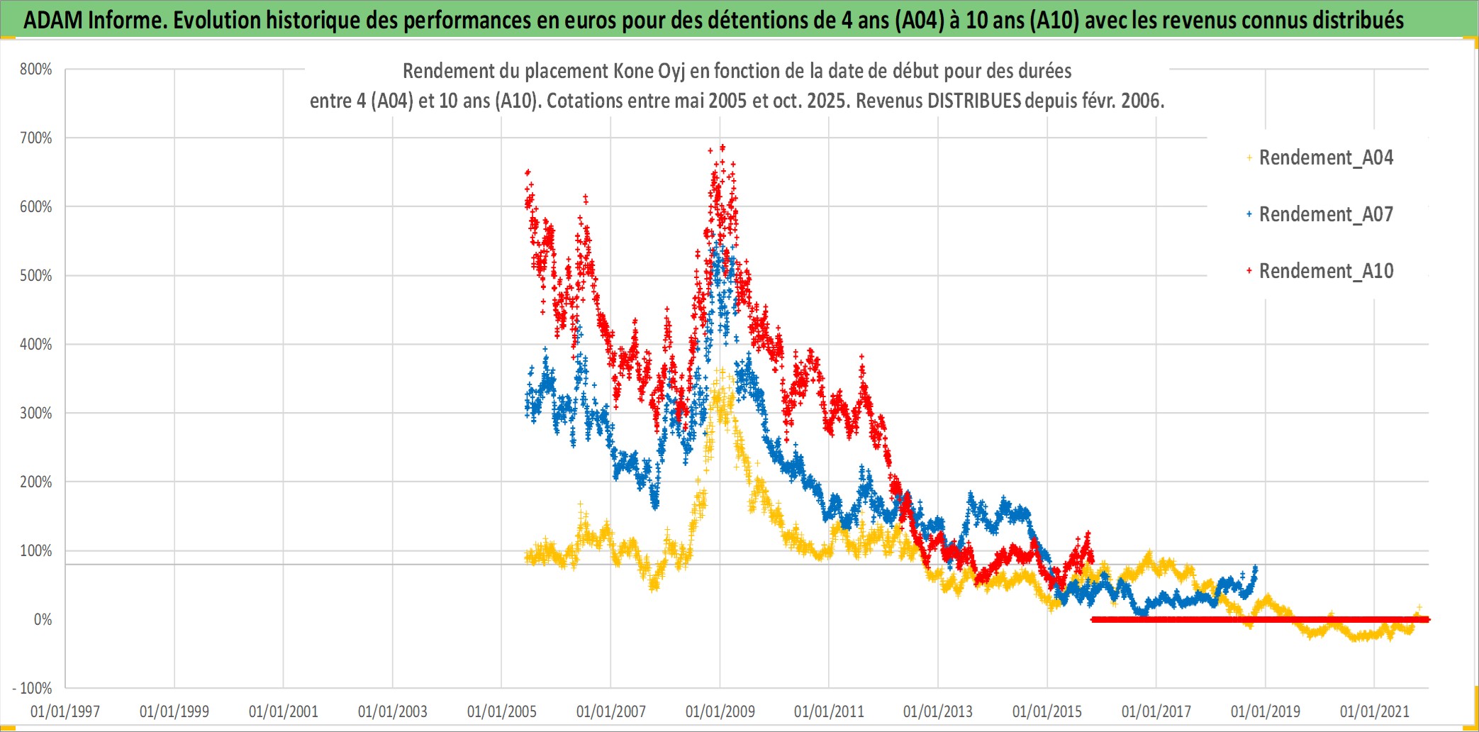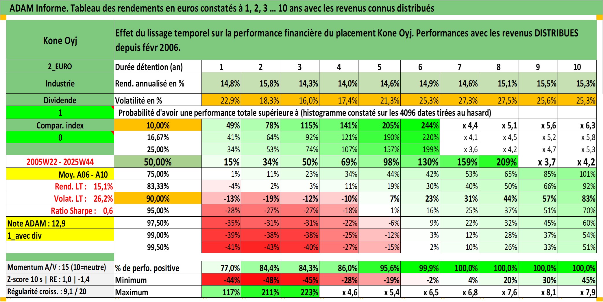 Site dédié aux investisseursPage dédiée sur site financeAnalyse des valorisations hebdomadaires de l'action Kone Oyj. Cet actif est cote en EUR. Les valorisations couvrent les semaines 2005W22 a 2025W44. Les revenus de cet actif financier sont pris en compte depuis la semaine 2006W09. La note globale ESG de cet actif est estimee a 11.0 (apres rebasage entre 0 et 20).