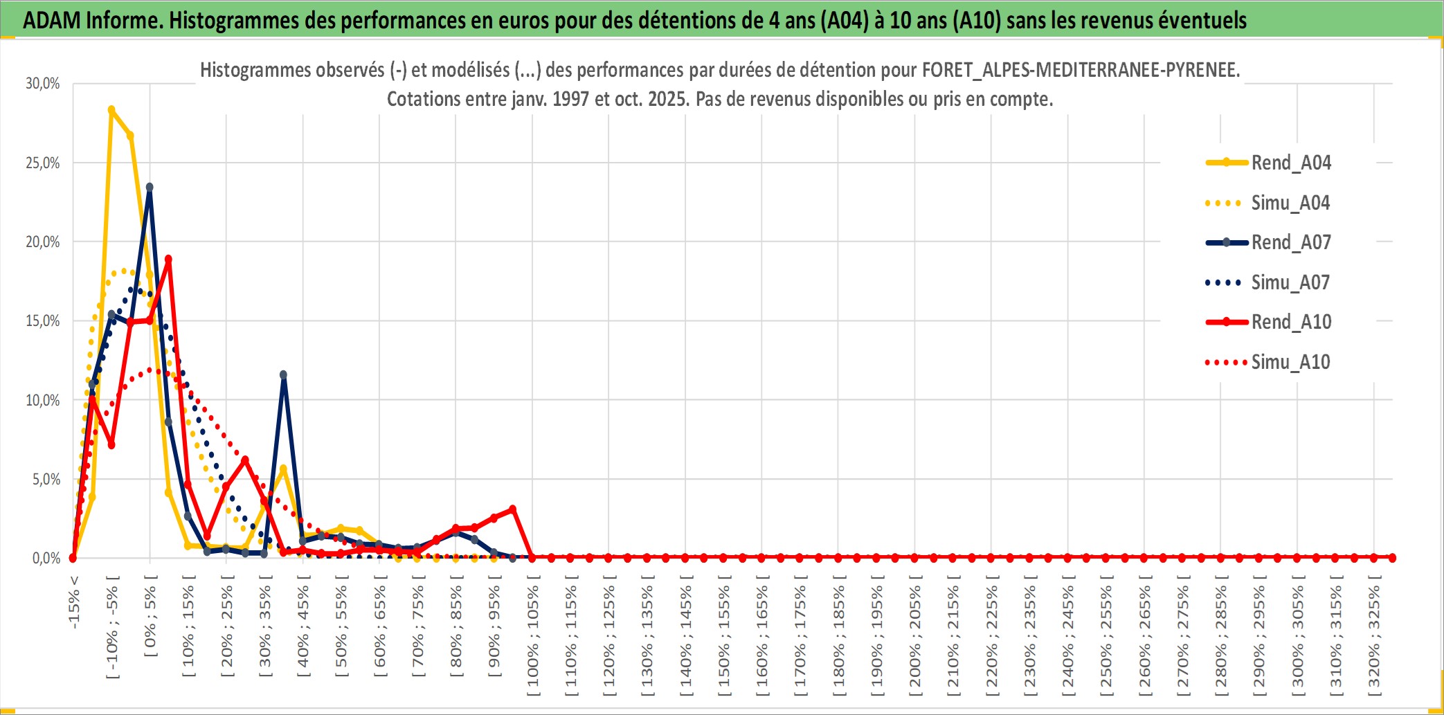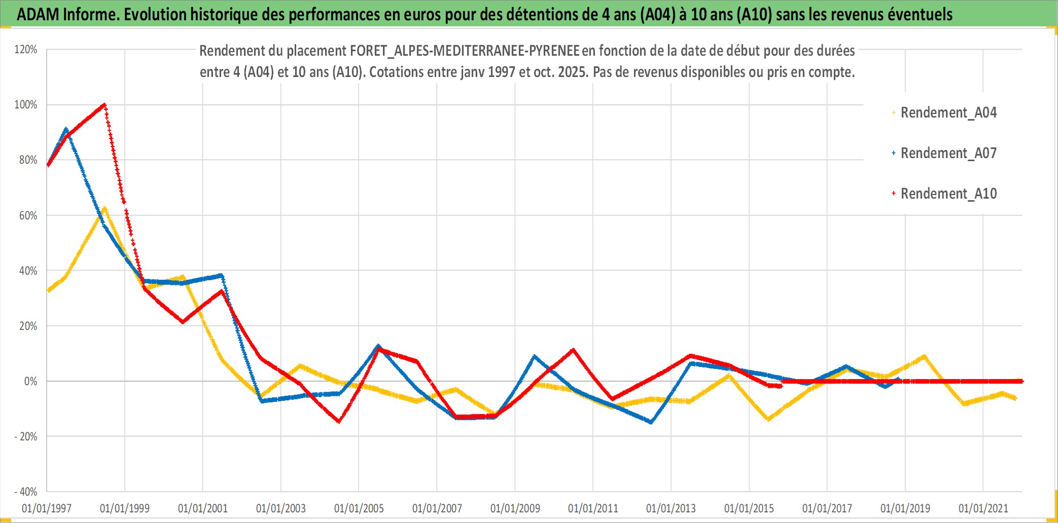Site dédié aux investisseursPage dédiée sur site financeAnalyse des valorisations hebdomadaires de l'actif FORET_ALPES-MEDITERRANEE-PYRENEE. Cet actif est cote en EUR. Les valorisations couvrent les semaines 1997W01 a 2025W44. Les fermages de ce bien foncier sont pris egaux a 2,5% annuels de la valeur venale du bien.