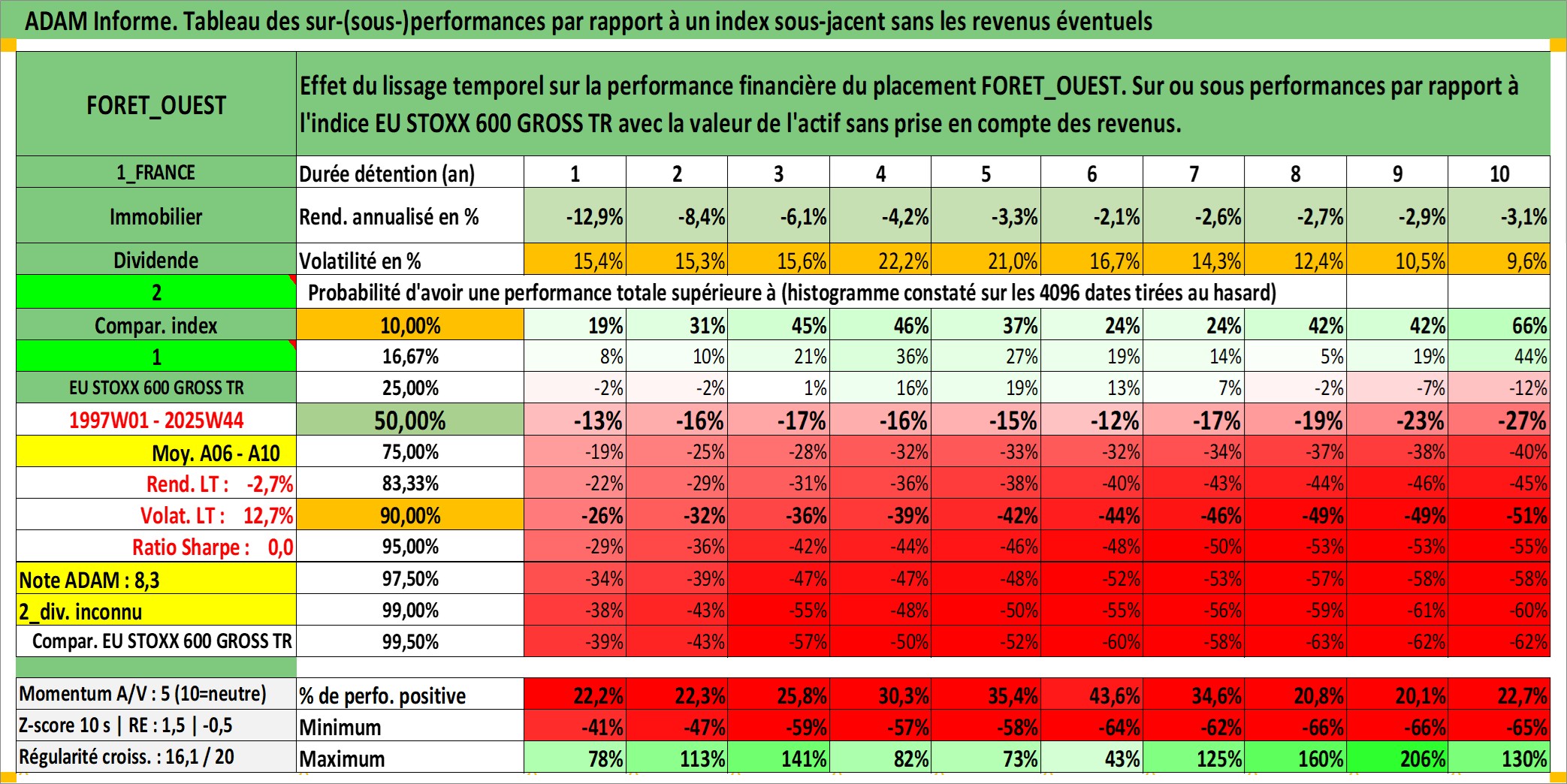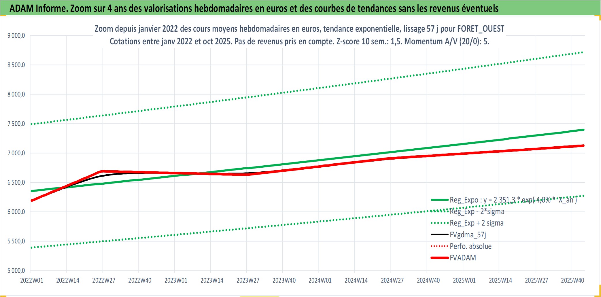 Site dédié aux investisseursPage dédiée sur site financeAnalyse des valorisations hebdomadaires de l'actif FORET_OUEST. Cet actif est cote en EUR. Les valorisations couvrent les semaines 1997W01 a 2025W44. Les fermages de ce bien foncier sont pris egaux a 2,5% annuels de la valeur venale du bien.