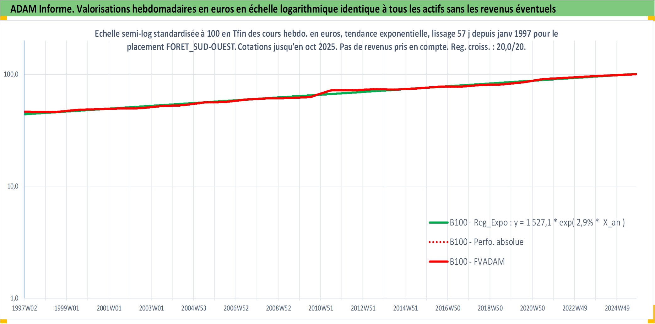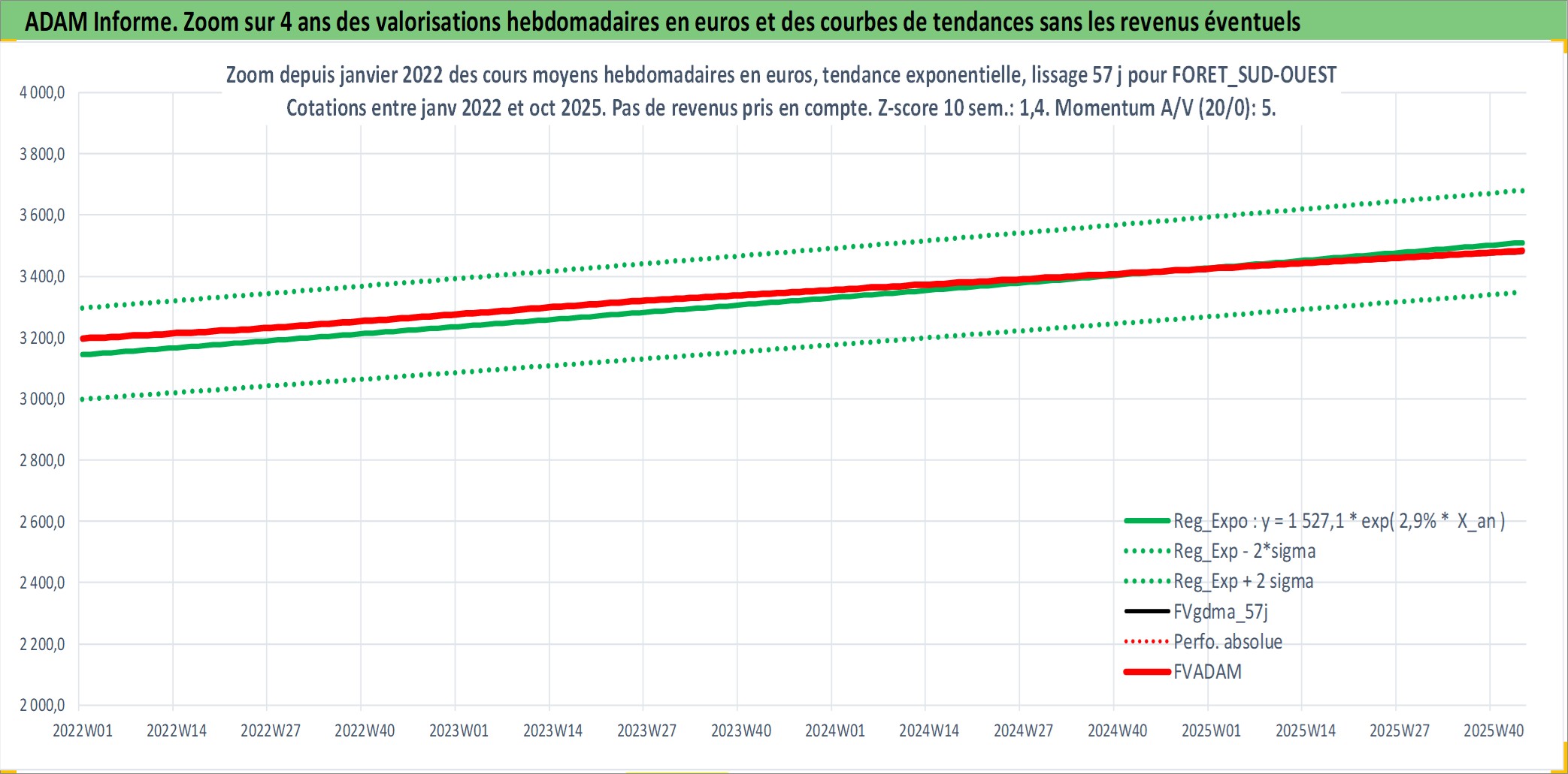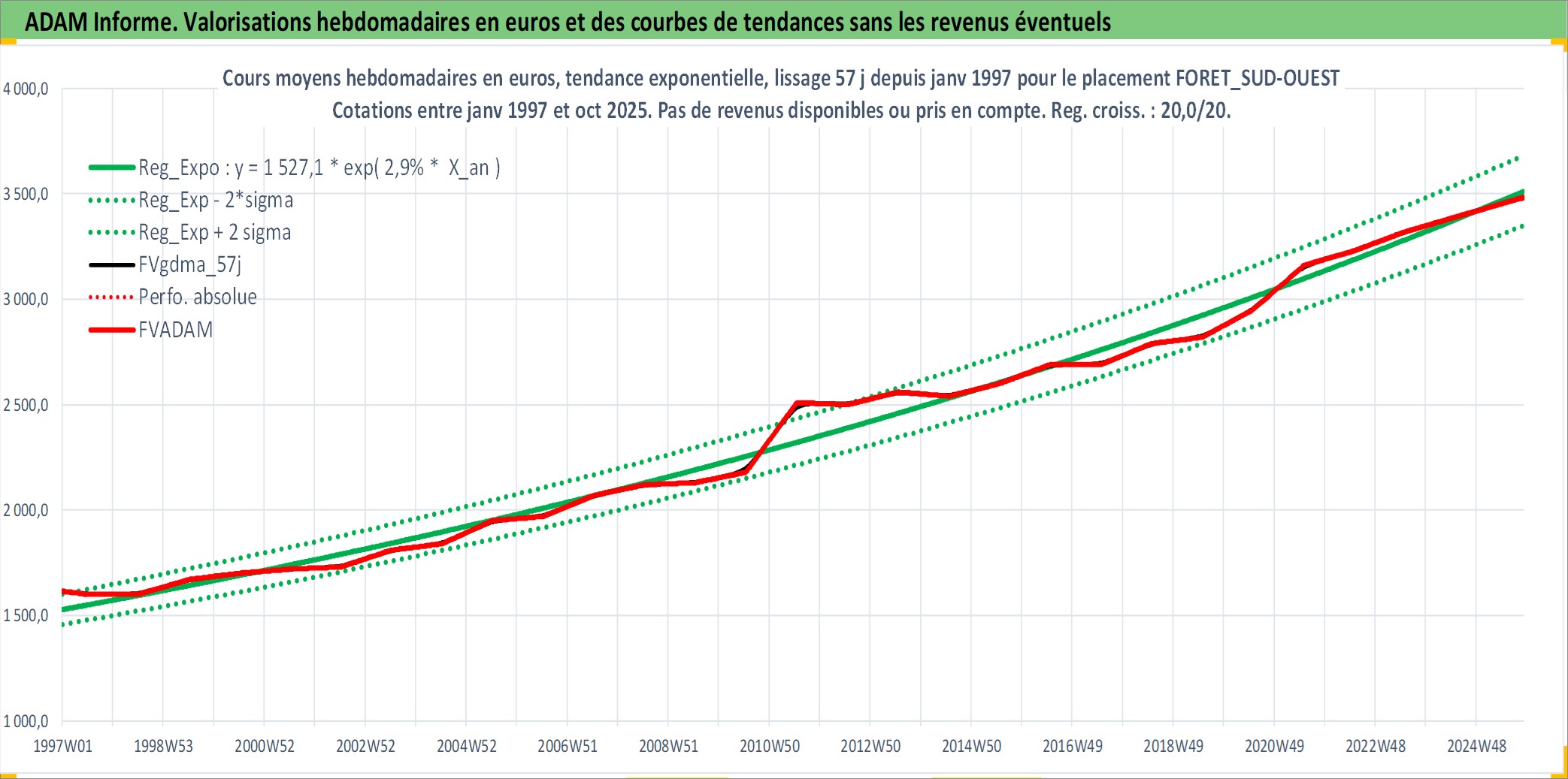 Site dédié aux investisseursPage dédiée sur site financeAnalyse des valorisations hebdomadaires de l'actif FORET_SUD-OUEST. Cet actif est cote en EUR. Les valorisations couvrent les semaines 1997W01 a 2025W44. Les fermages de ce bien foncier sont pris egaux a 2,5% annuels de la valeur venale du bien.