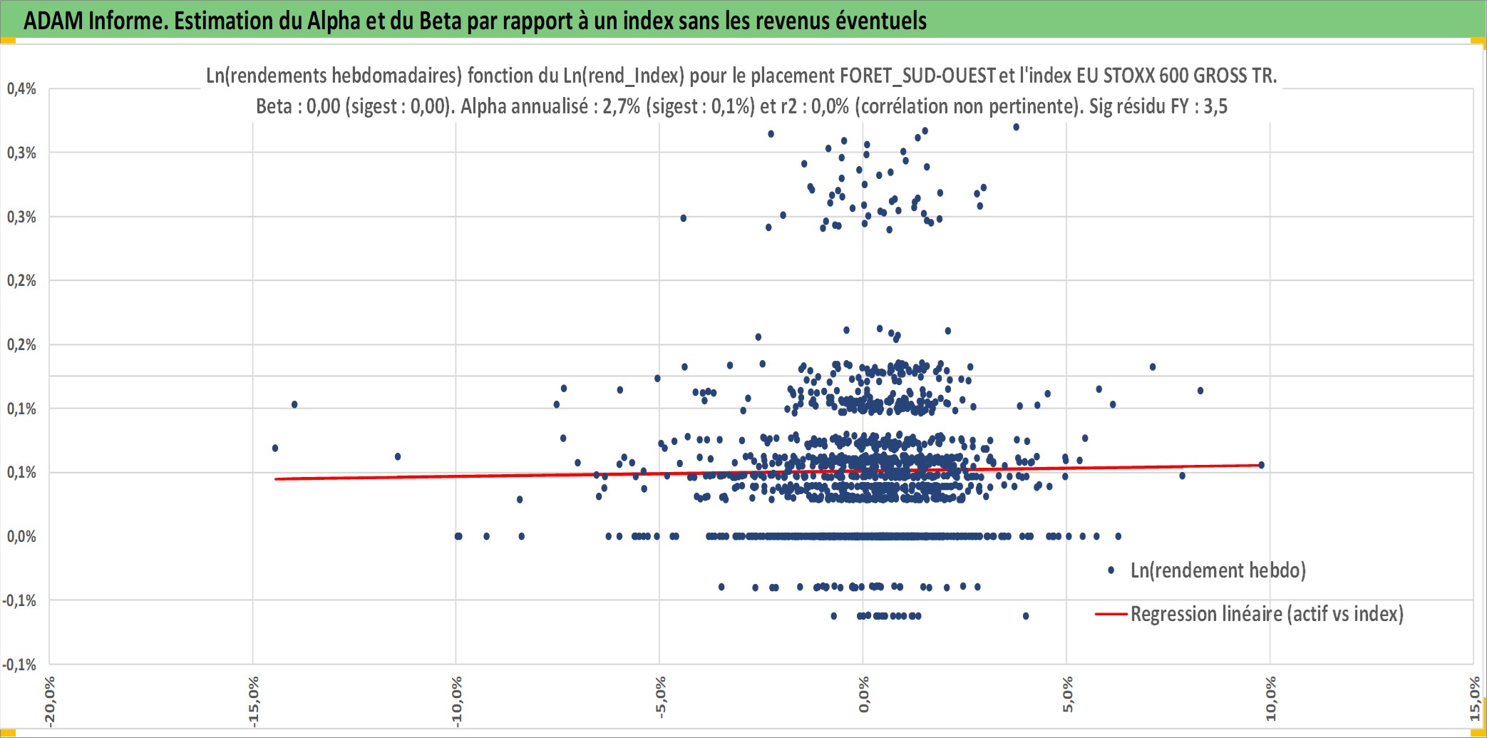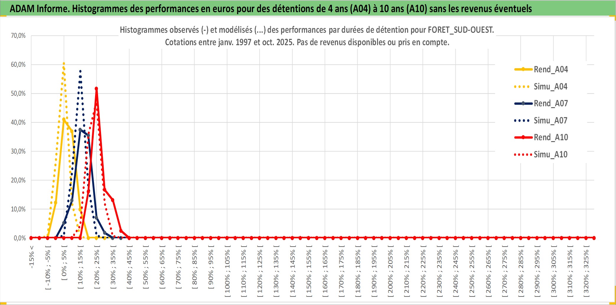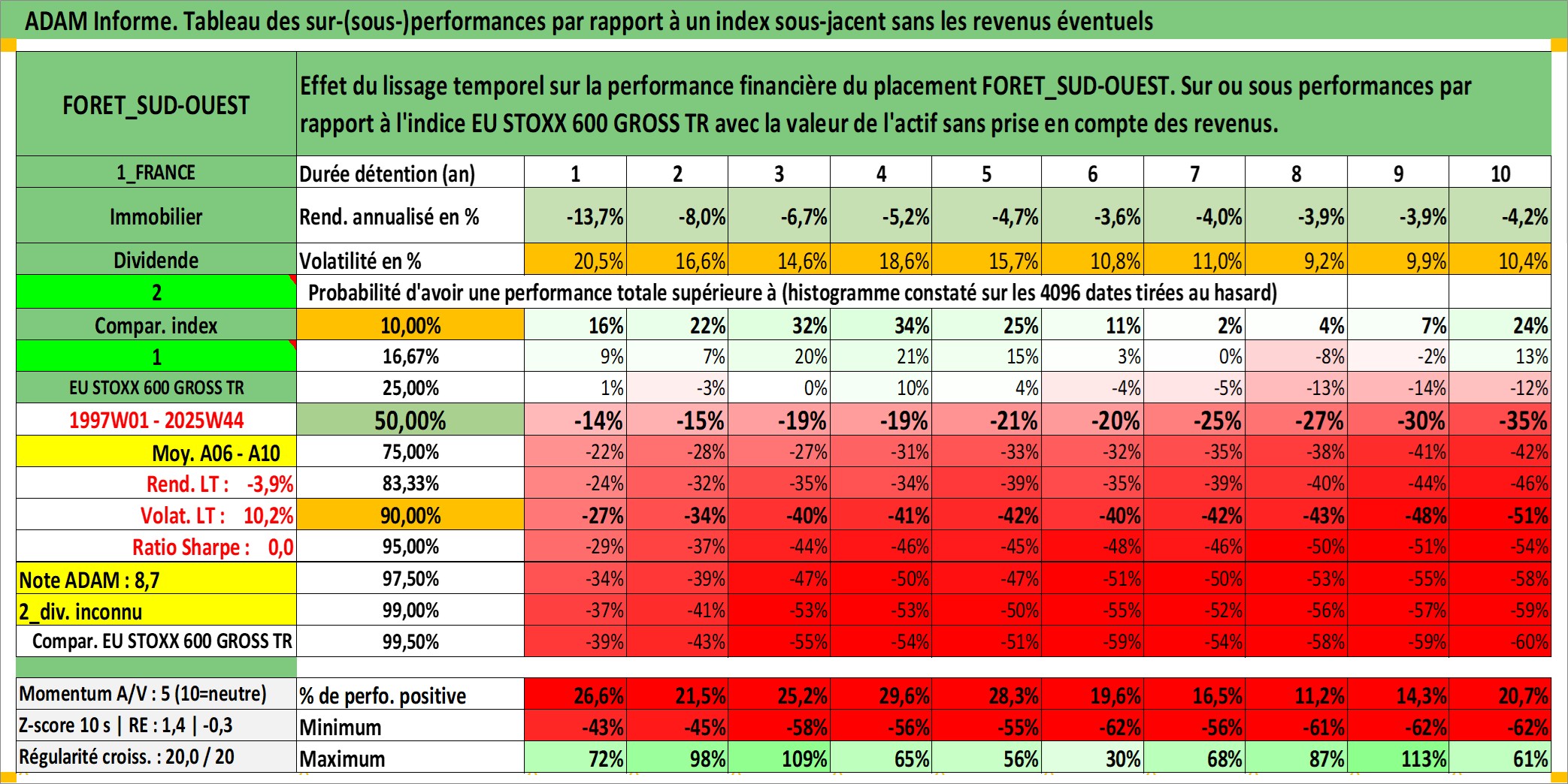 Site dédié aux investisseursPage dédiée sur site financeAnalyse des valorisations hebdomadaires de l'actif FORET_SUD-OUEST. Cet actif est cote en EUR. Les valorisations couvrent les semaines 1997W01 a 2025W44. Les fermages de ce bien foncier sont pris egaux a 2,5% annuels de la valeur venale du bien.