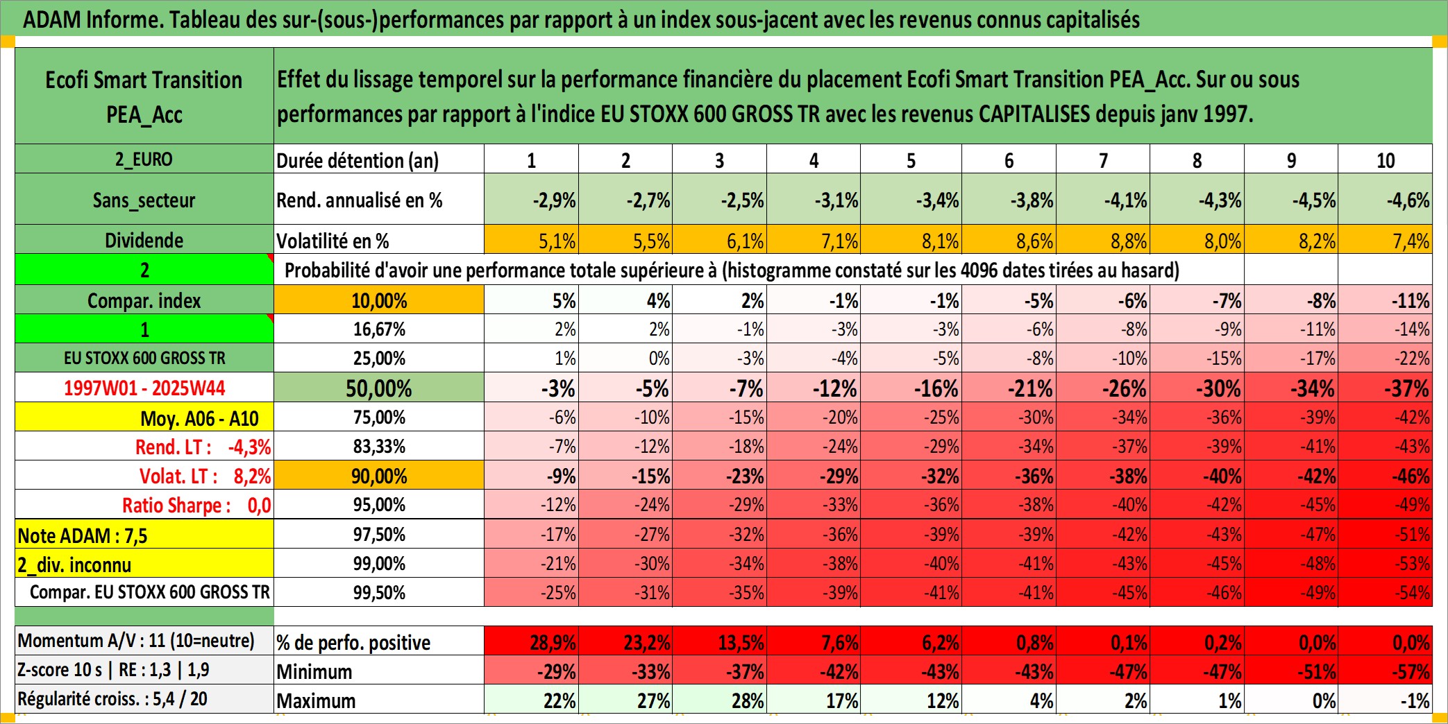 Site dédié aux investisseursPage dédiée sur site financeAnalyse des valorisations hebdomadaires du fonds Ecofi Smart Transition PEA_Acc. Cet actif est cote en EUR. Les valorisations couvrent les semaines 1997W01 a 2025W44. Les revenus de cet actif financier sont pris en compte depuis la semaine 1997W01. La note ESG de cet actif n'est pas connue.
