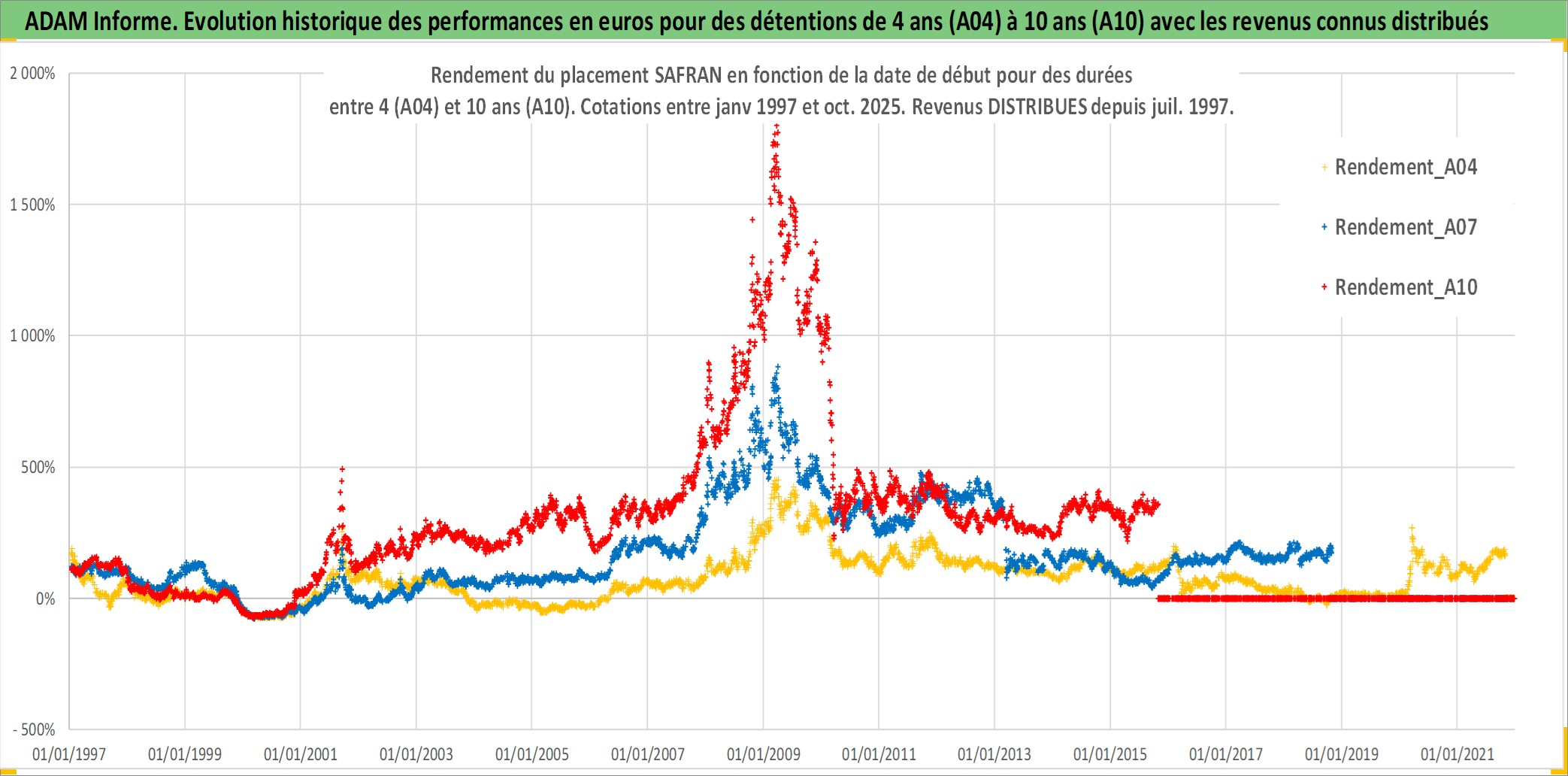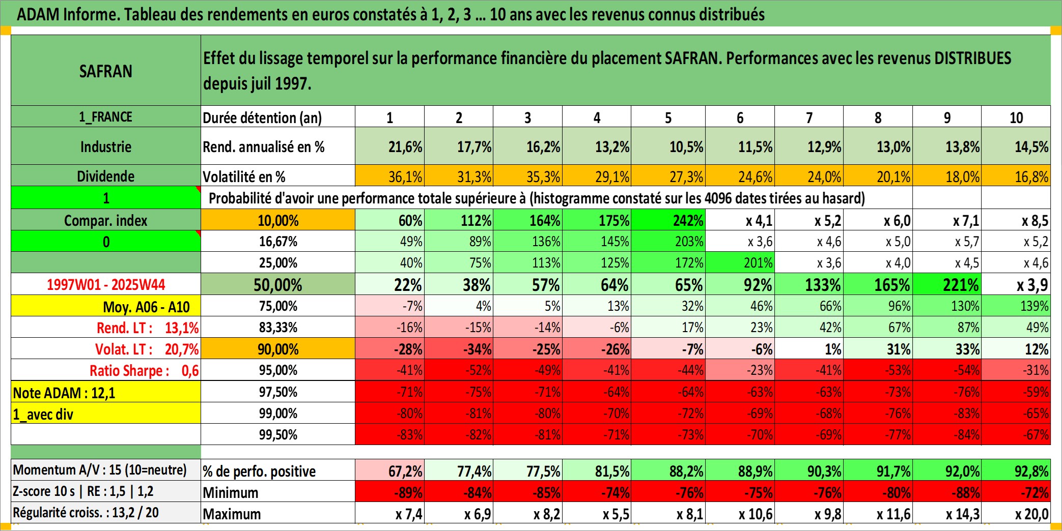 Site dédié aux investisseursPage dédiée sur site financeAnalyse des valorisations hebdomadaires de l'action SAFRAN. Cet actif est cote en EUR. Les valorisations couvrent les semaines 1997W01 a 2025W44. Les revenus de cet actif financier sont pris en compte depuis la semaine 1997W28. La note globale ESG de cet actif est estimee a 9.0 (apres rebasage entre 0 et 20).